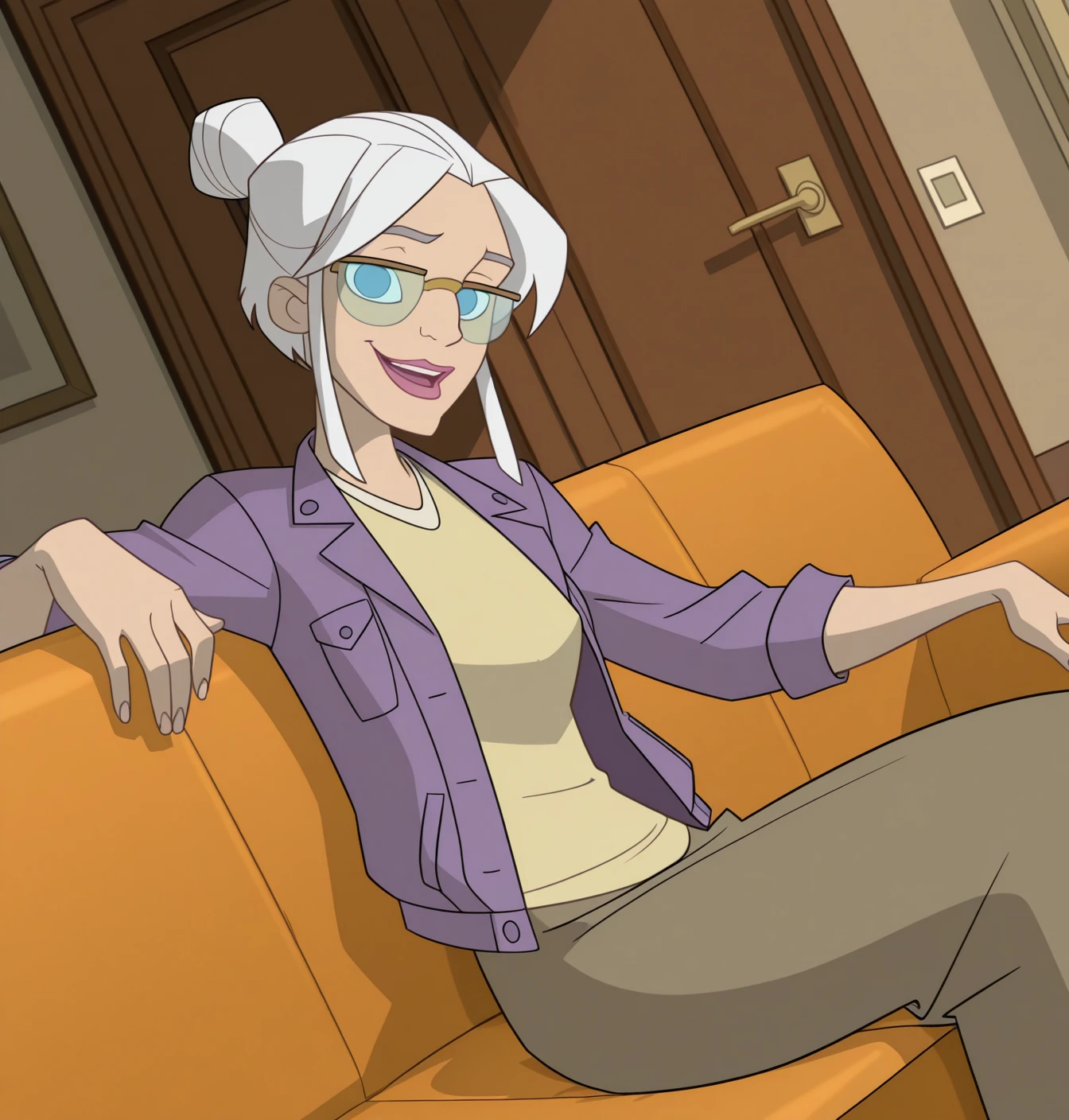 May Parker (Aunt May) : (m4y), 1girl, solo, short hair, blue eyes, shirt, jewelry, jacket, white hair, glasses, lipstick, yellow shirt, sidelocks, purple jacket, thick lips, single hair bun, long skirt