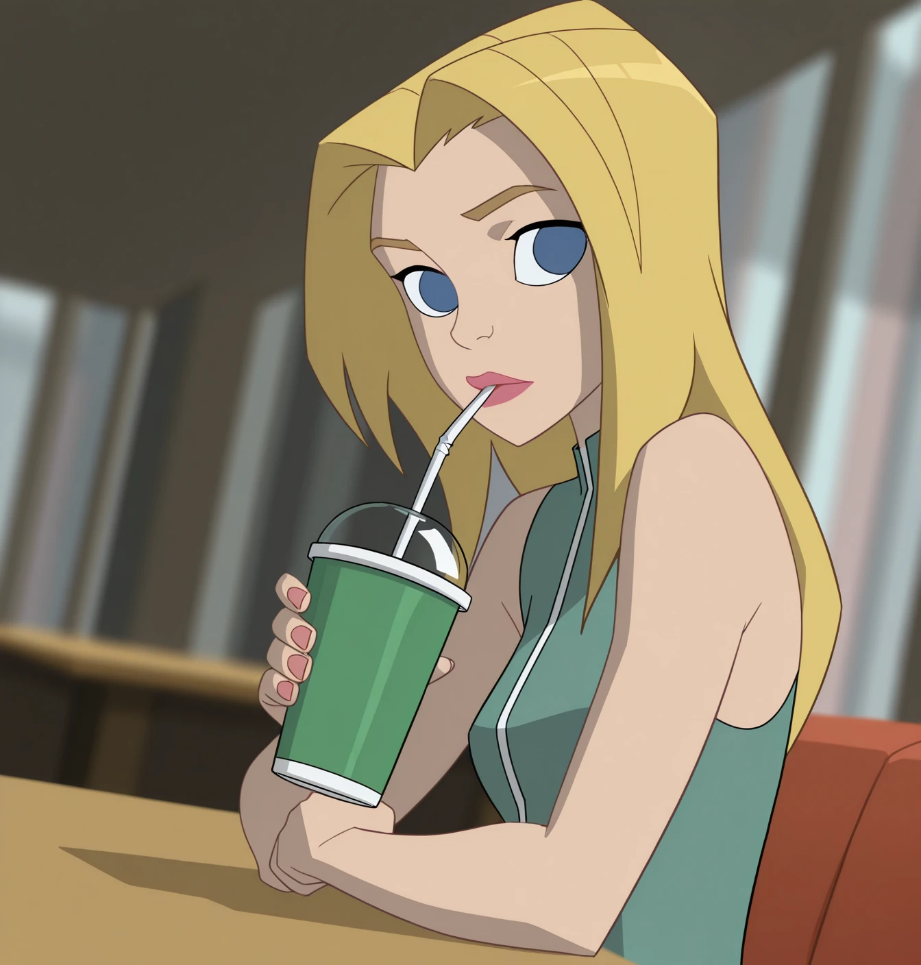 Sally Avril: s4lly, 1girl, solo, small breasts, no pupils, long hair, blue eyes, blonde hair, sleeveless, lips, lipstick, bare shoulders, white shirt, green shirt