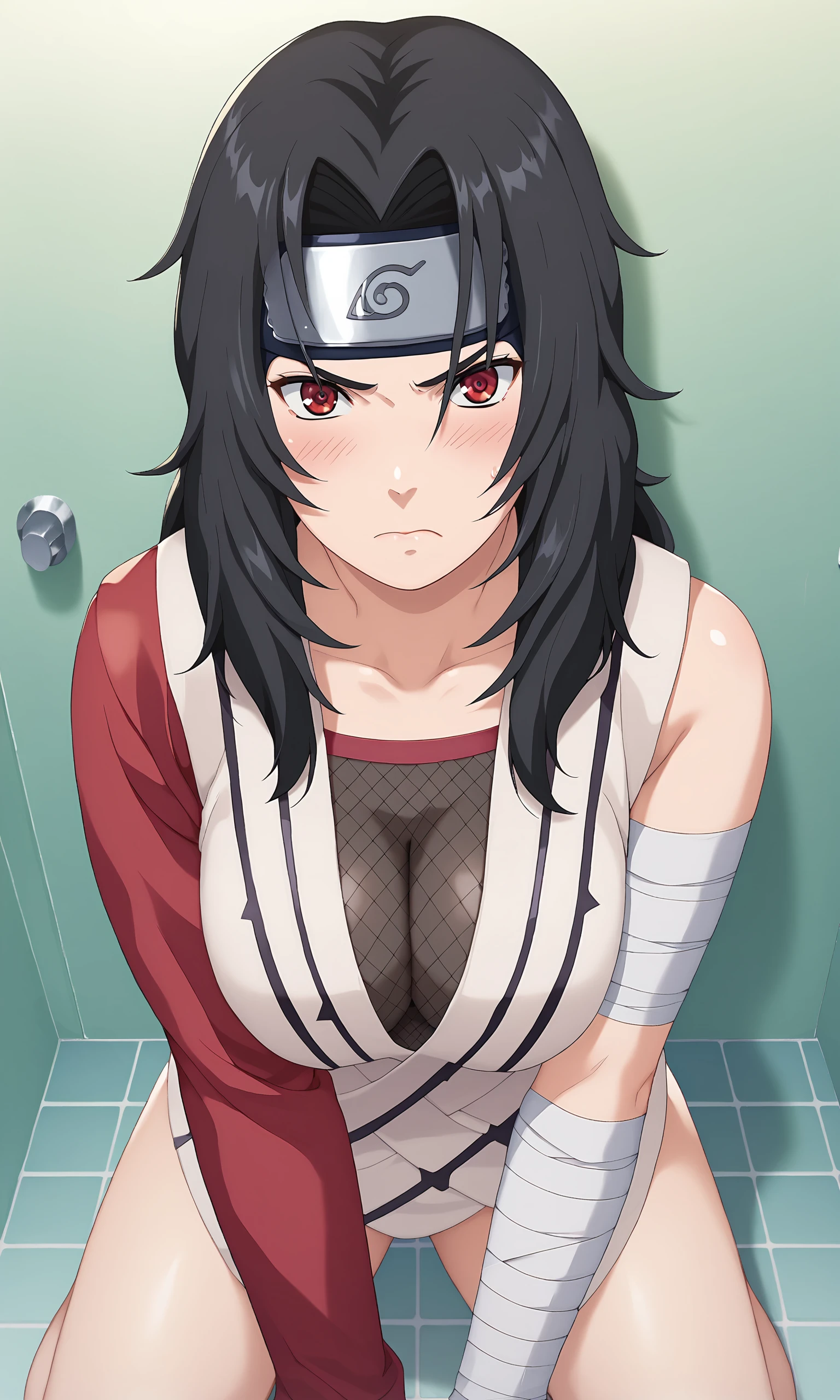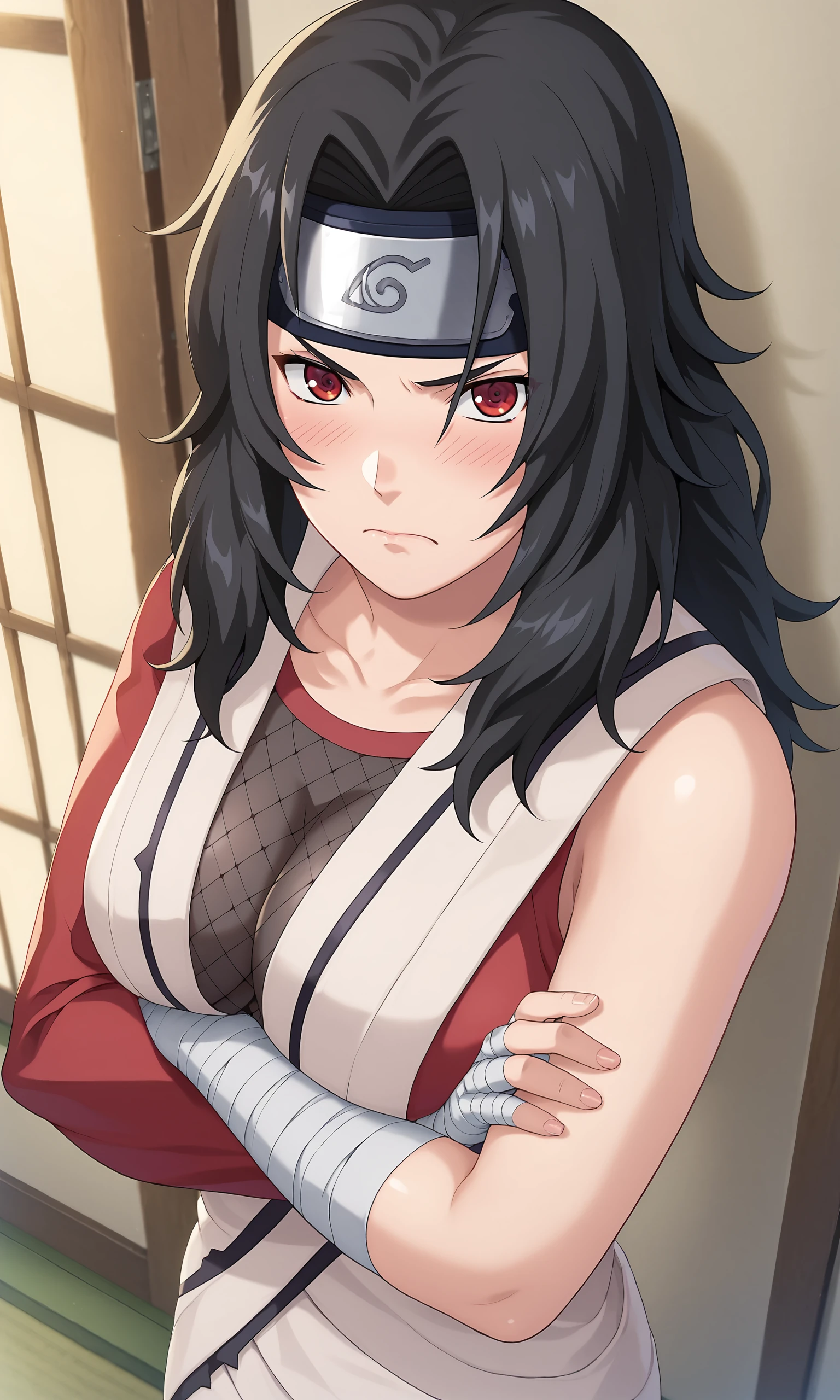 kurenaiyūhi, 1girl, looking at viewer, black hair, red eyes, bandaged body, bandaged arms, fishnet shirt, single sleeve, red sleeve, forehead protector, long hair, konohagakure symbol, parted bangs, lipstick,