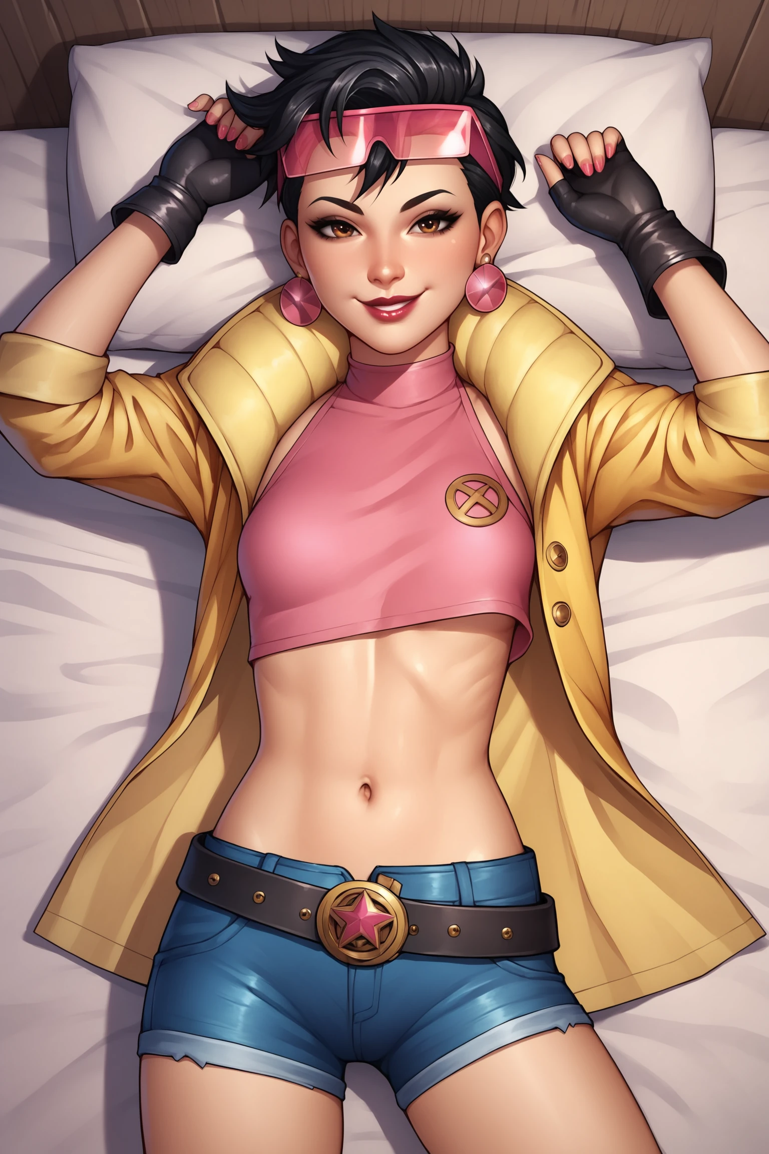 ā JubileeXMXL, lipstick, brown eyes, black hair, short hair, eyewear on head, earrings, small breasts, yellow jacket, pink crop top, symbol print, navel, black gloves, single fingerless gloves, short shorts, denim shorts, belt, blue boots