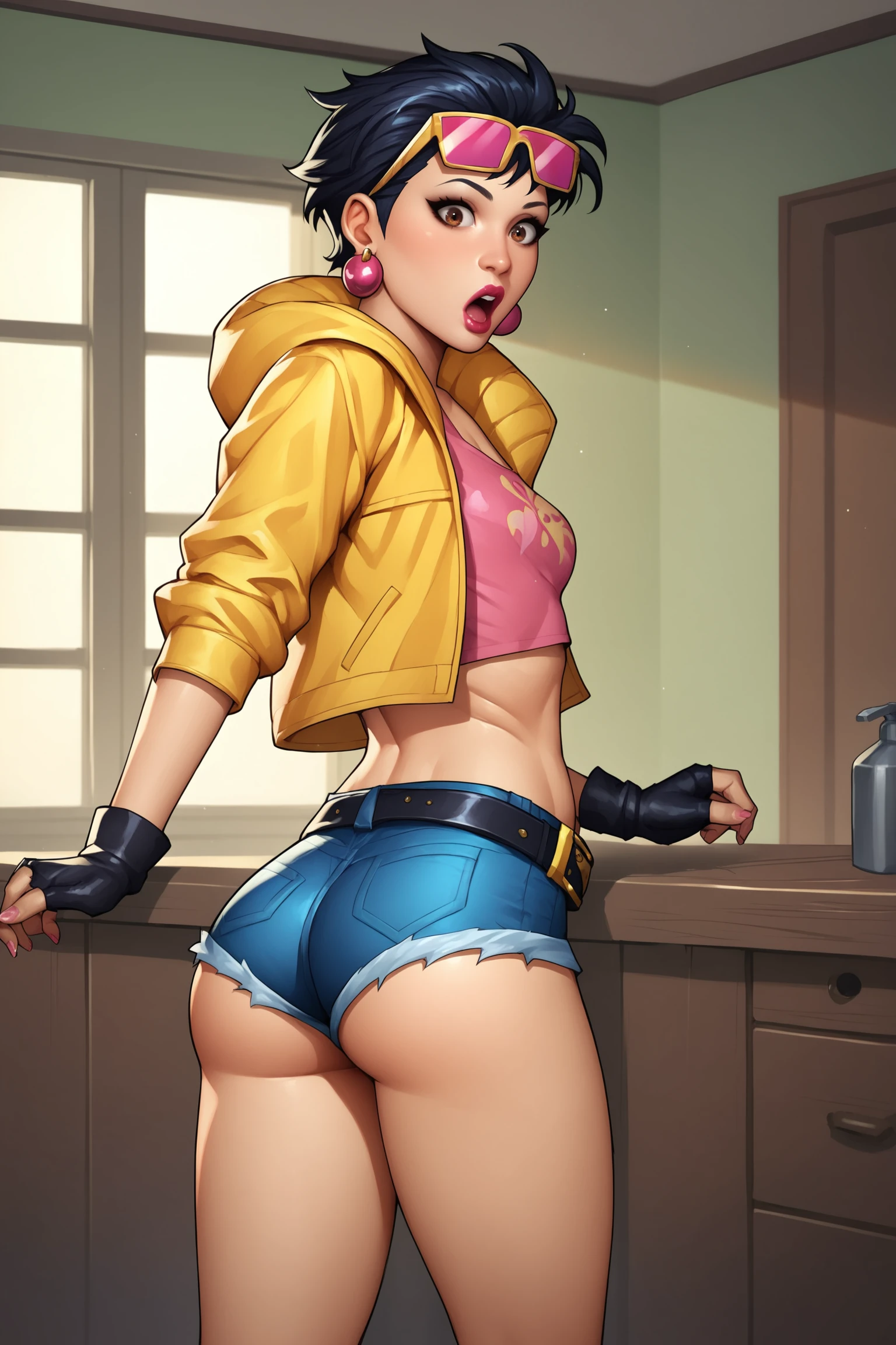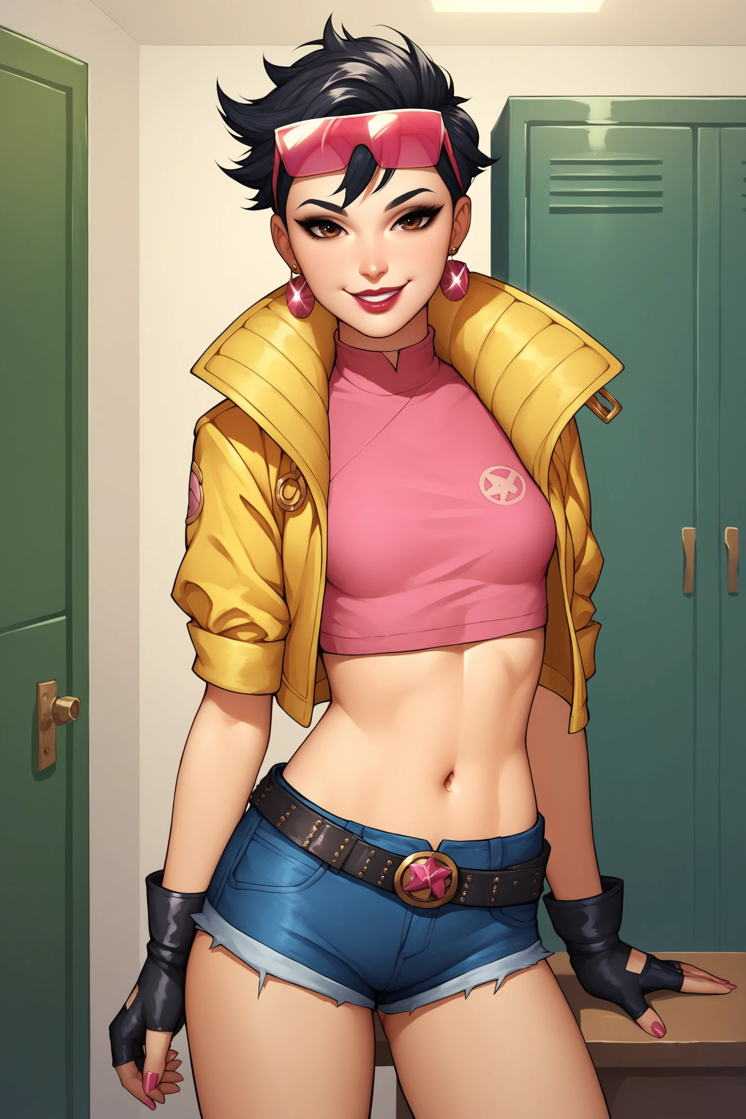 JubileeXMXL, lipstick, brown eyes, black hair, short hair, eyewear on head, earrings, small breasts, yellow jacket, pink crop top, symbol print, navel, black gloves, single fingerless gloves, short shorts, denim shorts, belt, blue boots
