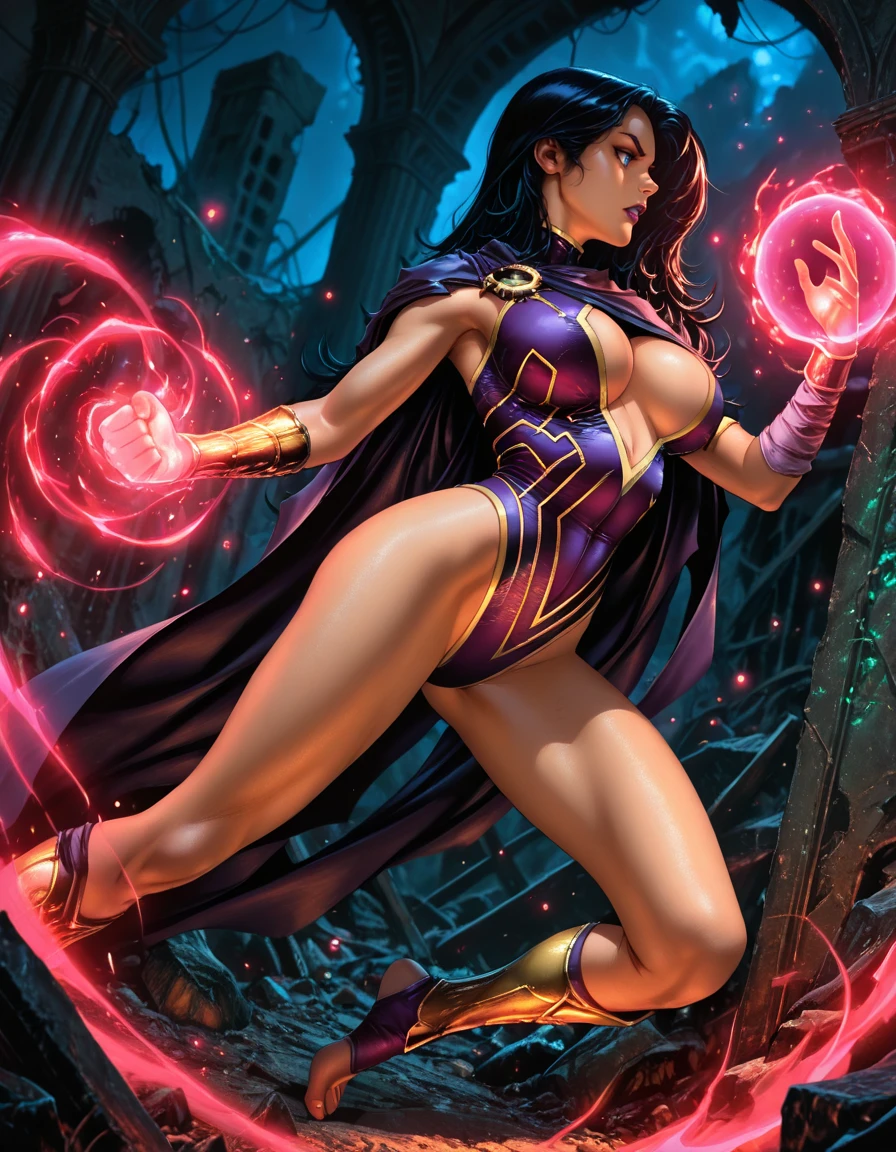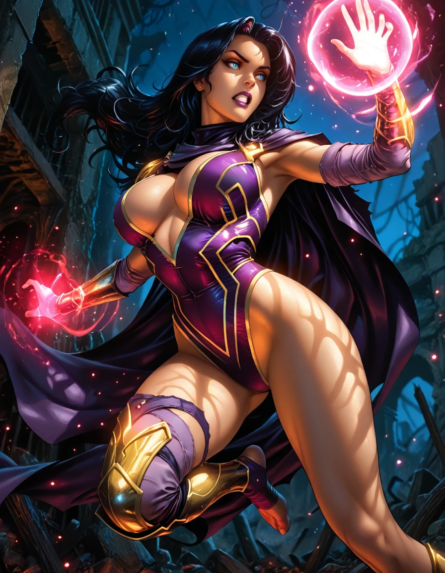cape purple leotard revealing clothes asymmetrical legwear toeless legwear armor greaves