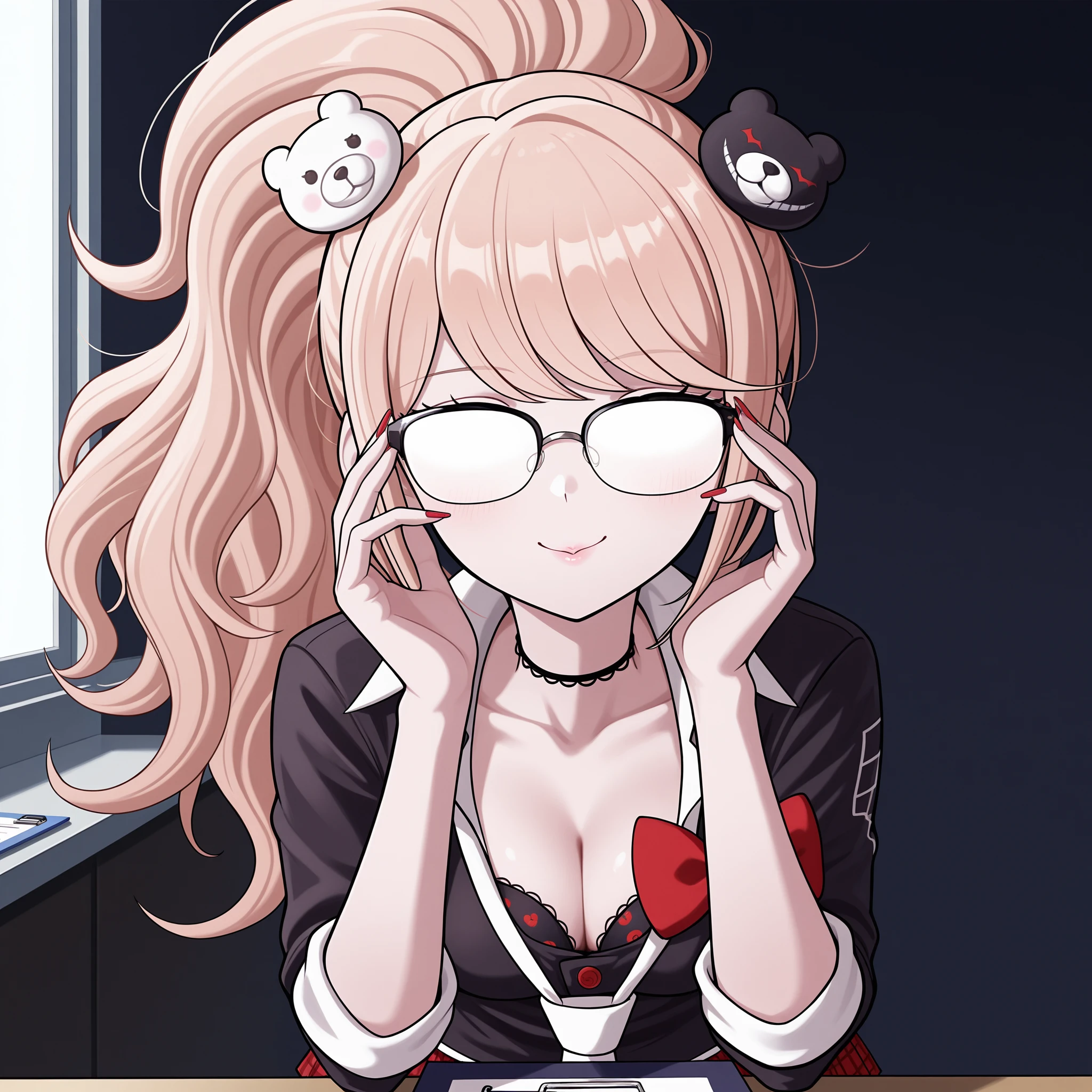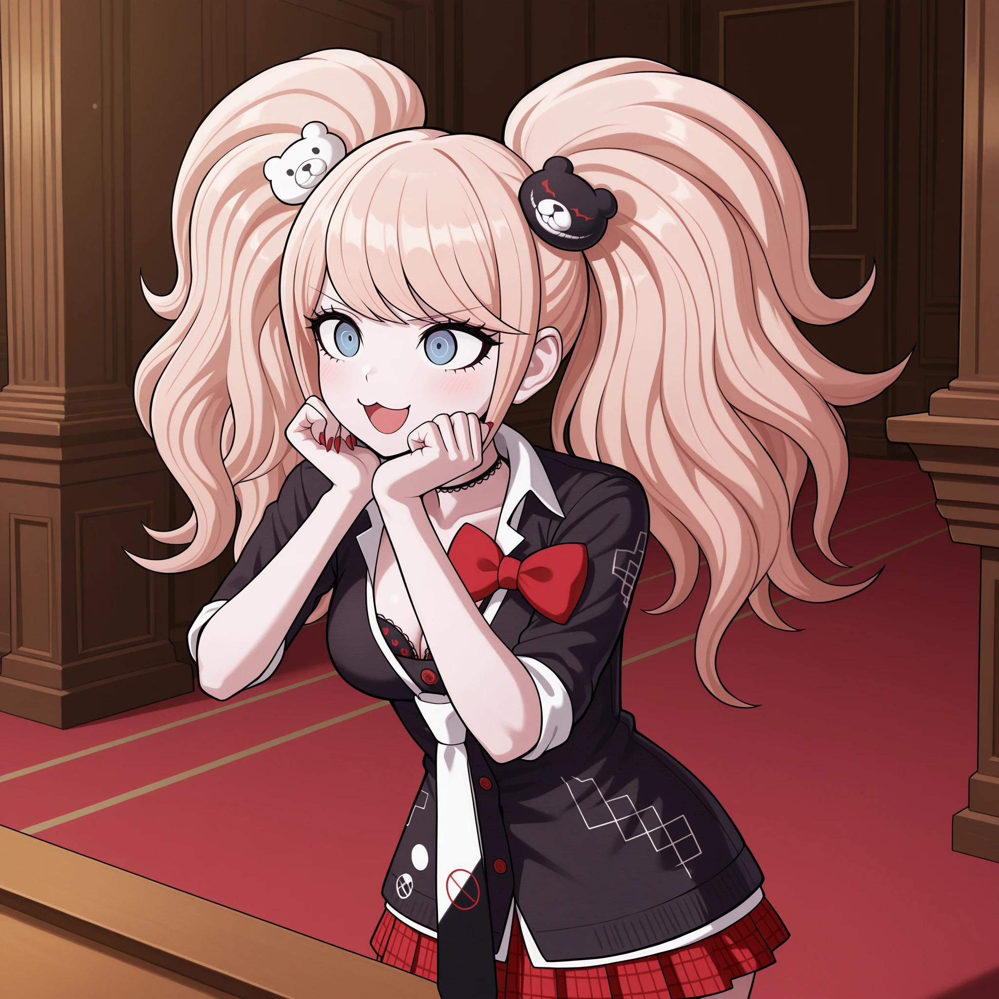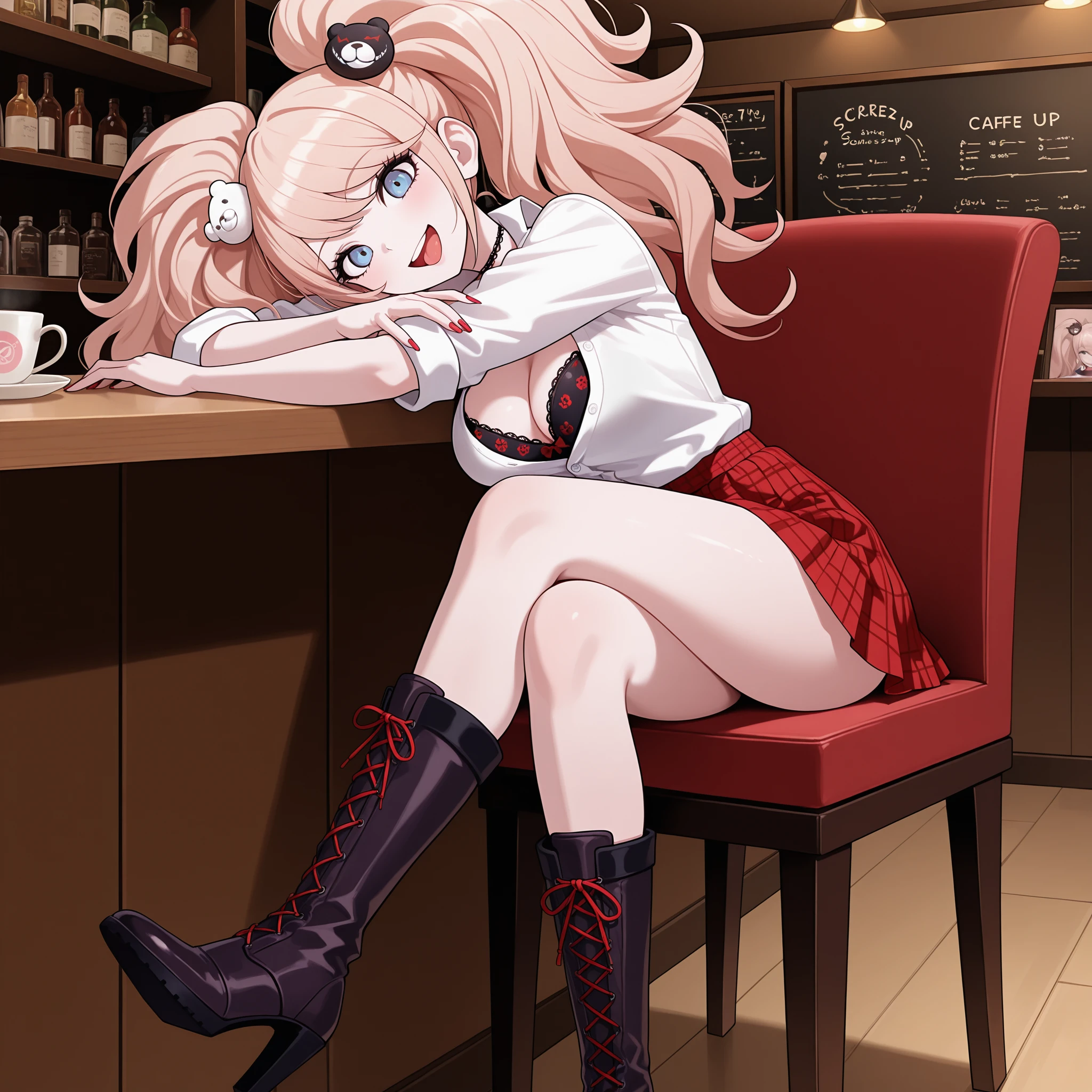 Original Outfit: jundang, enoshima junko, twintails, blonde hair, long hair, messy hair, blue eyes, bear hair ornament, black frilled choker, two-tone necktie, white necktie, black necktie, print necktie, loose necktie, black frilled bra, print bra, white dress shirt, black cardigan, sleeves rolled up, red bow, red nails, red pleated skirt, plaid skirt, black & red high heel boots