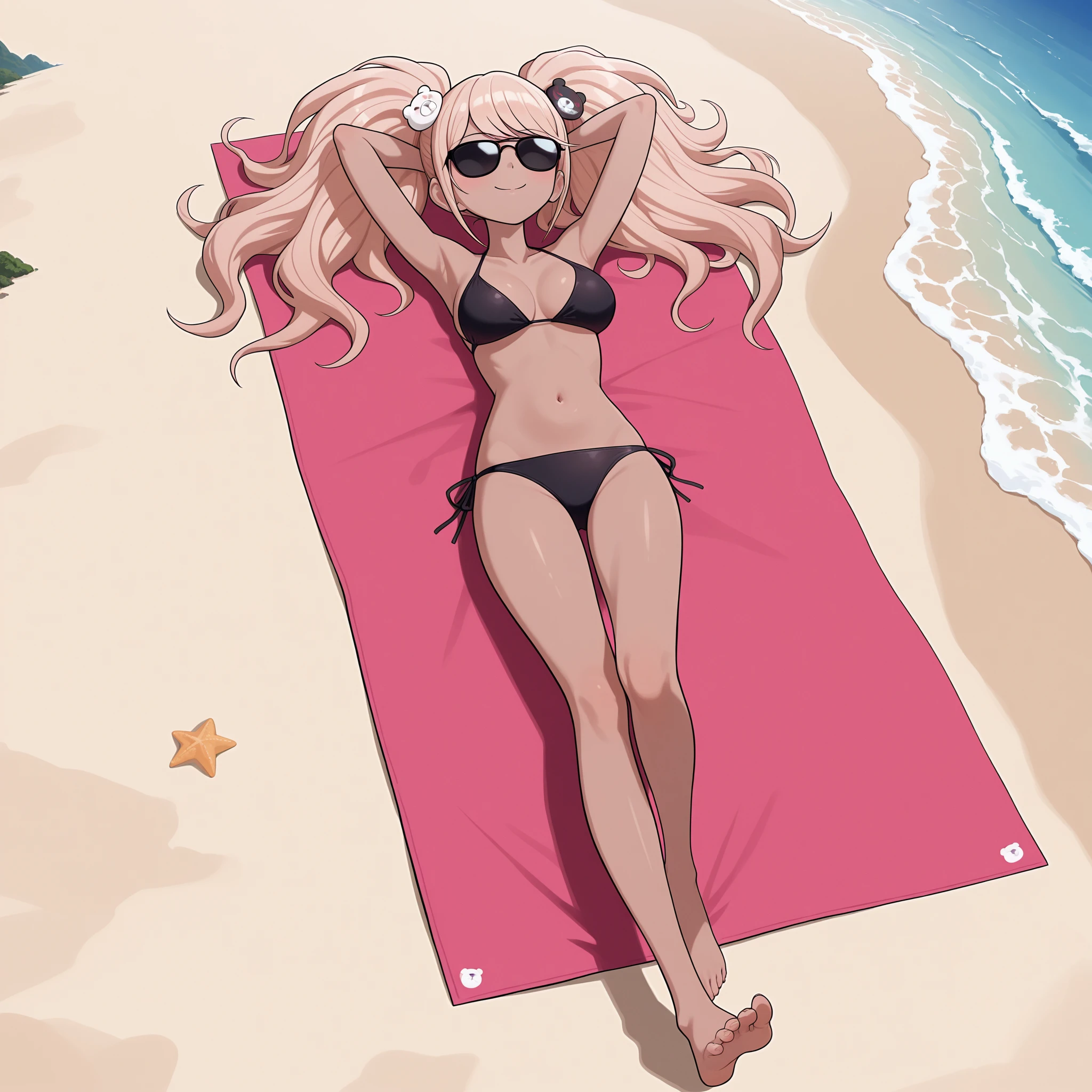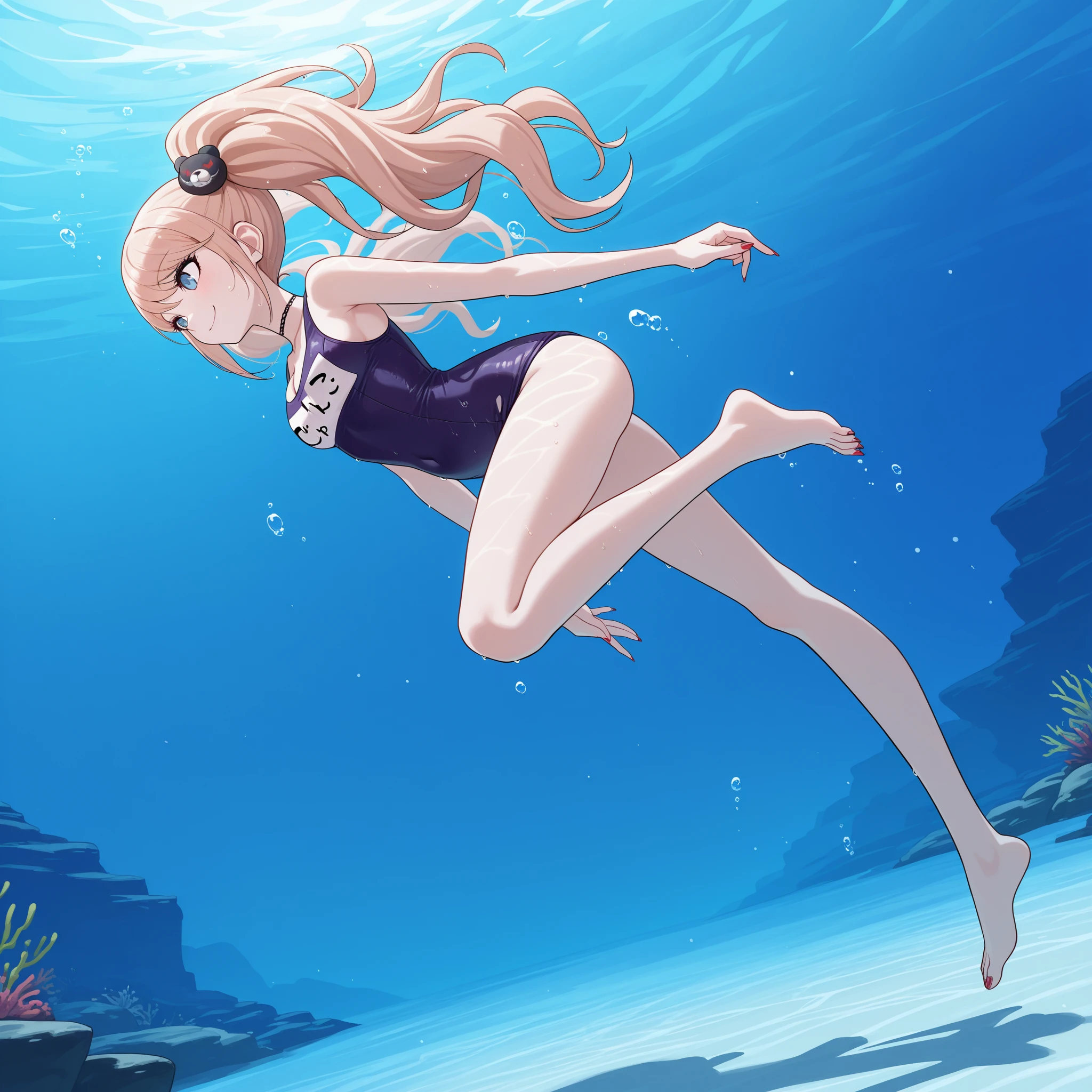 Swimsuit: jundang, enoshima junko, twintails, blonde hair, long hair, blue eyes, bear hair ornament, black frilled choker, purple old school swimsuit