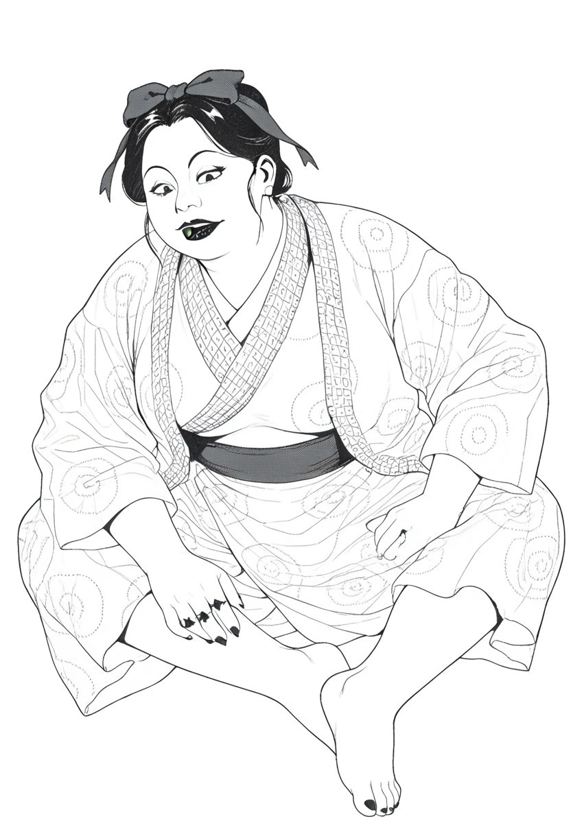 Thick woman, white skin, straight bun hair, red lipstick, black eyes, thick long black eyelashes, micro bikini, patern kimono, red hair bow, long red nails, rings jewelry,