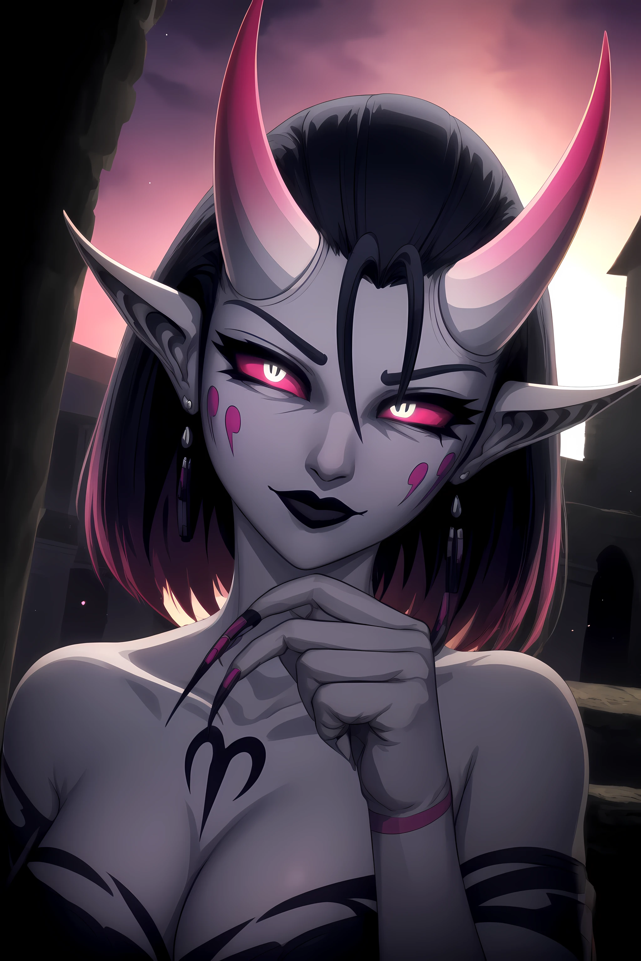 • Character - herzha, pink eyes, slit pupils, black lips, grin, sharp teeth, purple skin, horns