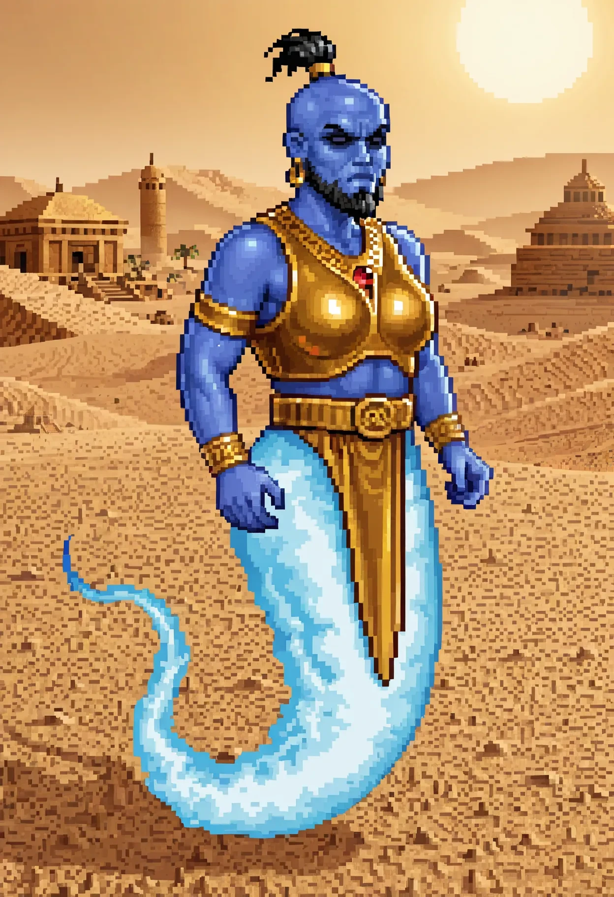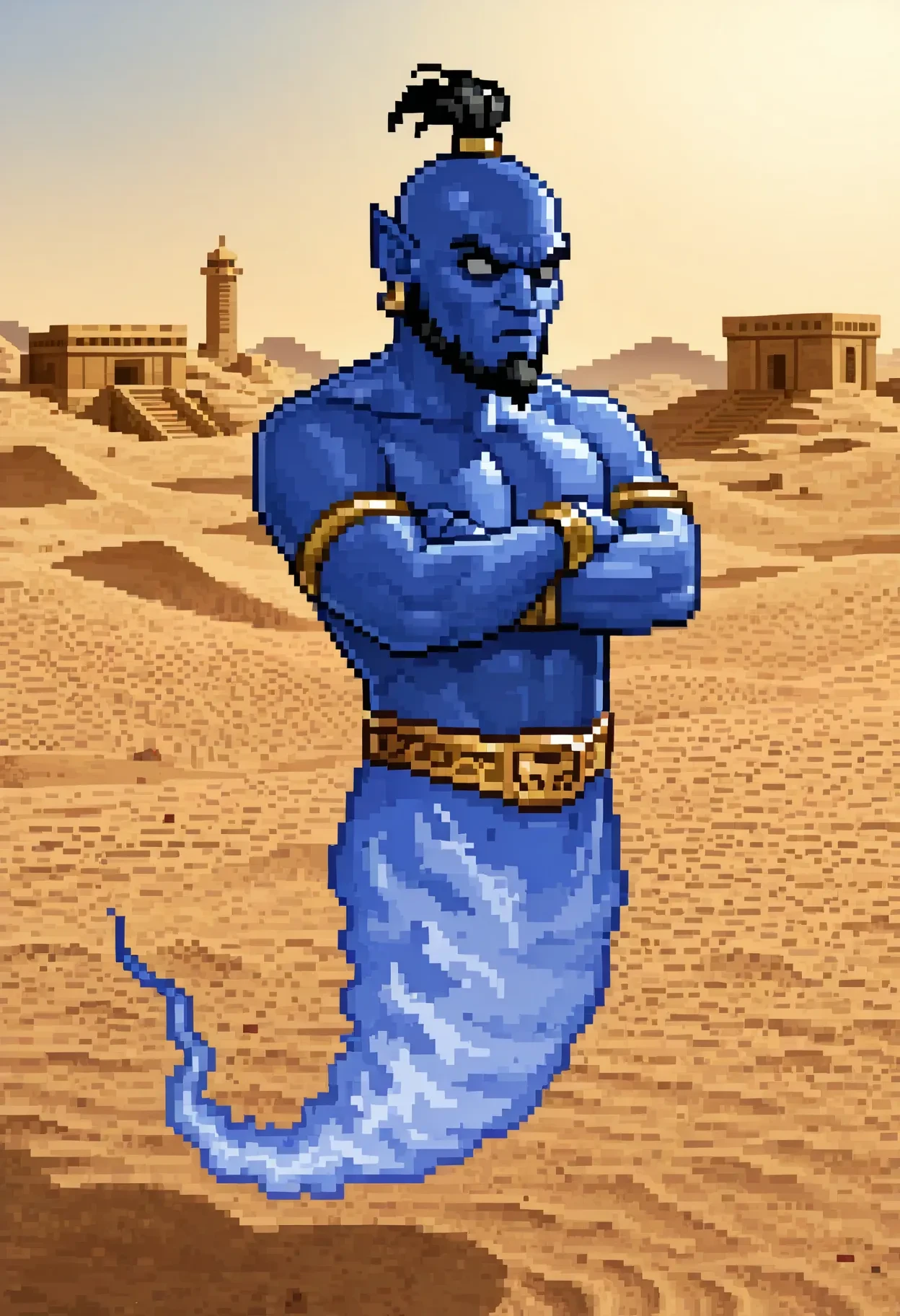 Genie (tail doesn't work well): heroes2, pixel art, from front, three-quarter view, full body, genie, 1boy, male, solo, ???????, gold belt, gold armbands, gold bracelets, gold earrings, solo, (genie tail:1.5), blue skin, black topknot, pointed beard, small beard, shaded eyes, arms crossed, legless