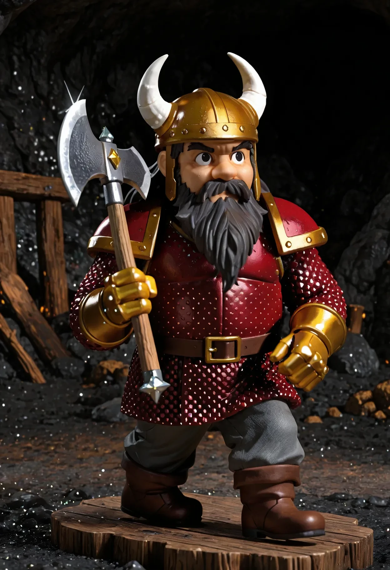 Dwarf: heroes2, pixel art, from side, three-quarter view, full body, dwarf, male, red armor, chainmail, gold helmet, white horns, brown boots, leather boots, grey pants, axe, holding weapon, brown beard, long beard, long hair, black eyes, short, grey hair, walking, feet apart, 1boy, solo, yellow gloves, yellow gauntlets,