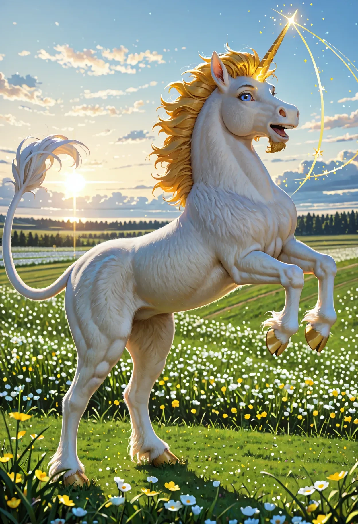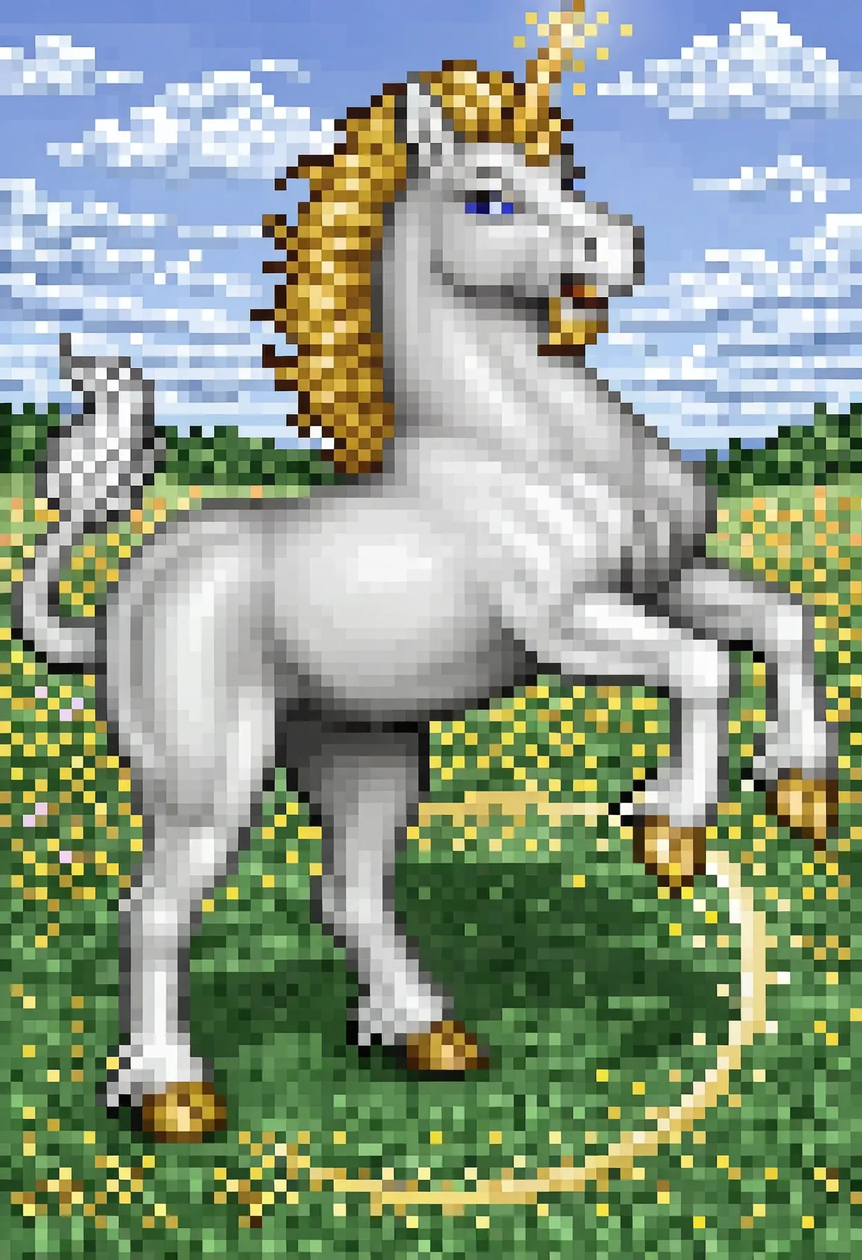 Unicorn: heroes2, pixel art, from side, unicorn, white fur, yellow mane, tufted tail, yellow tuft, white tail, yellow hooves, blue eyes, standing, full body, solo, yellow beard, orange horn