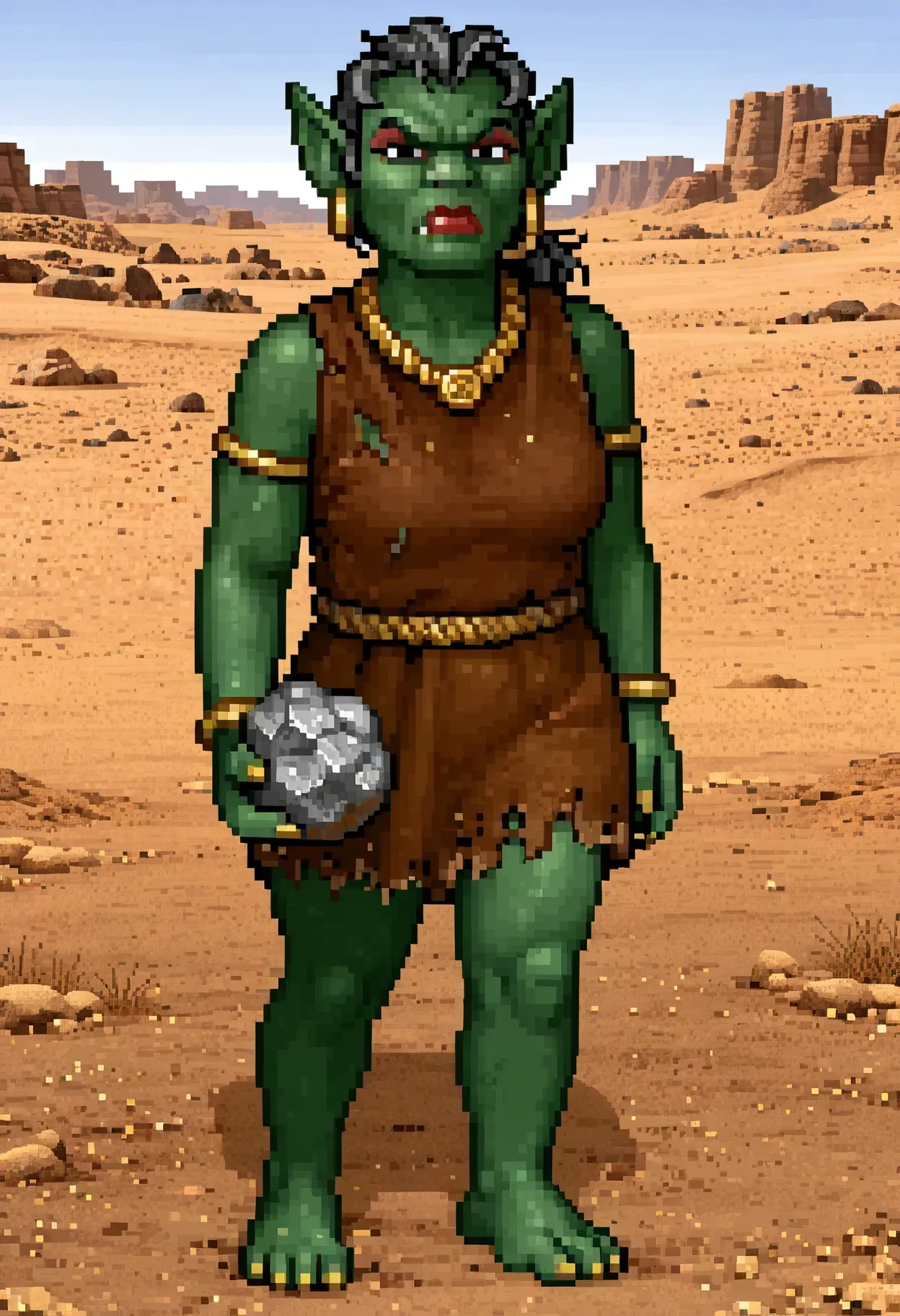Troll: heroes2, pixel art, from side, three-quarter view, full body, troll, female, mature, brown tunic, short skirt, green skin, barefoot, grey hair, gold earrings, solo, yellow fingernails, long fingernails, holding rock, gold necklace, gold bangle, gold armband, gold hair tie, mole, black eyes, red eyeshadow, red lipstick, standing, tattered clothing, medium breasts, annoyed, grimace, scowl,