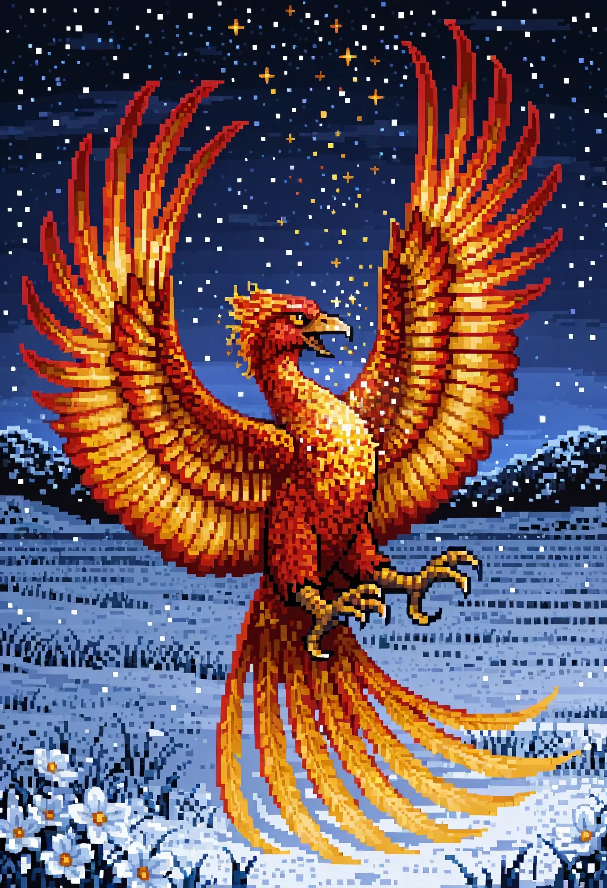 Phoenix: heroes2, pixel art, from side, phoenix, avian, wings, red feathers, standing, yellow eyes, full body, wings up, bird, solo,