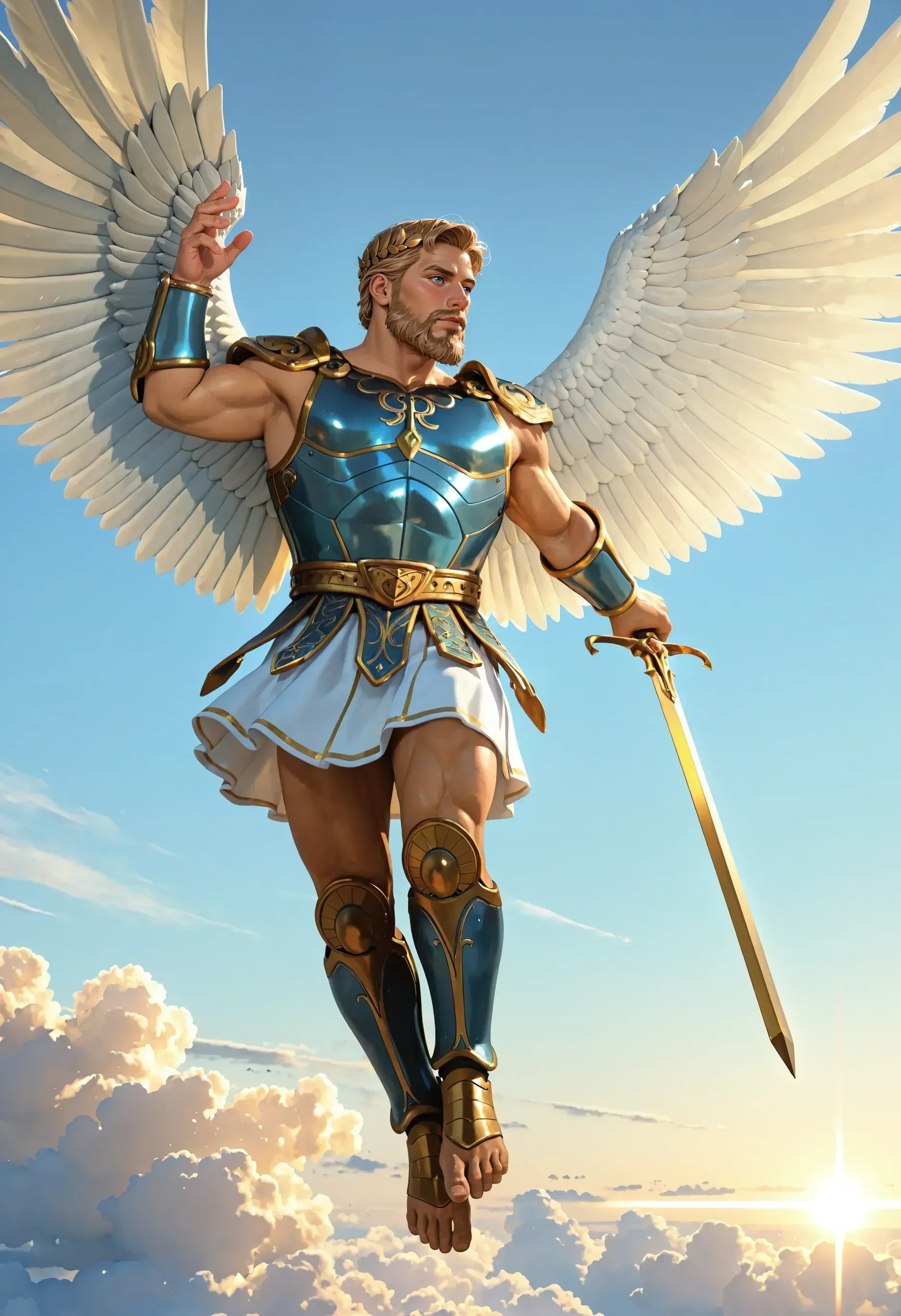 Archangel: heroes3, pixel art, 1boy, male, solo, full body, from side, archangel, standing, wings, white wings, metal breastplate, metal bracers, metal greaves, greaves, holding sword, sword, shield, blonde hair, short hair, blonde beard, skirt, gold accents,
