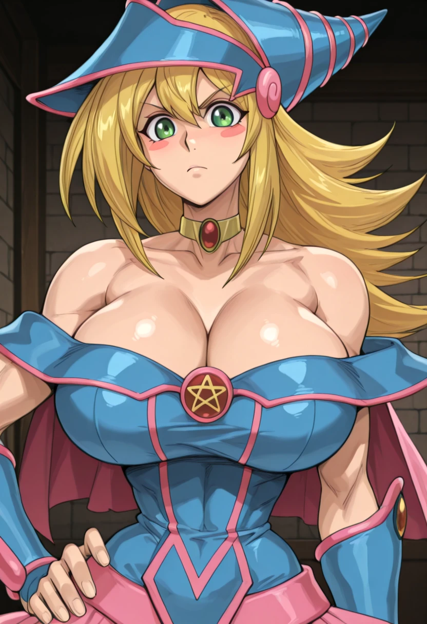 blonde hair, long hair, green eyes, blush stickers, blue wizard hat, pink trim, spikey hair,