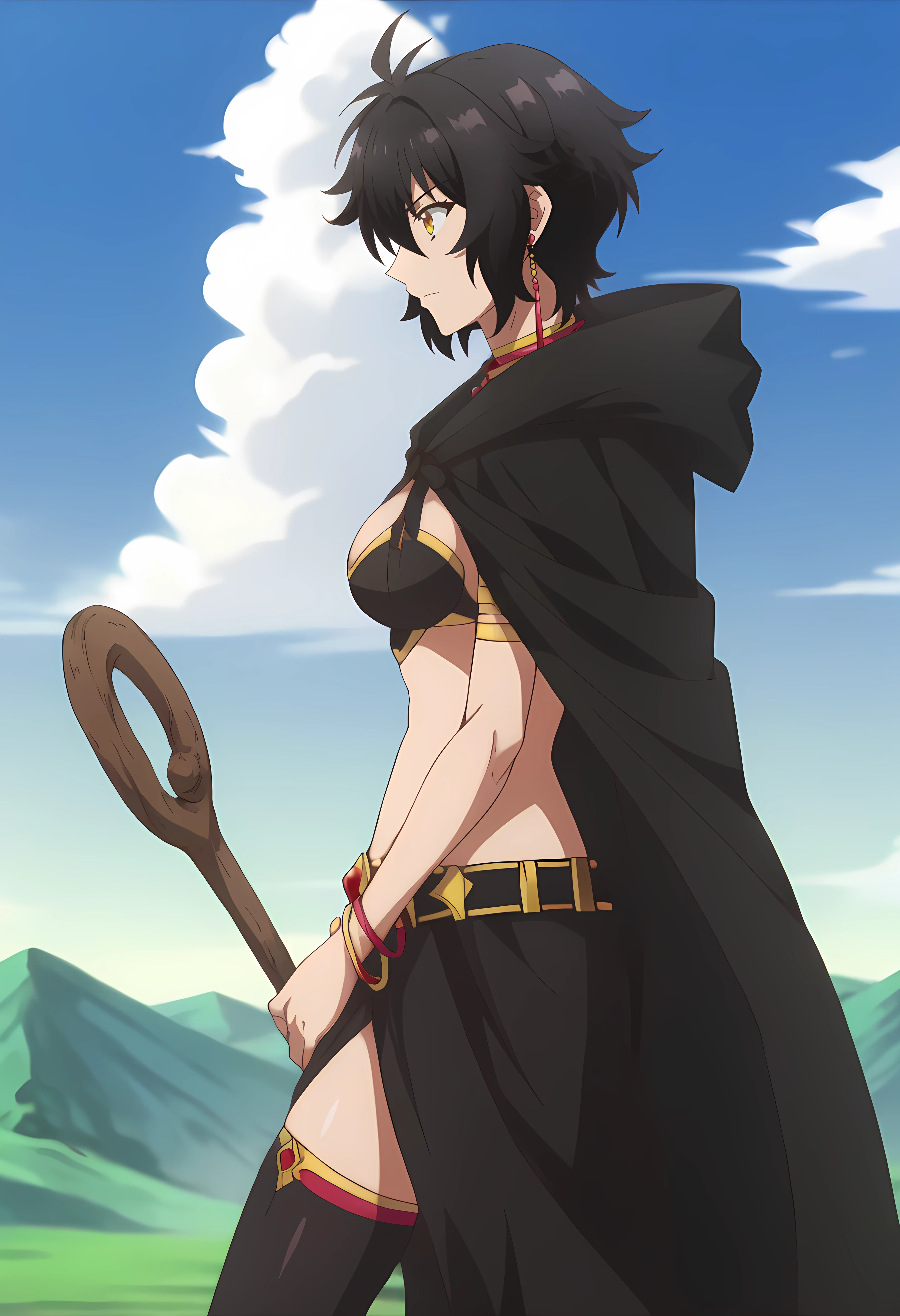 cloak, black cloak, hood, hood down, choker, bracelet, earrings, armlet, jewelry, thighhighs, black thighhighs, skirt, black skirt, cleavage, ankle boots, black boots, high heels, midriff,
