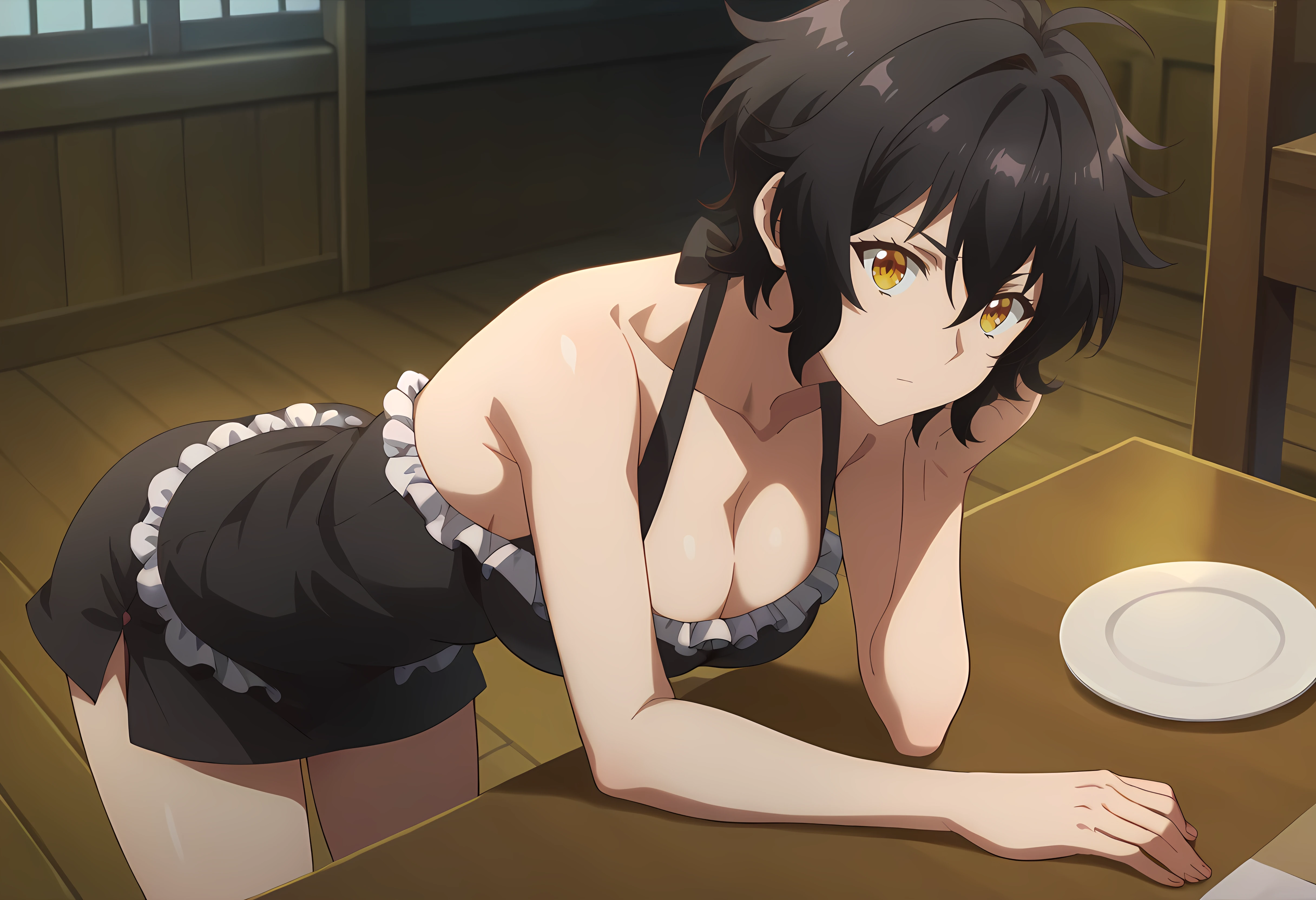 dress, black dress, frills, bare shoulders, short skirt, cleavage