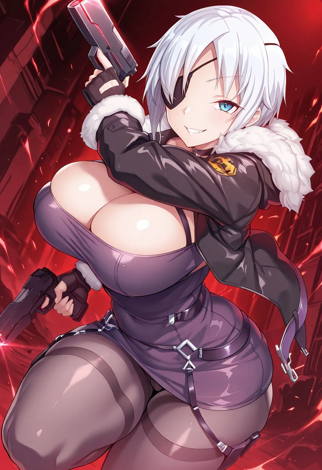 aina winchester, white hair, short hair, eye patch, large breasts, purple dress, black jacket, fur trim, pantyhose