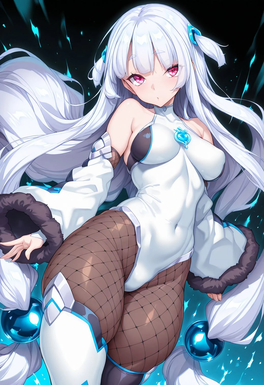 nanase mai, long hair, white hair, hair ornaments, white taimanin bodysuit, fishnet, two-tone thighhighs, white thighhighs, black thighhighs, detached sleeves