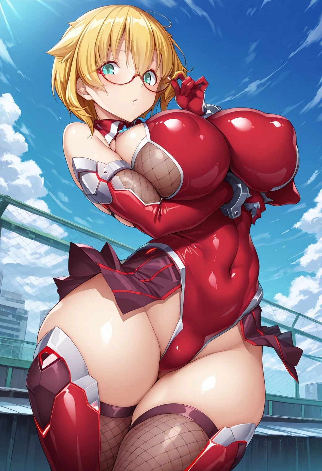 shinohara mari, short hair, blonde hair, green eyes, half-rimmed glasses, large breasts, red taimanin suit, leotard, showgirl skirt, elbow gloves, thighhighs, fishnet, impossible clothing
