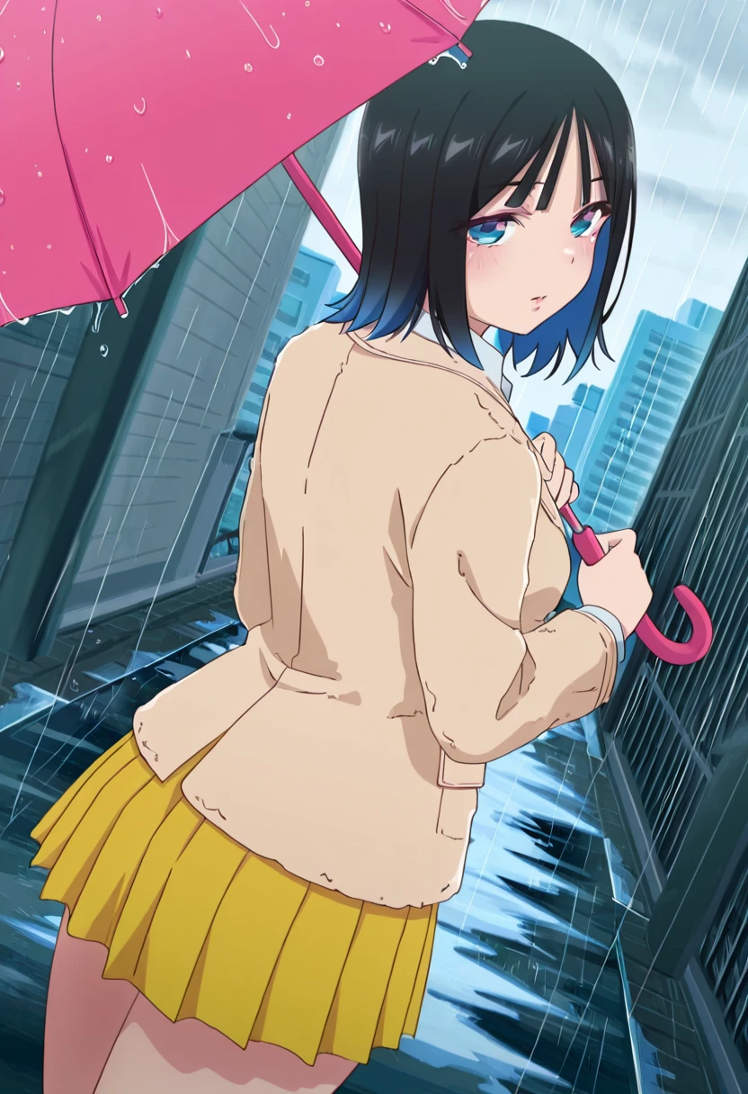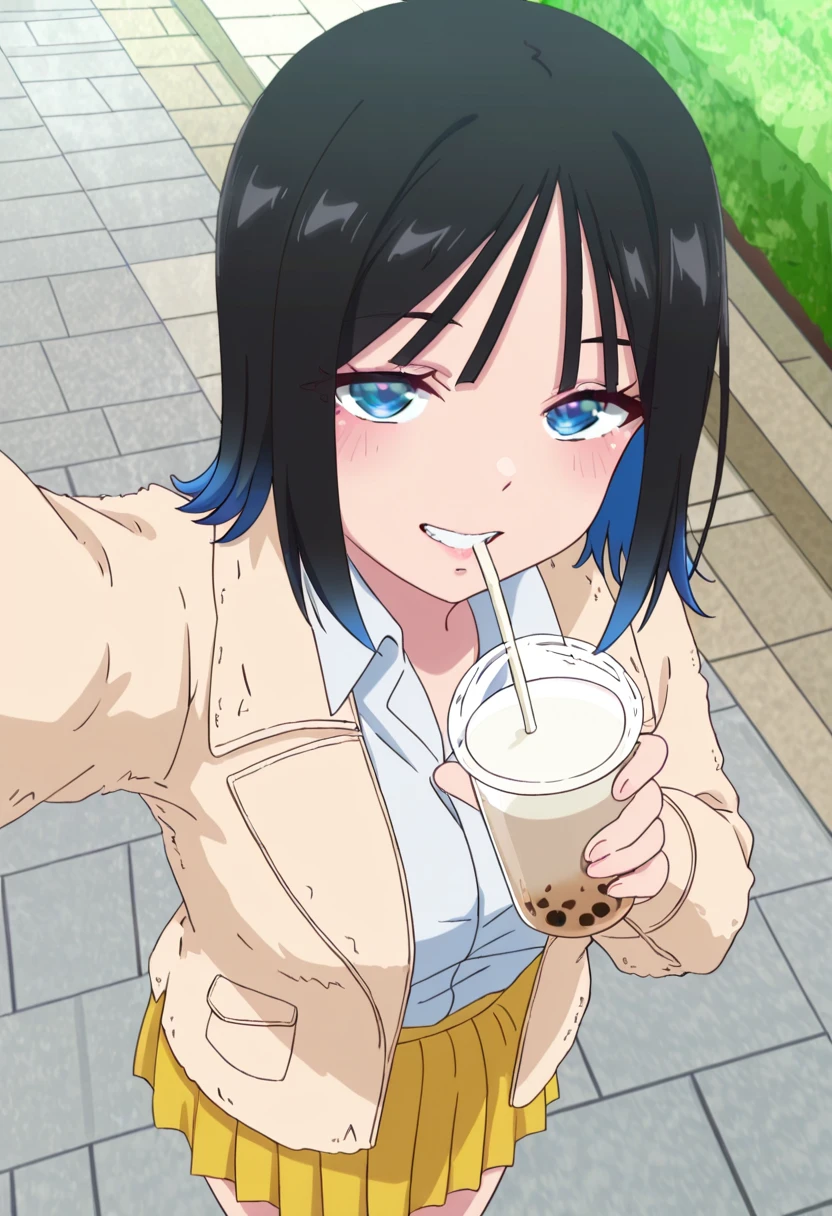 brown jacket, collared shirt, white shirt, pleated skirt, yellow skirt