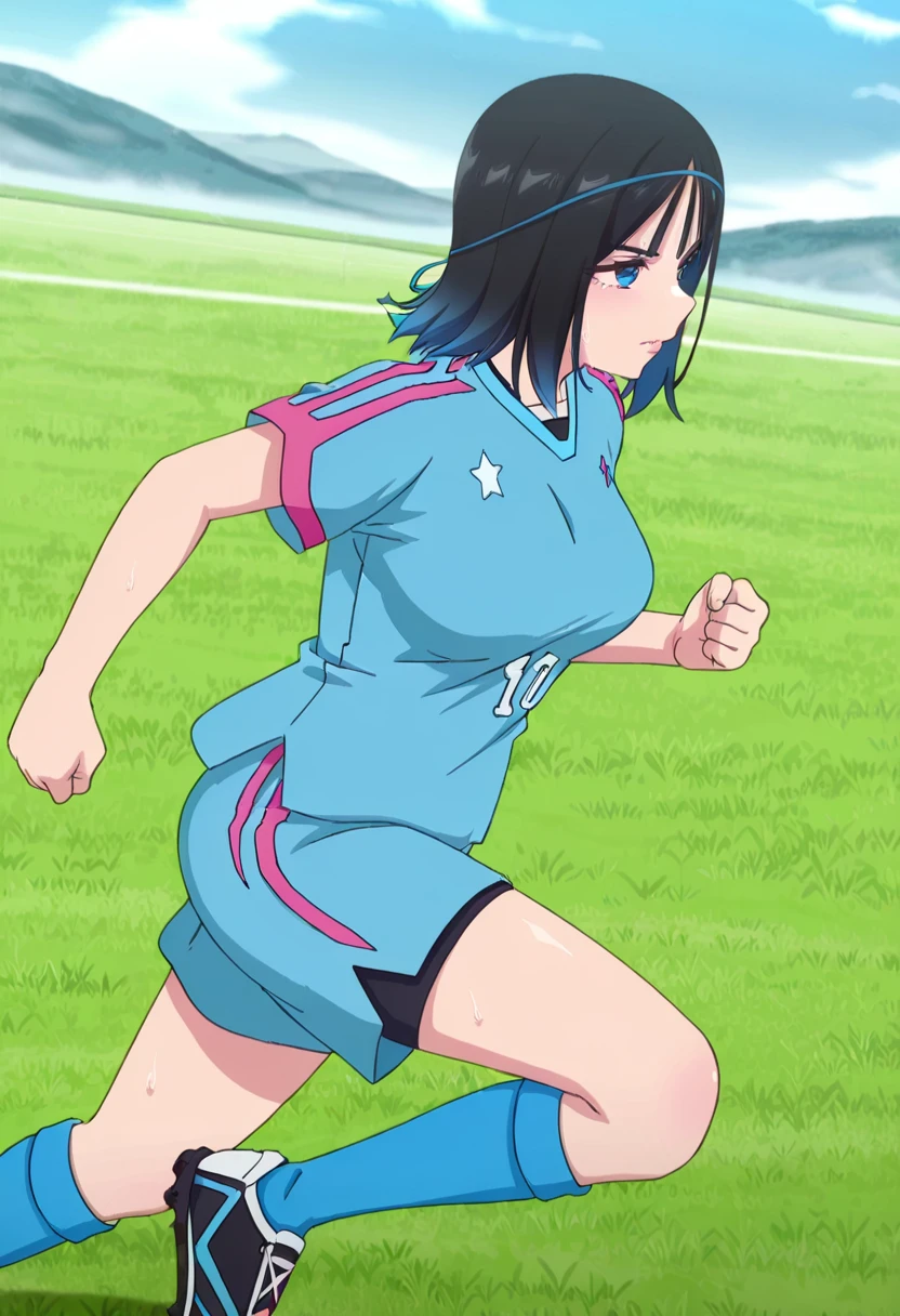 sportswear, soccer uniform, blue shirt, blue shorts, kneehighs, blue socks