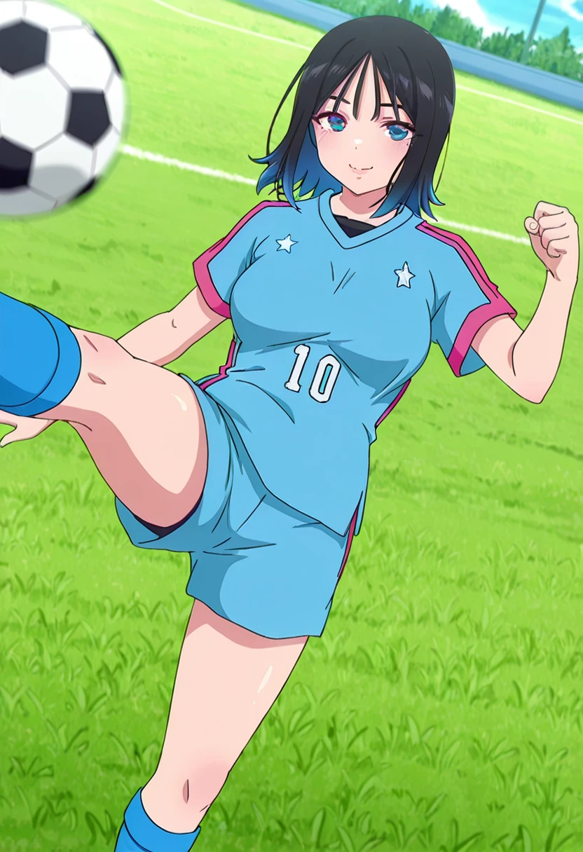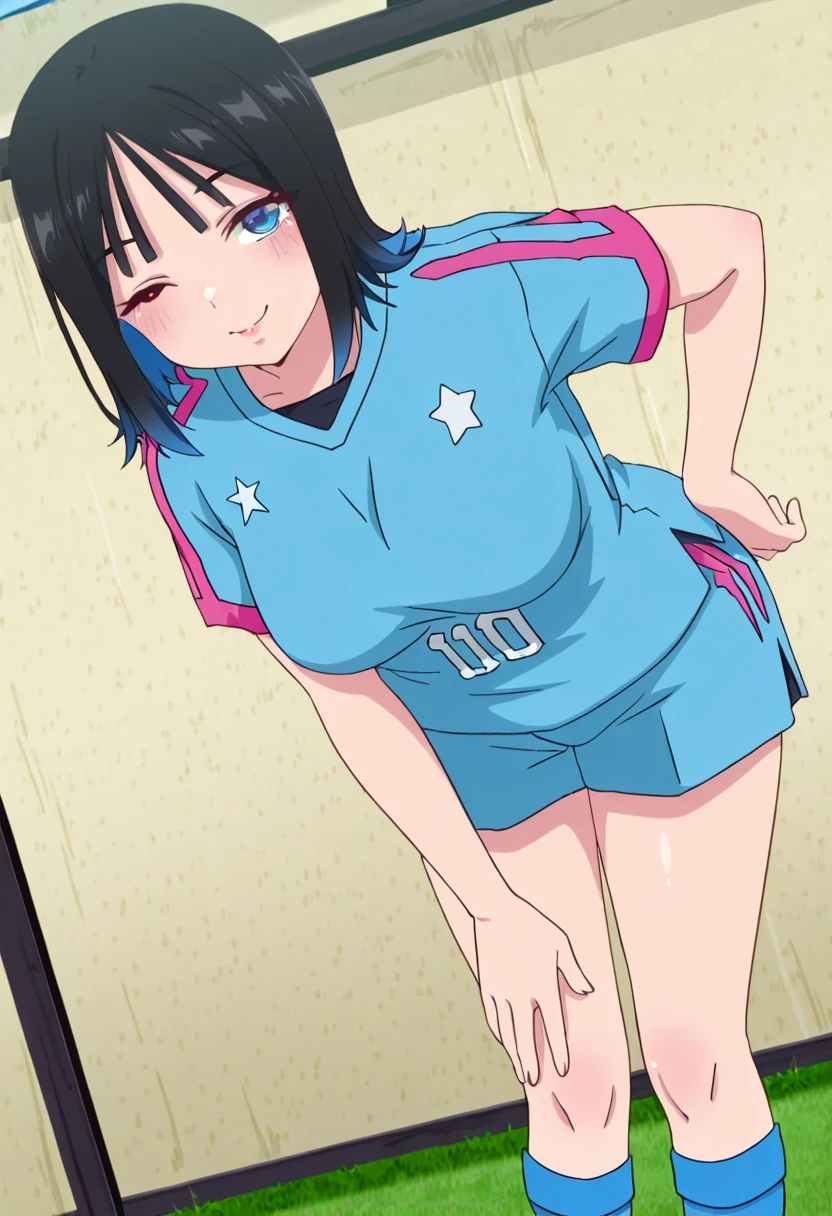 • Sportswear: sportswear, soccer uniform, blue shirt, blue shorts, kneehighs, blue socks