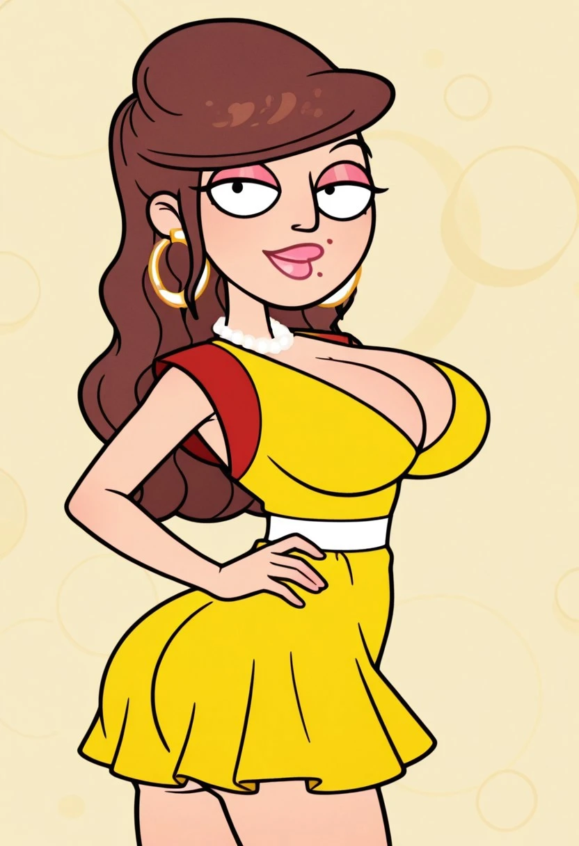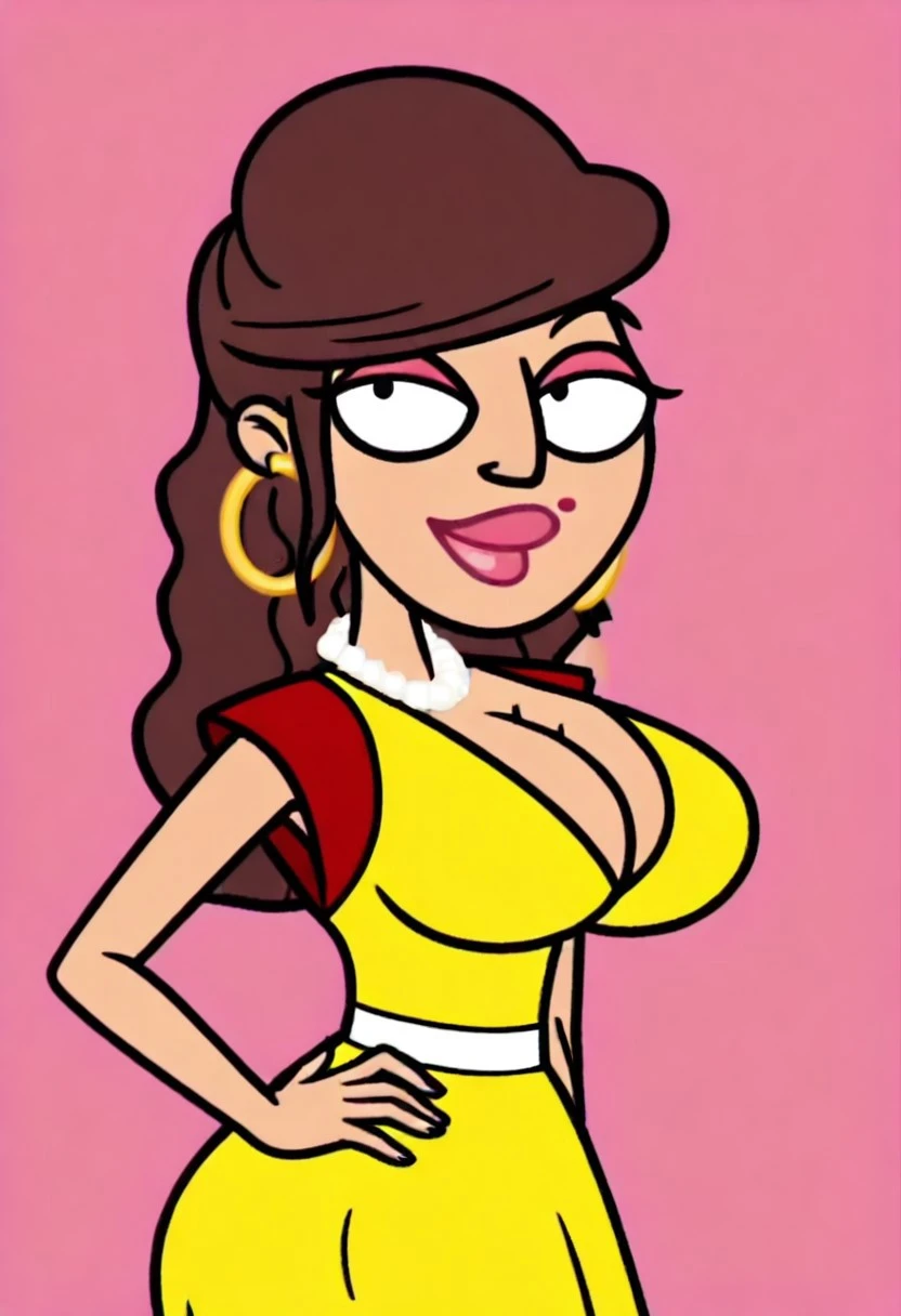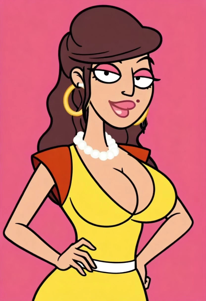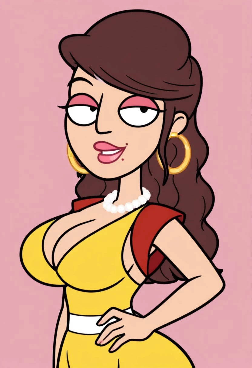 Apollonia Falcone, 1girl, solo, circle earrings, pearl necklace, long hair, brown hair, pink lipstick, pink eyelashes, mole on lip, large breasts