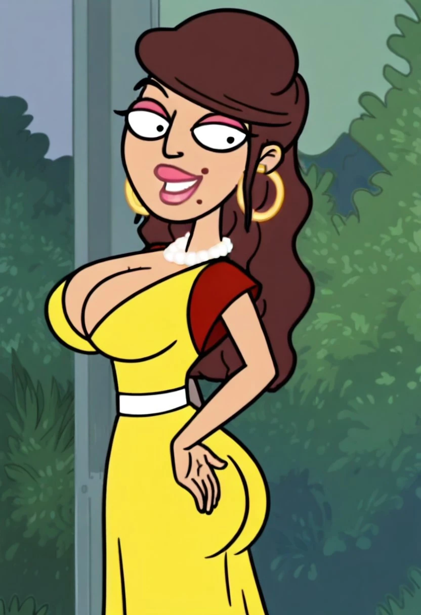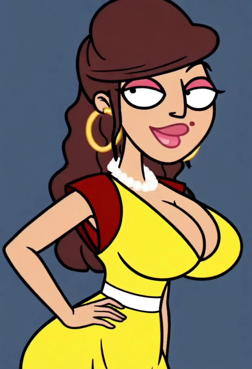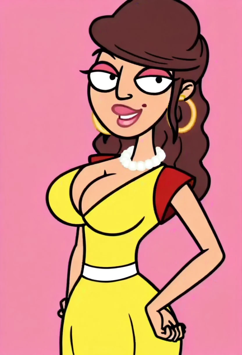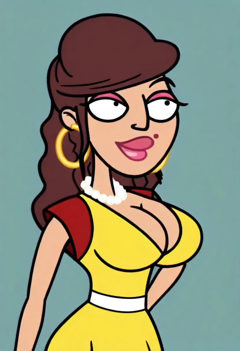Apollonia Falcone, 1girl, solo, circle earrings, pearl necklace, long hair, brown hair, pink lipstick, pink eyelashes, mole on lip, large breasts