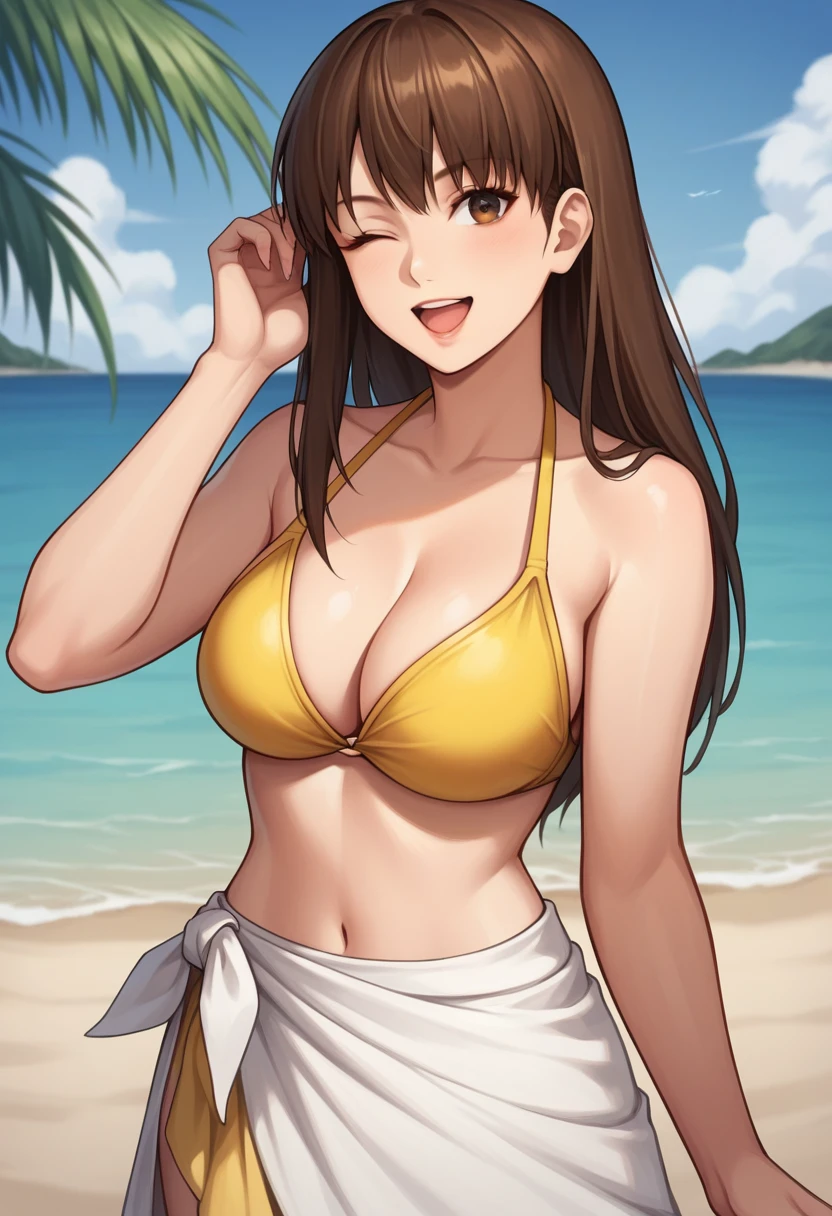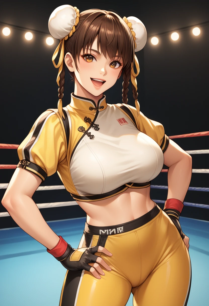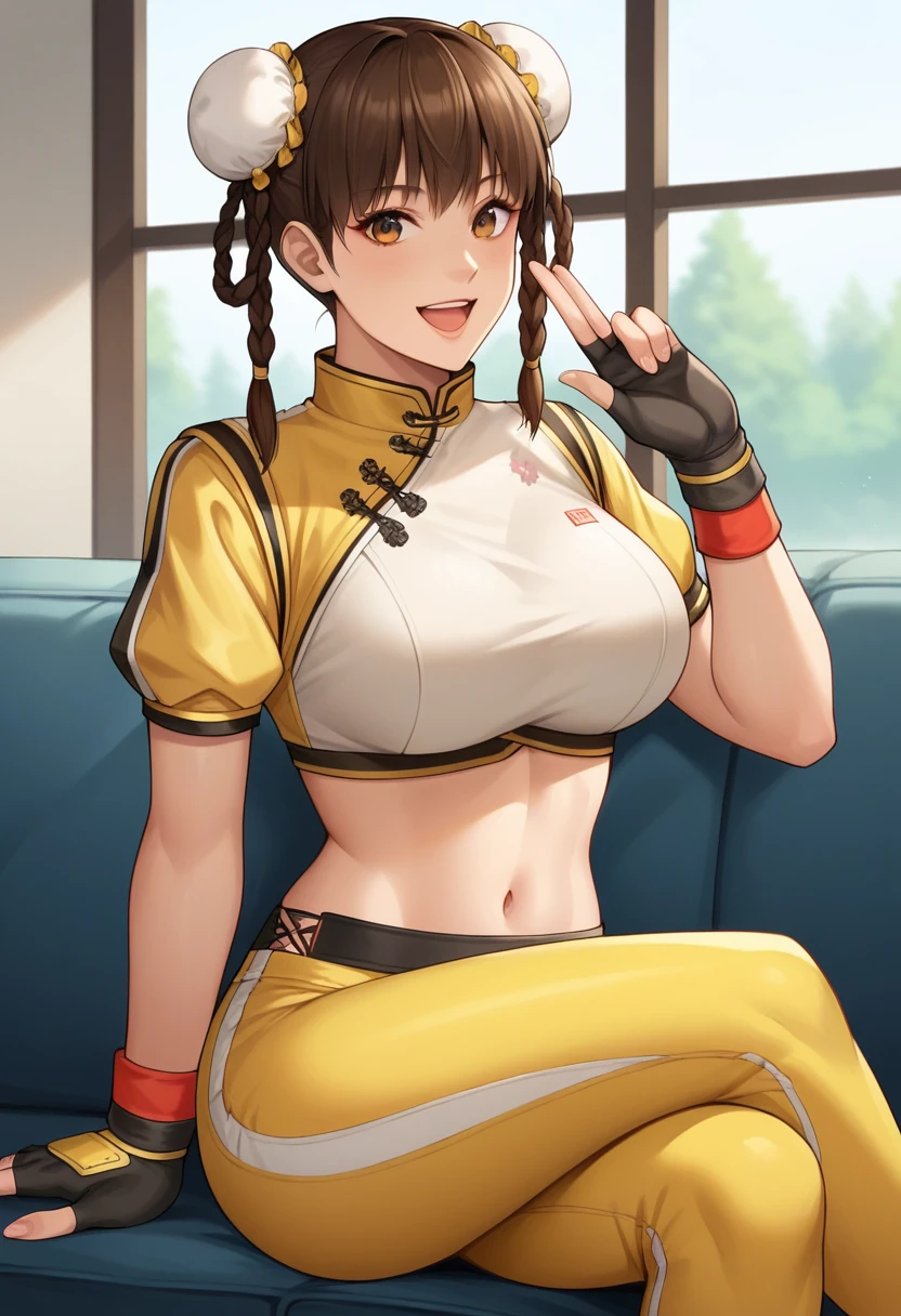 "LeiFangDOA, brown hair, twin braids, double bun, bun cover, crop top, yellow leggings, short sleeves, fingerless gloves" DOA6 outfit.