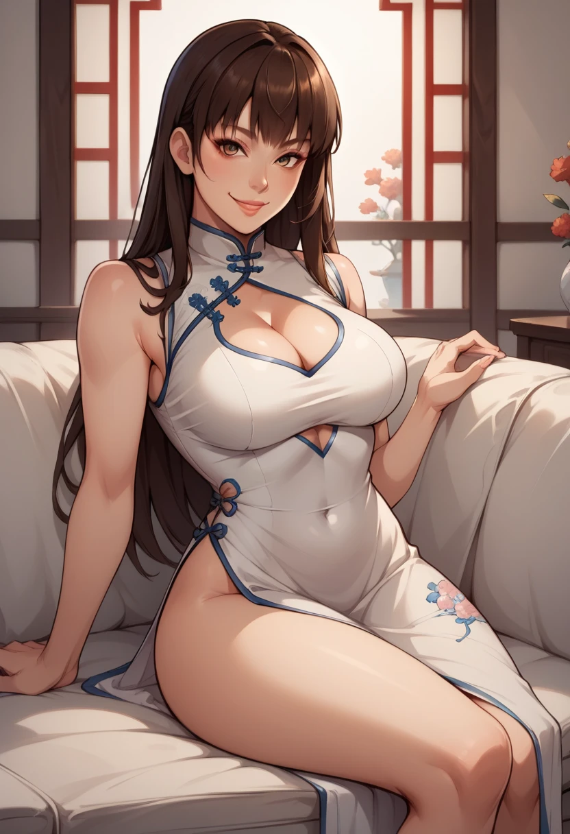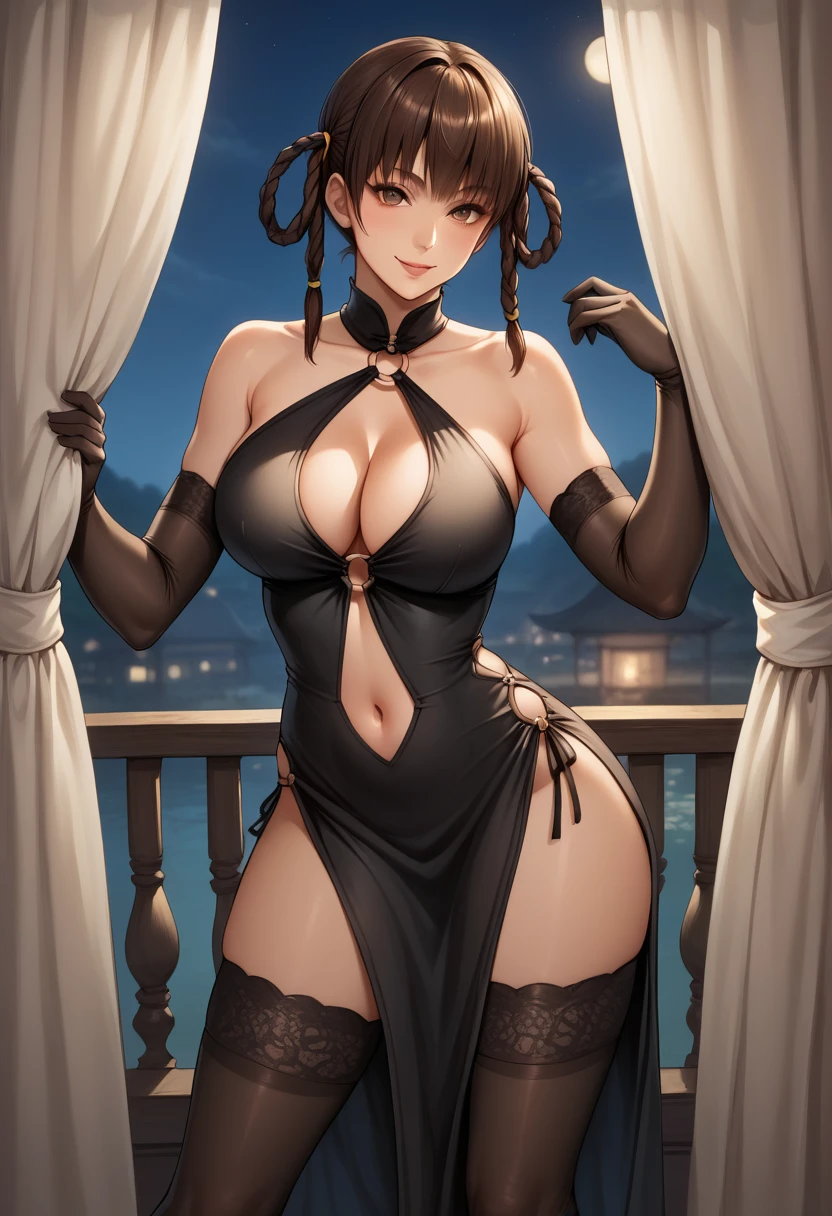 "LeiFangDOA, brown hair, braided hair rings, black dress, o-ring, cleavage, navel cutout, thighhighs, side slit, elbow gloves," for her black dress.