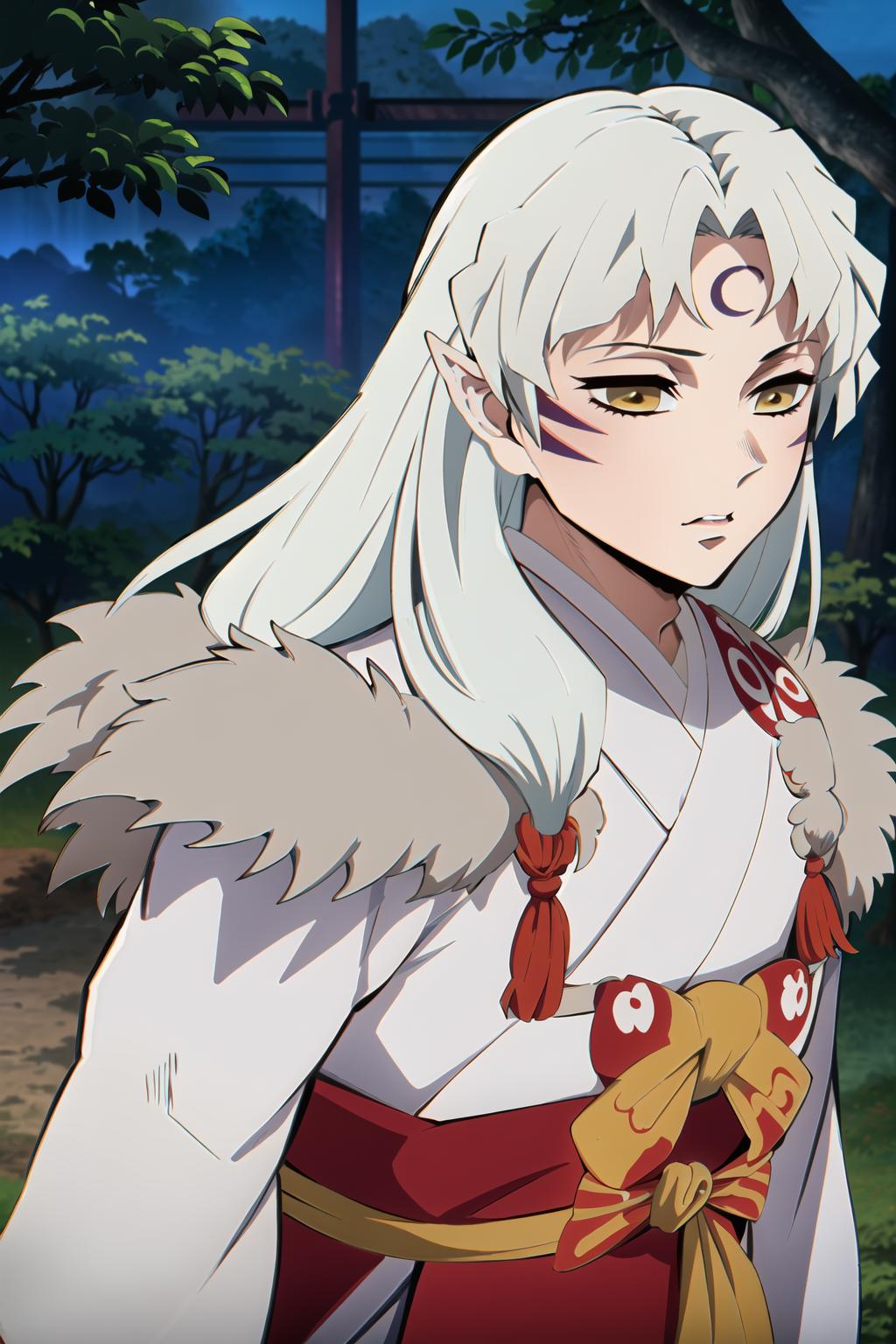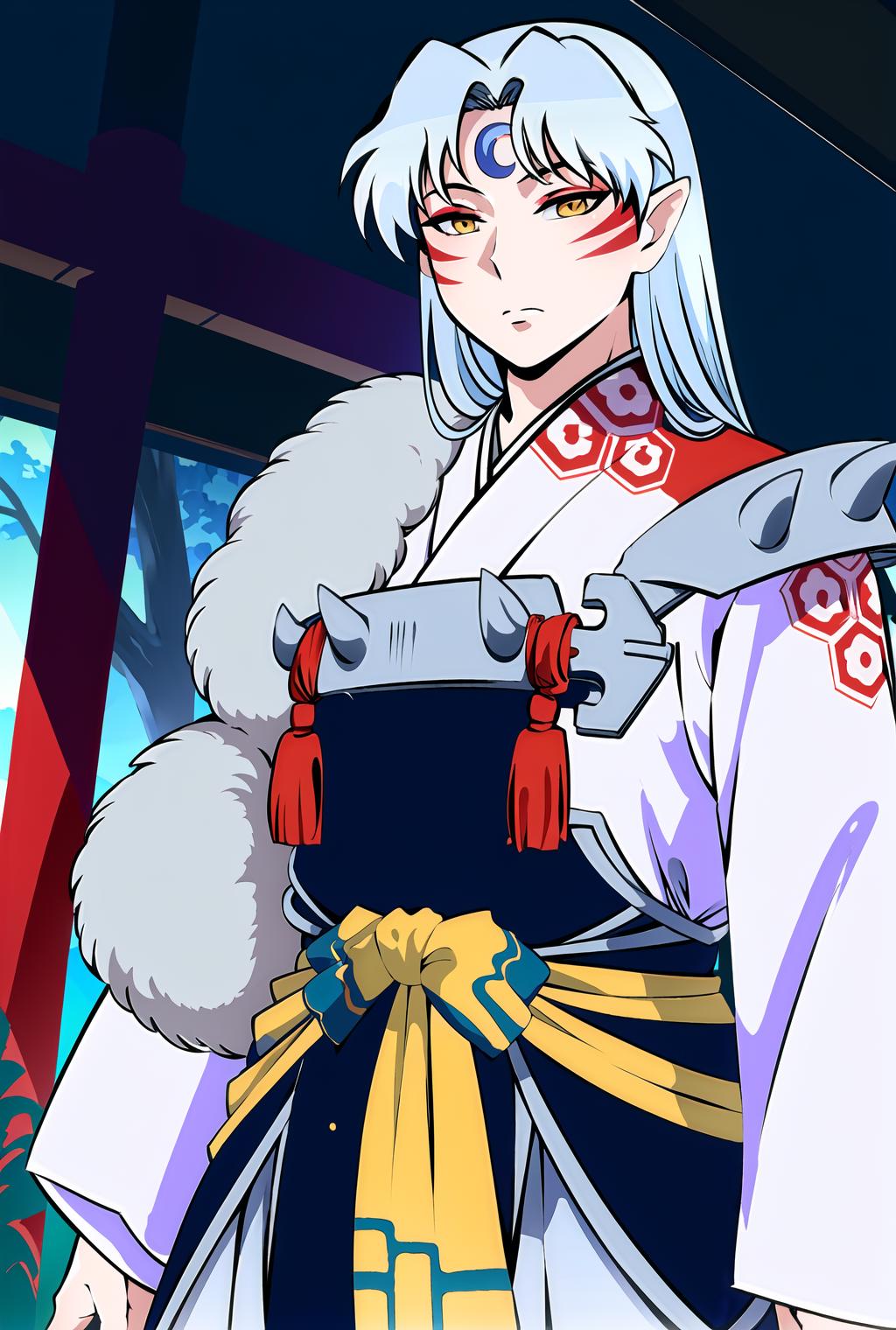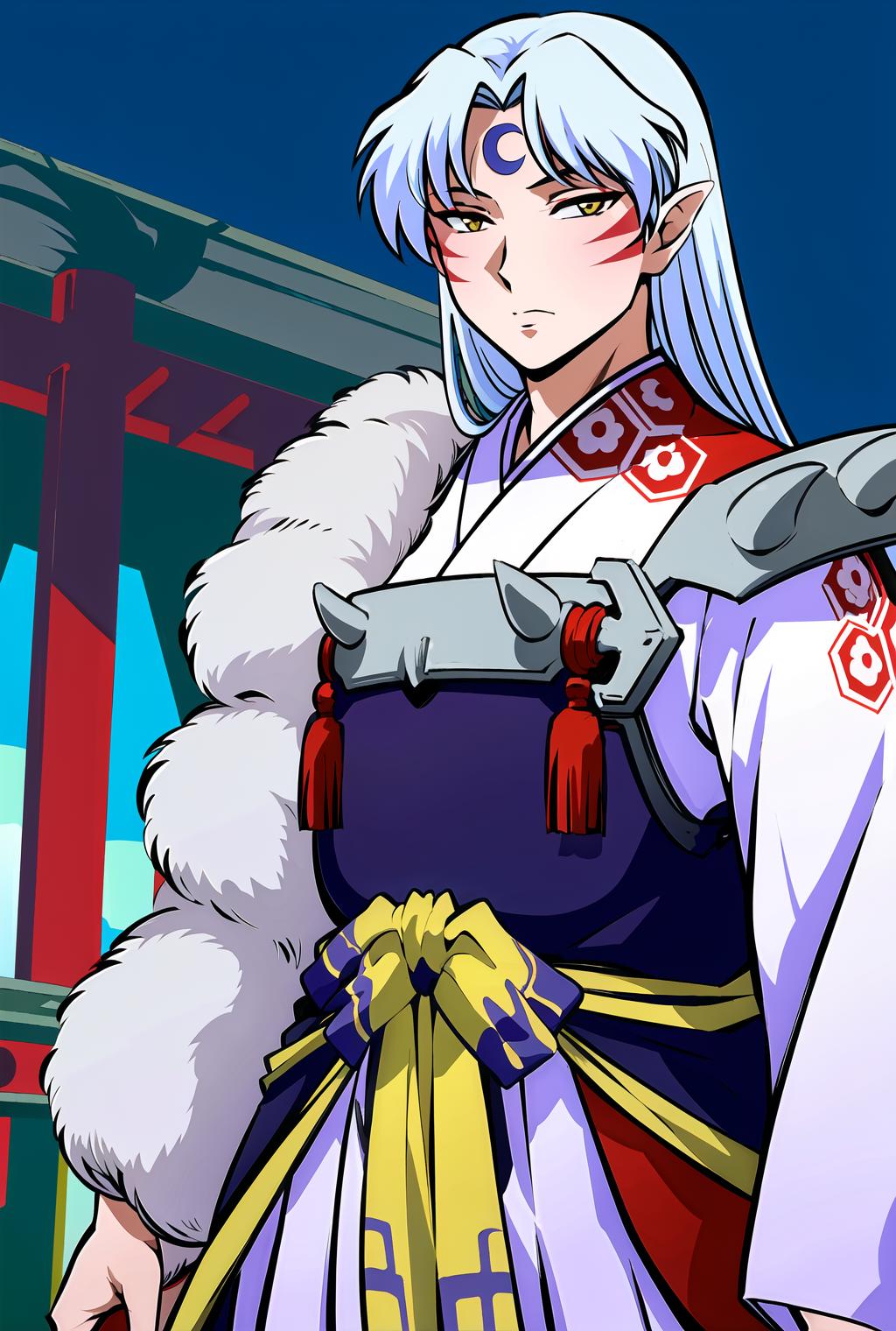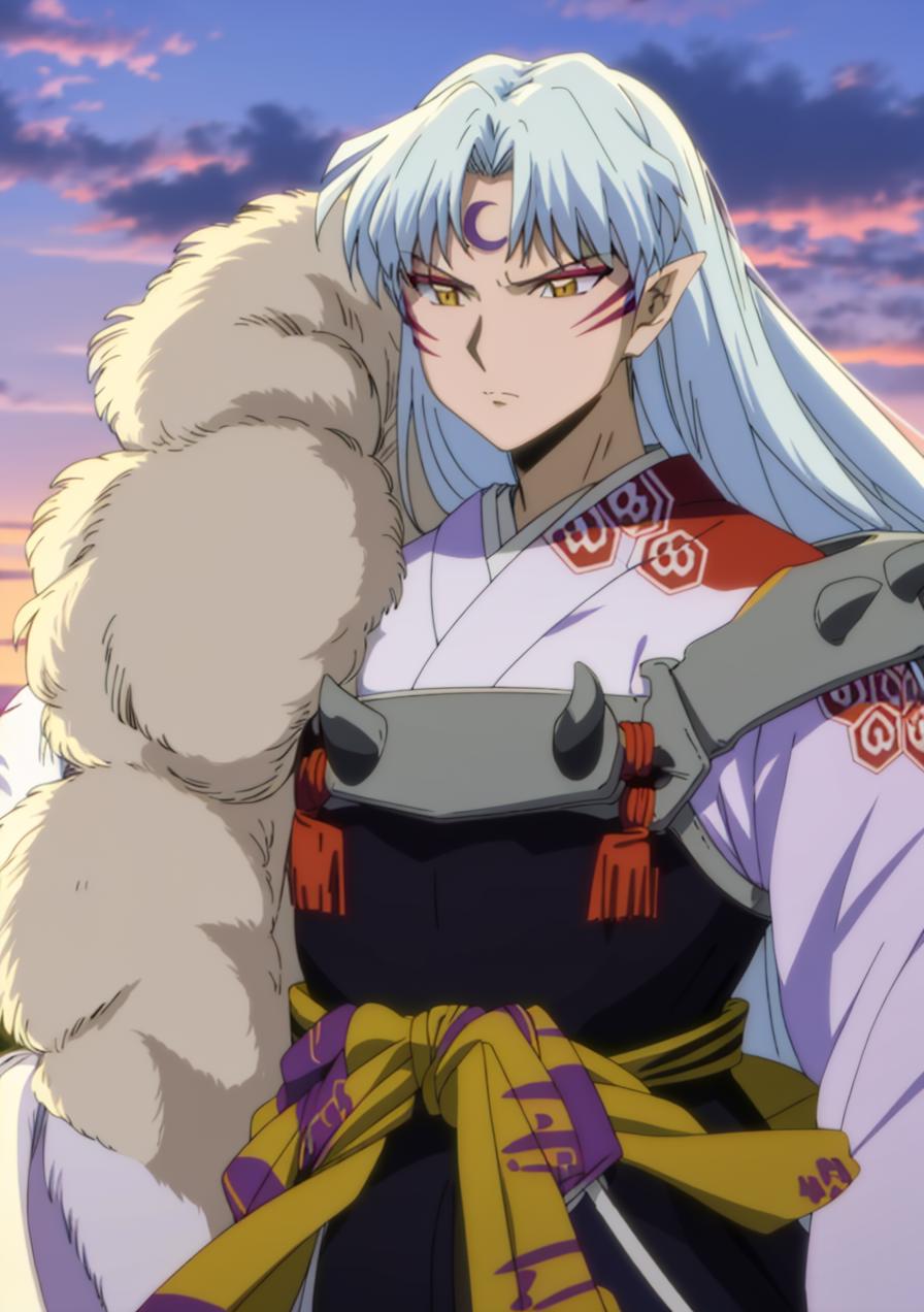 Same as Inuyasha if you would like a closer to anime look, use official style in your prompts. If he loses any of his characteristics you can help him restore them with: long hair ,white hair,fur trim,yellow eyes,white kimono, armor, etc. I recommend to use him at 0.8~1 and to use hires with 10+ steps, as his face is complicated and ends up like a blurry mess a lot. If he has too many markings, use higher weight or just use very low seed variation to get back to two per cheek.