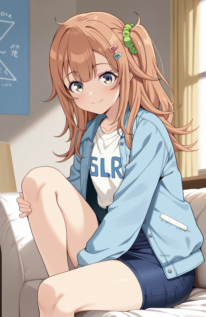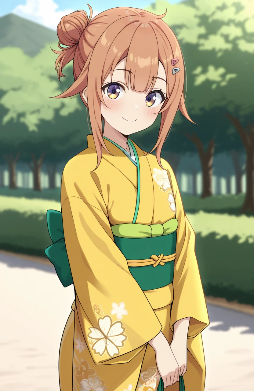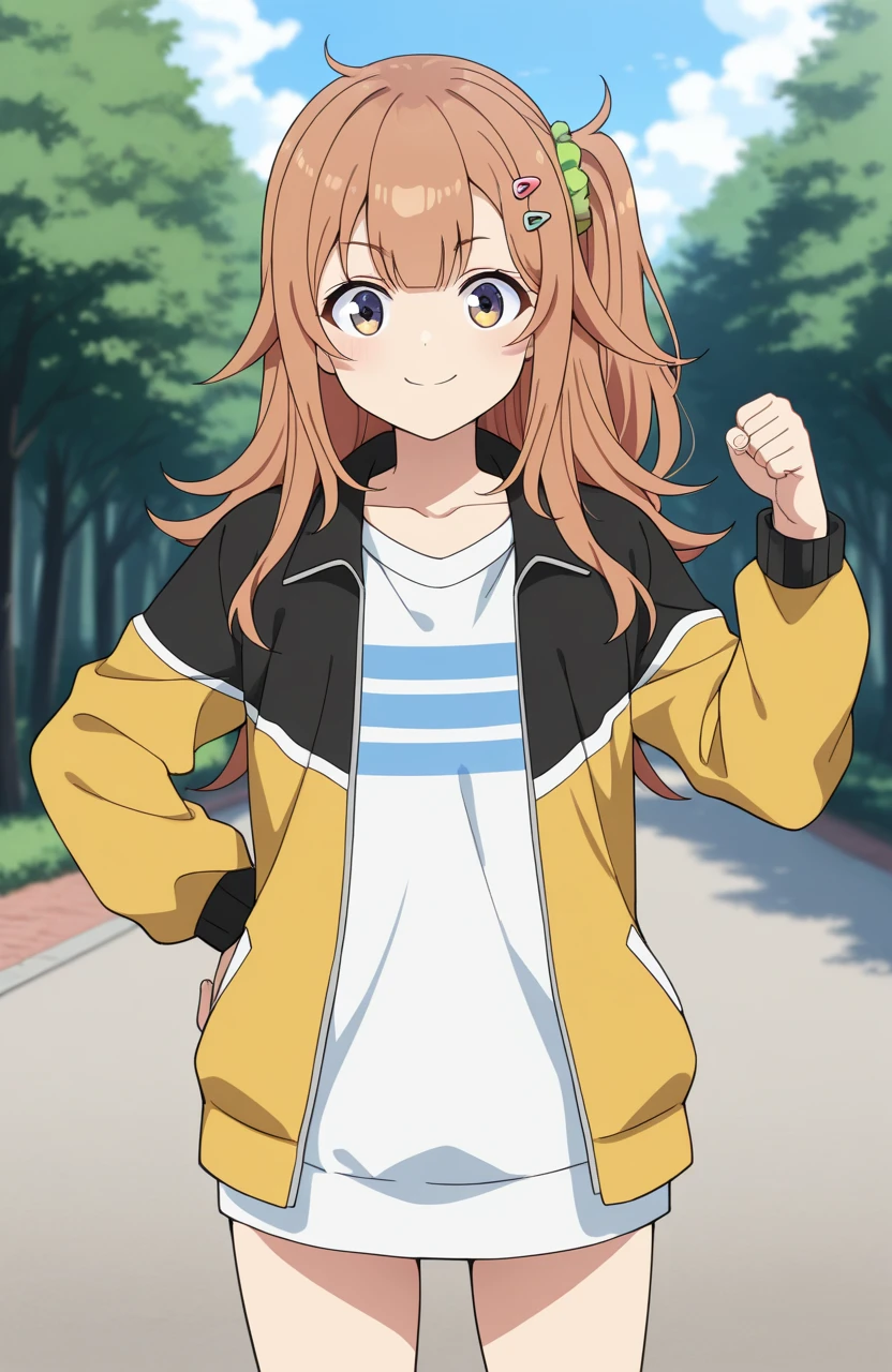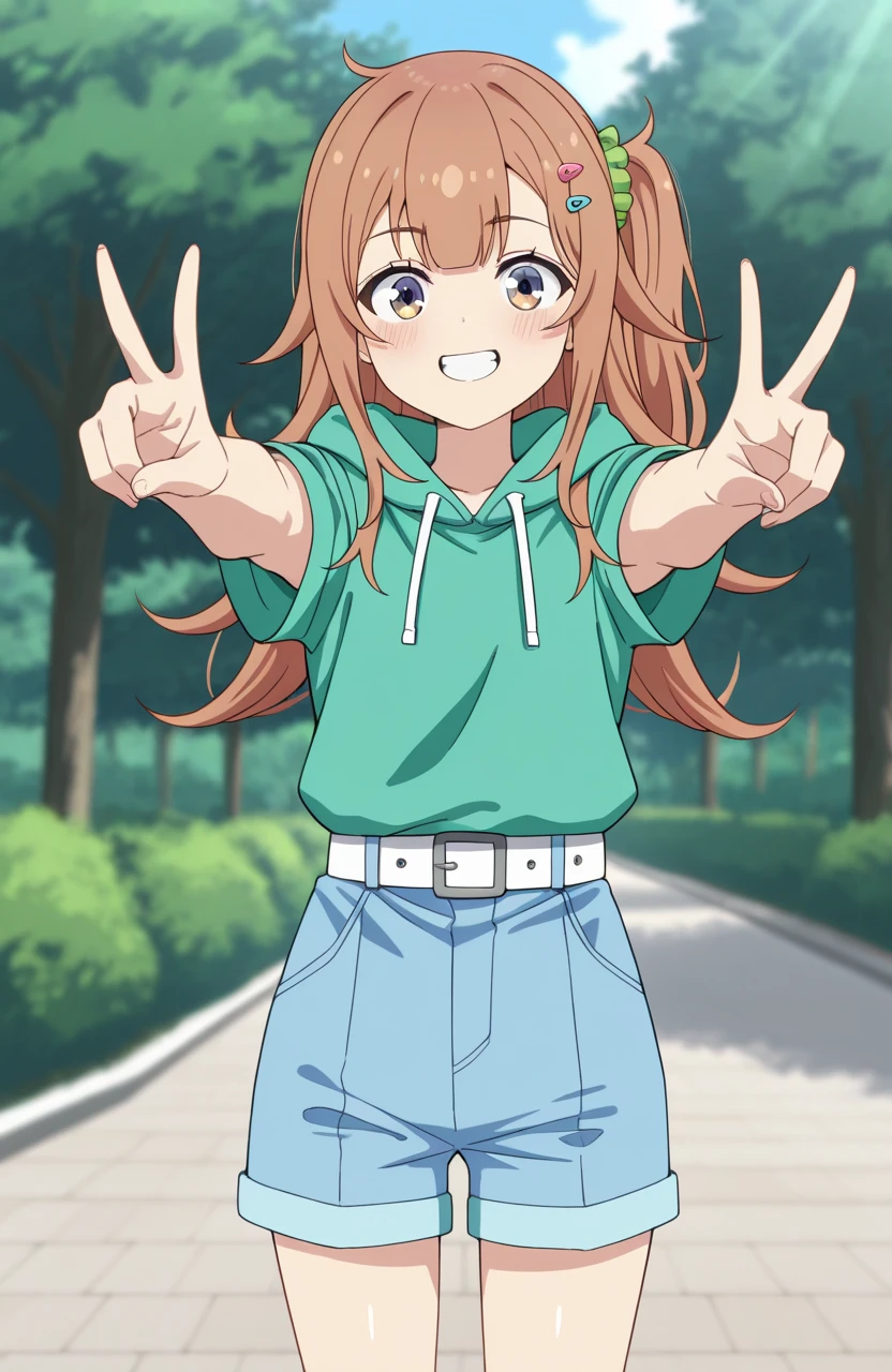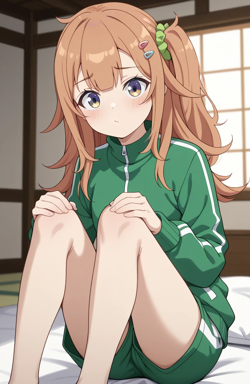 Default: shinon ogawa, hair ornament, double hairclip, one side up, green hair scrunchie