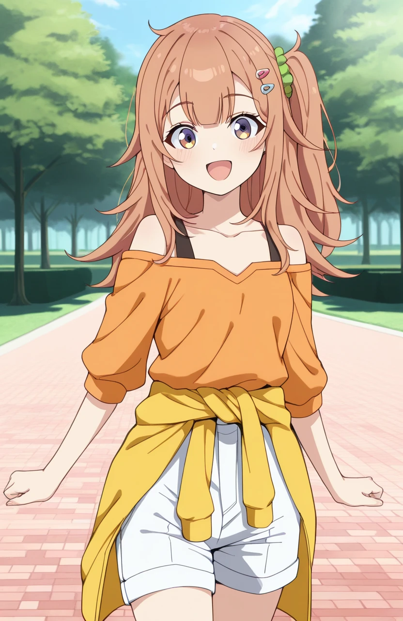 Outfit 3: shicasual3, off-shoulder orange shirt, black straps, white shorts, yellow jacket around waist