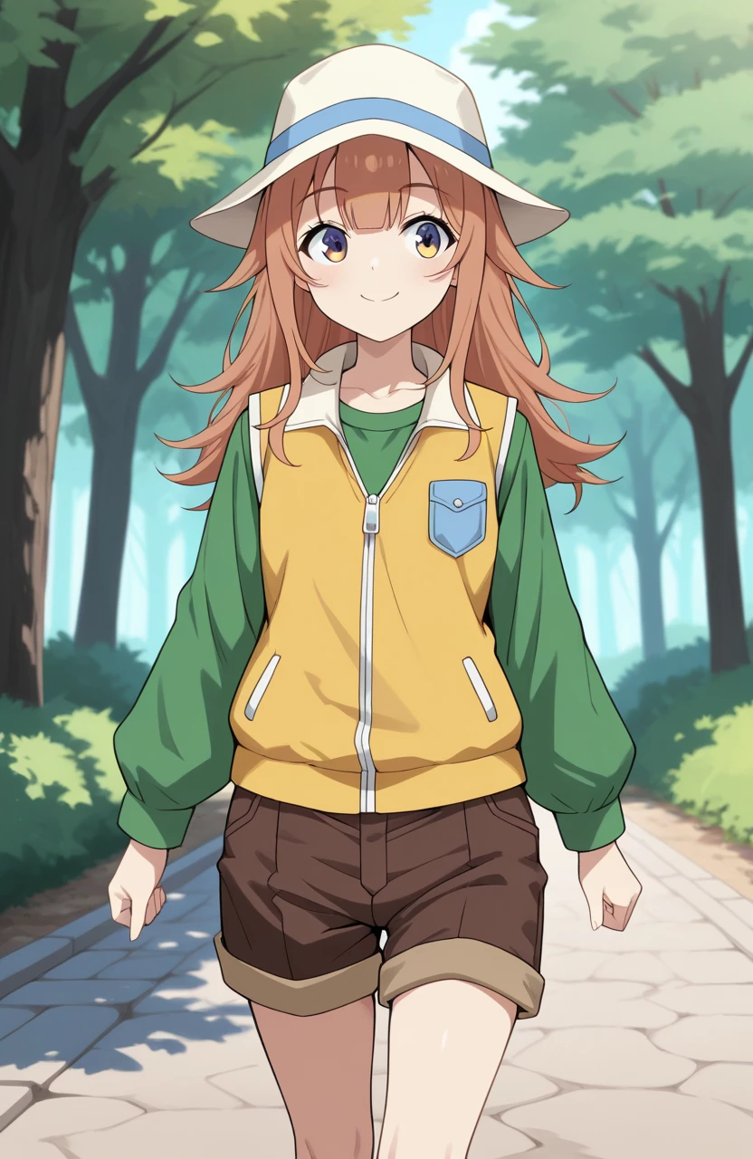 Outfit 6 (Hiking): shihike, hat, single blue ?????? pocket, yellow vest with white zipper, green shirt, long sleeves, brown shorts