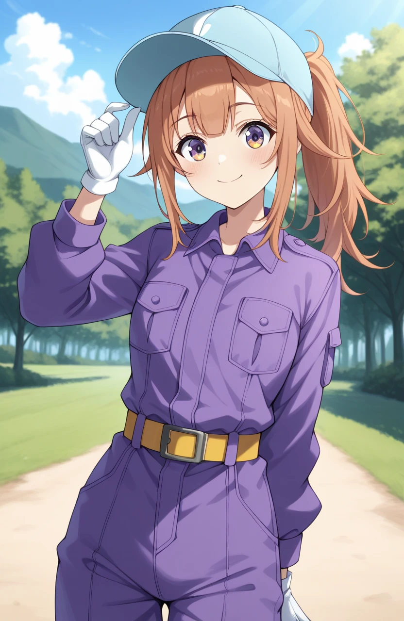Outfit 8 (Field work): shigarden, baseball cap, light blue hat, jumpsuit, purple jumpsuit, long sleeves, yellow belt, white gloves