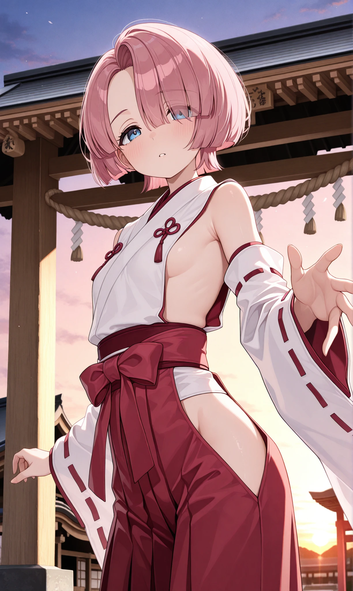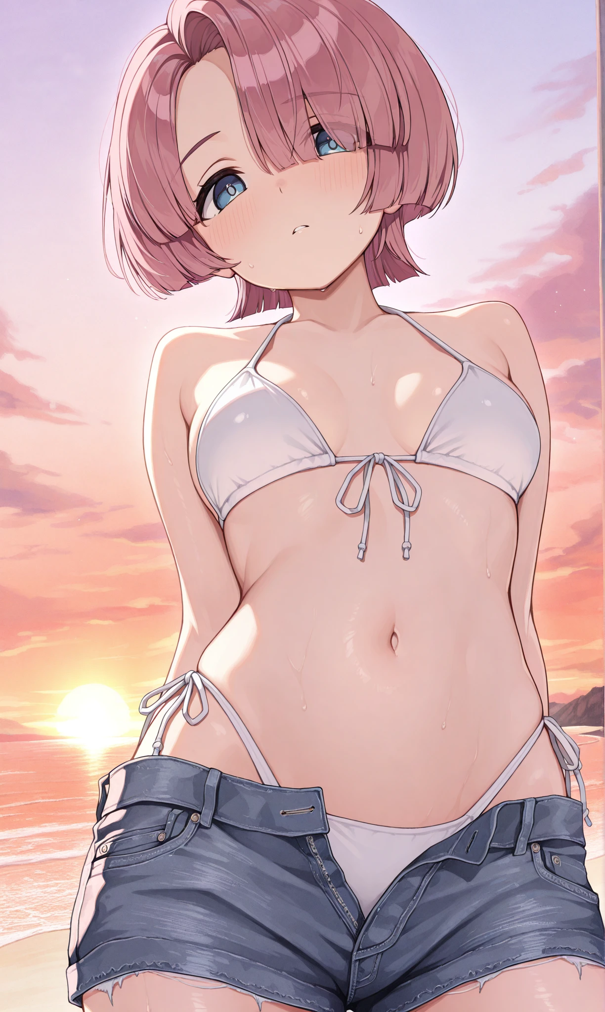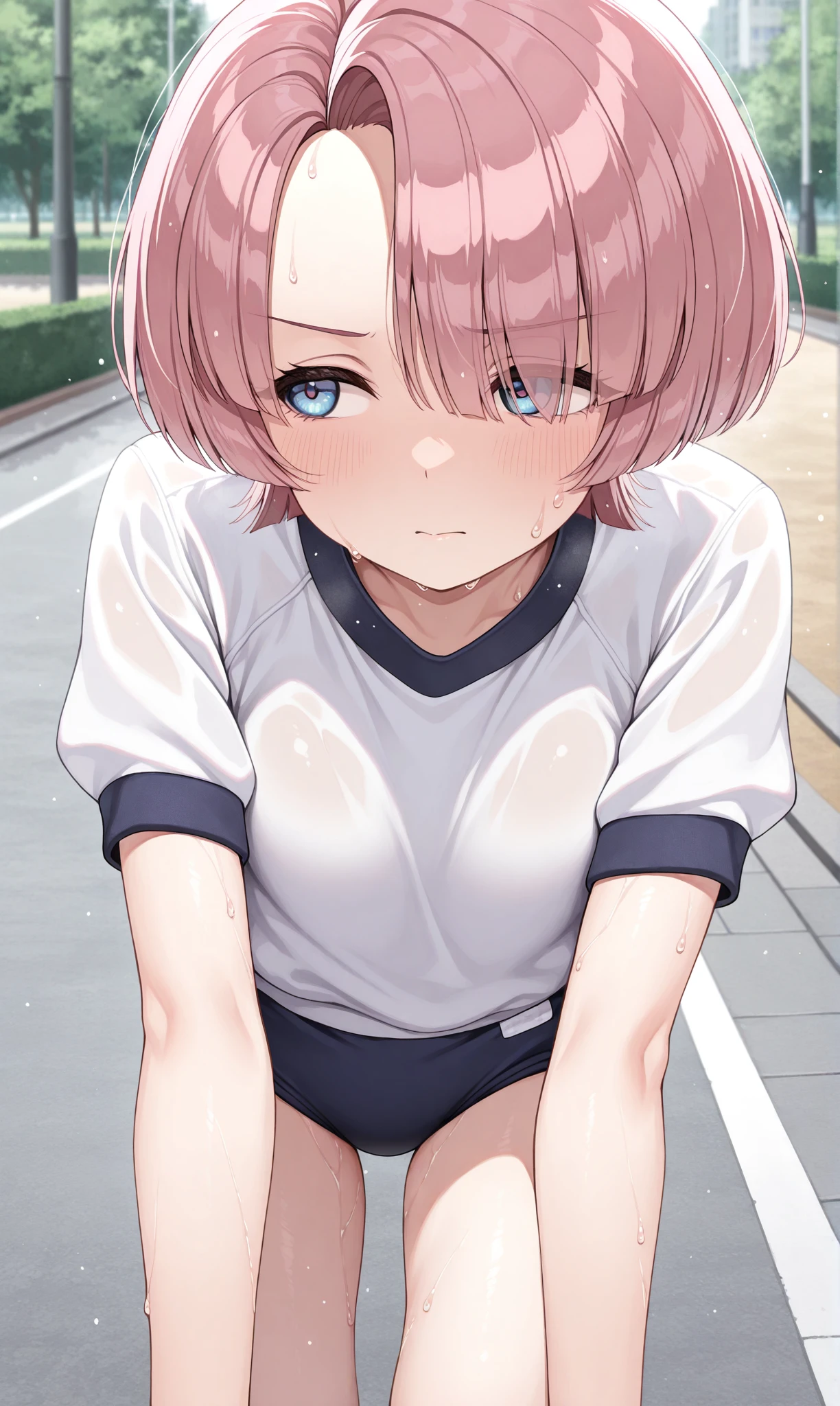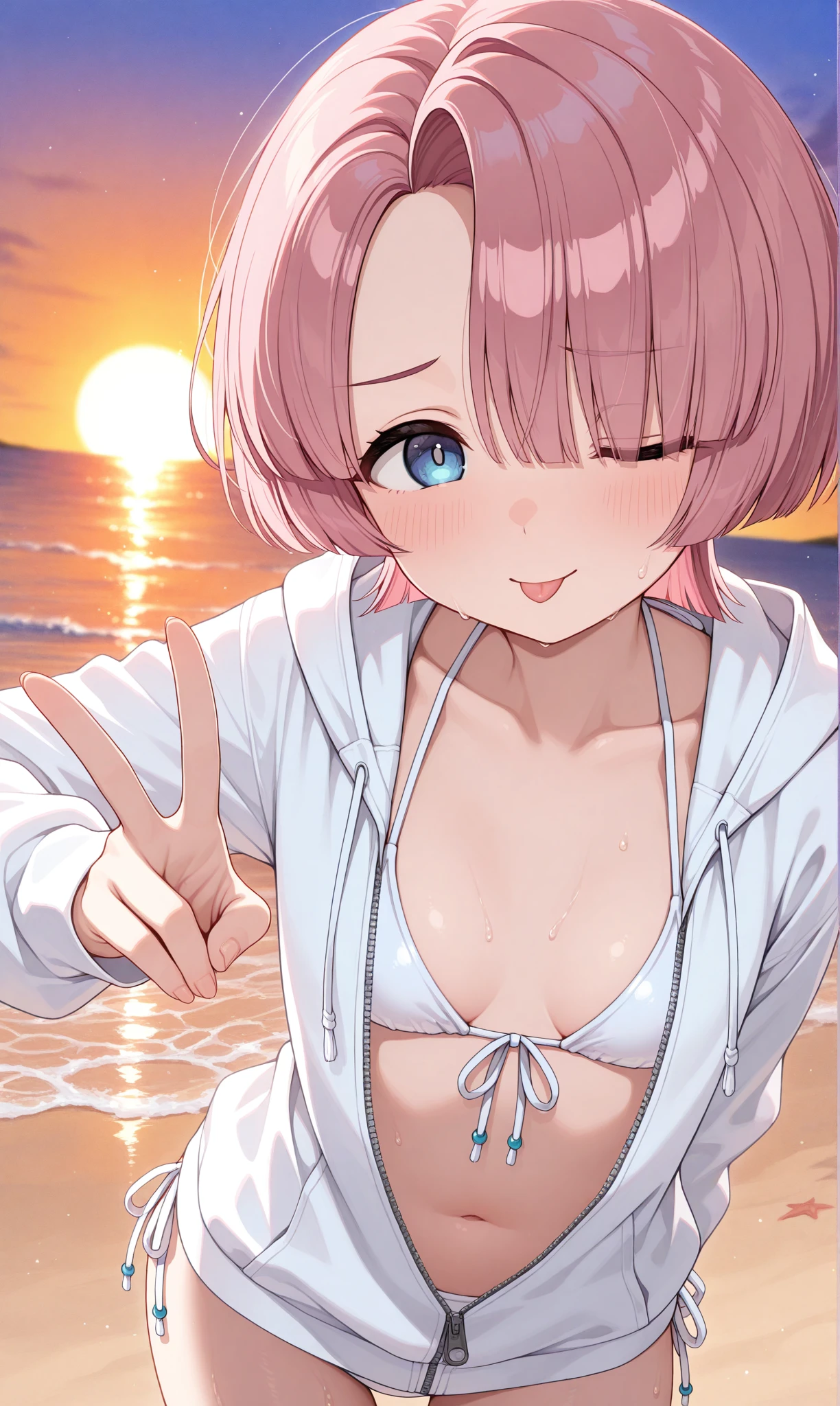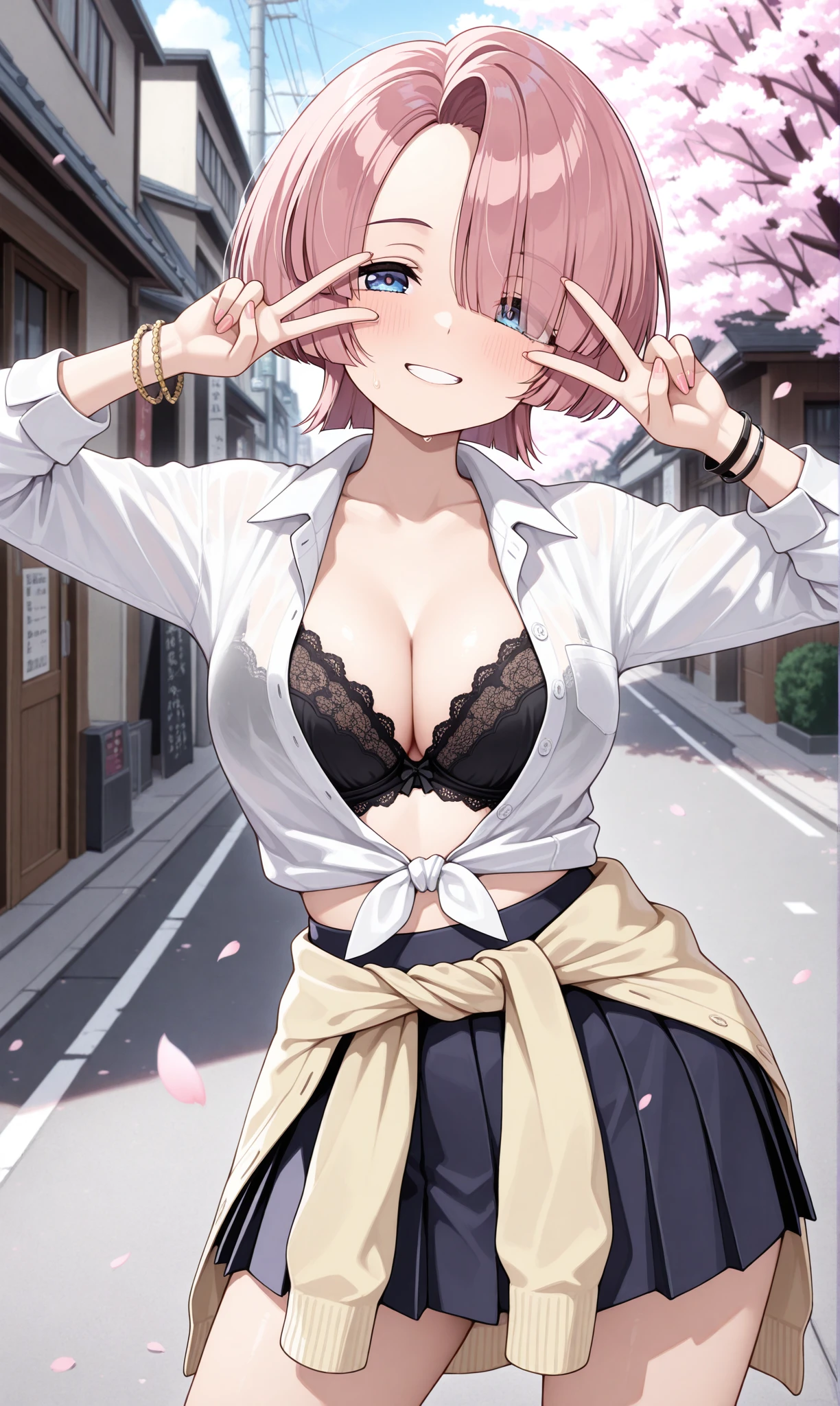 arimura mao, sweater vest, asymmetrical bangs, hair over one eye, short hair, blue eyes, pink hair