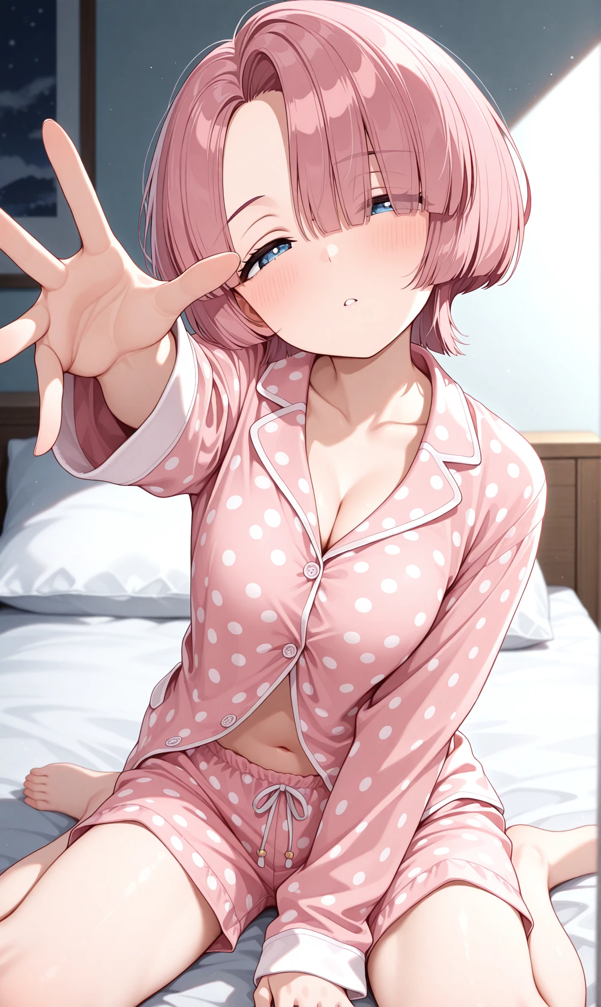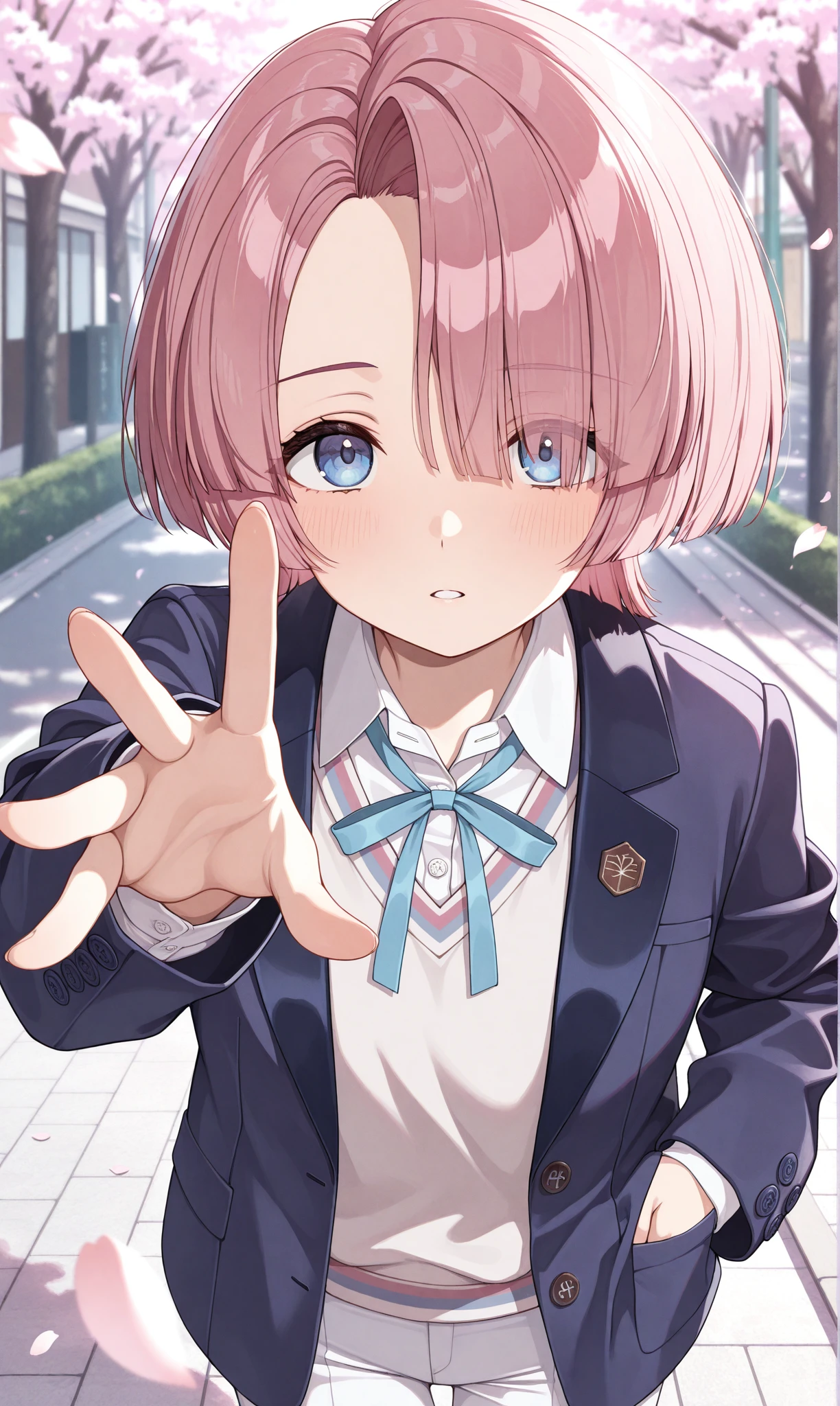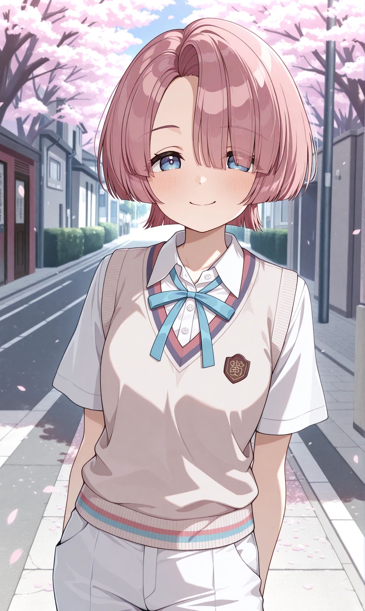 arimura mao, sweater vest, asymmetrical bangs, hair over one eye, short hair, blue eyes, pink hair๐ข๐๐๐ณ๐ถ๐: