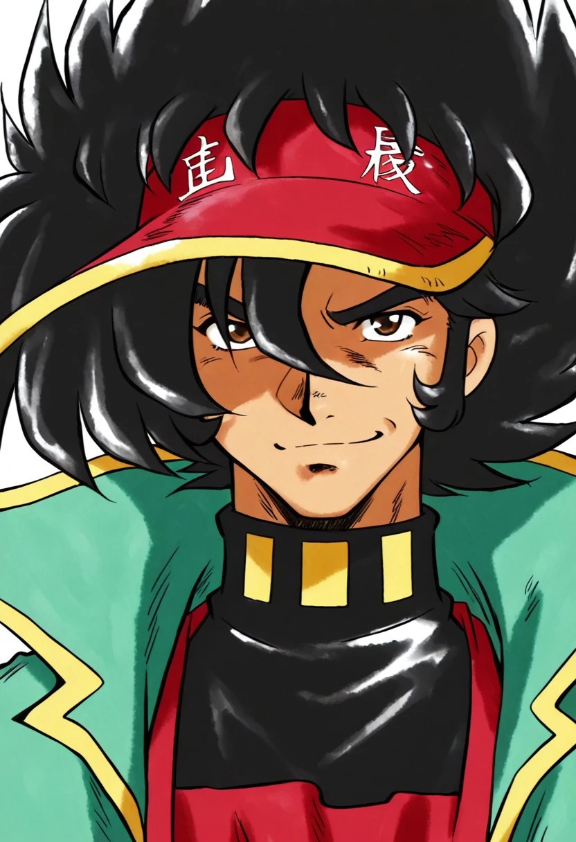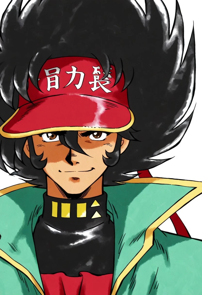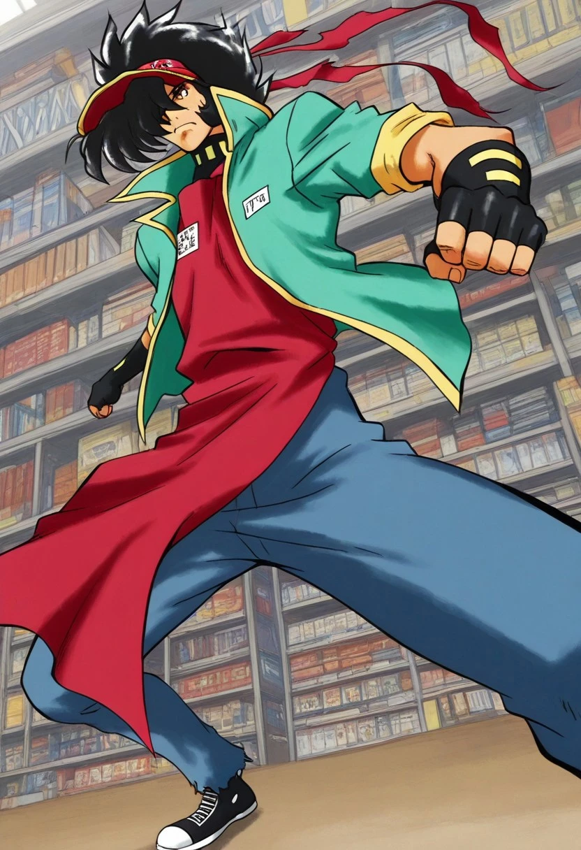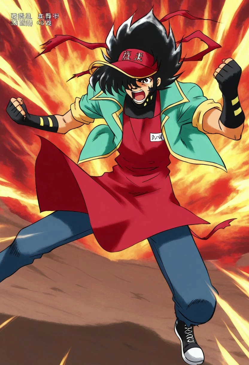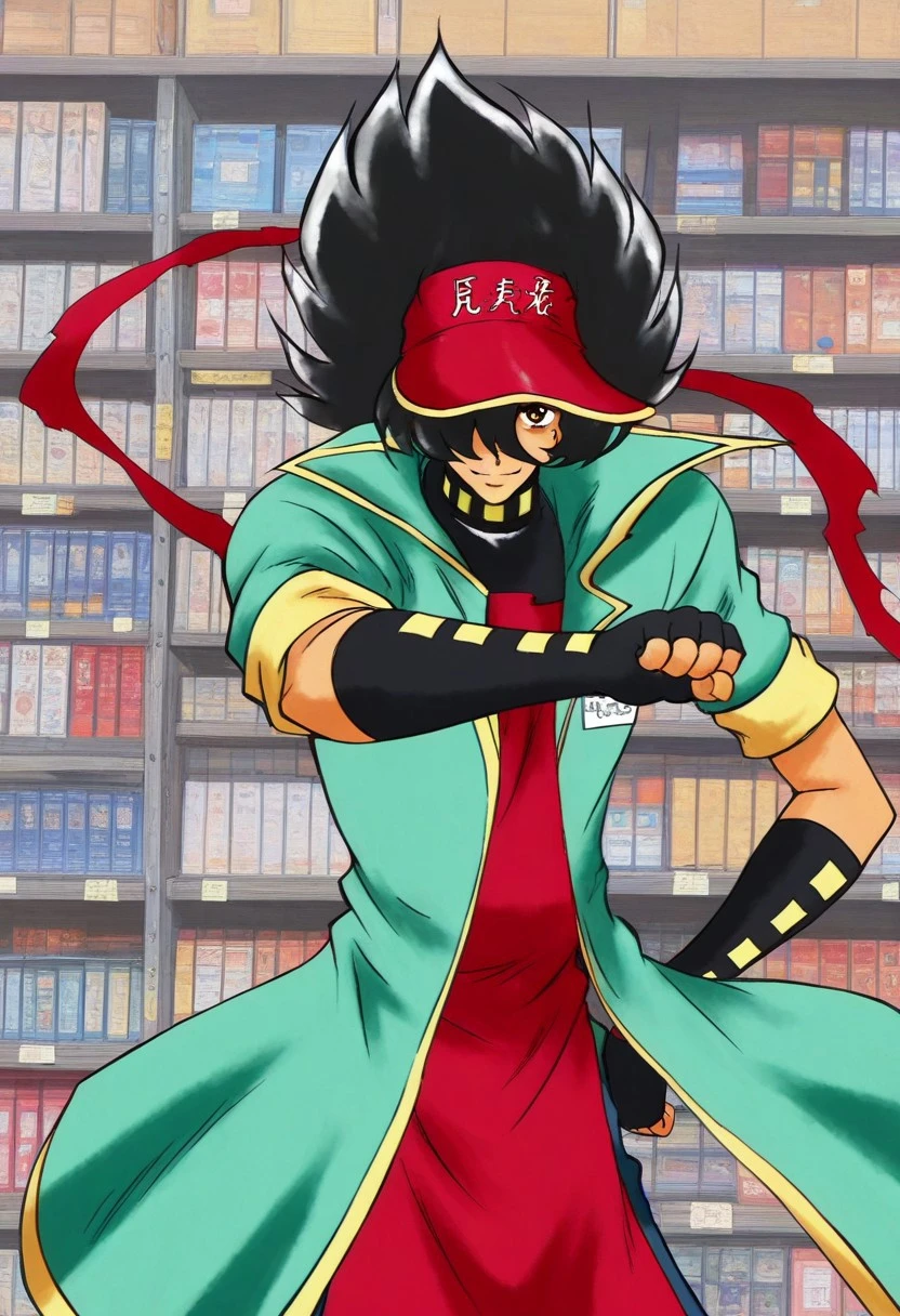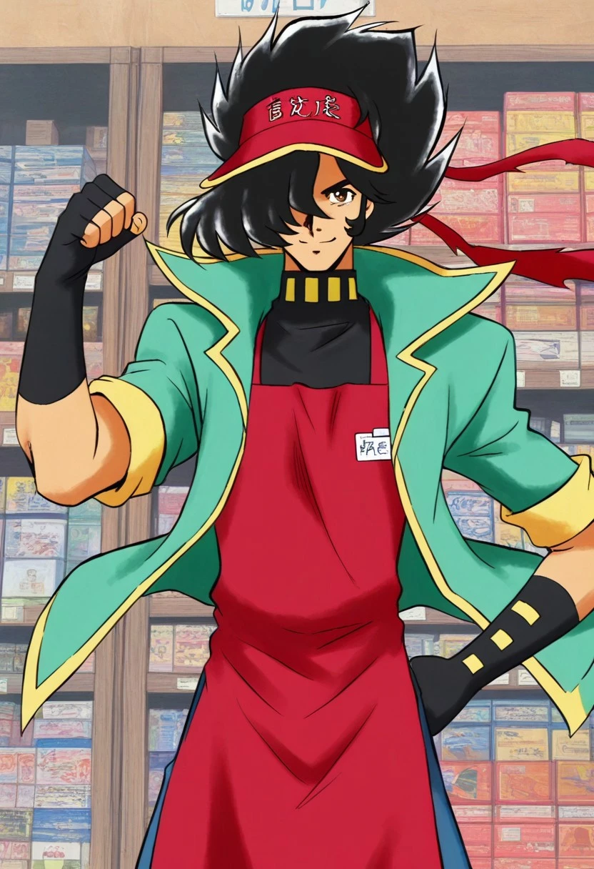 Meito Anizawa, black hair, red visor cap with Japanese letters, long red head bandana, brown eyes, bangs covering one eye, long green , popped collar, rolled sleeves, black turtleneck undershirt, red apron, employee name tag, black fingerless arm gloves, yellow accents, blue pants, black sneakers