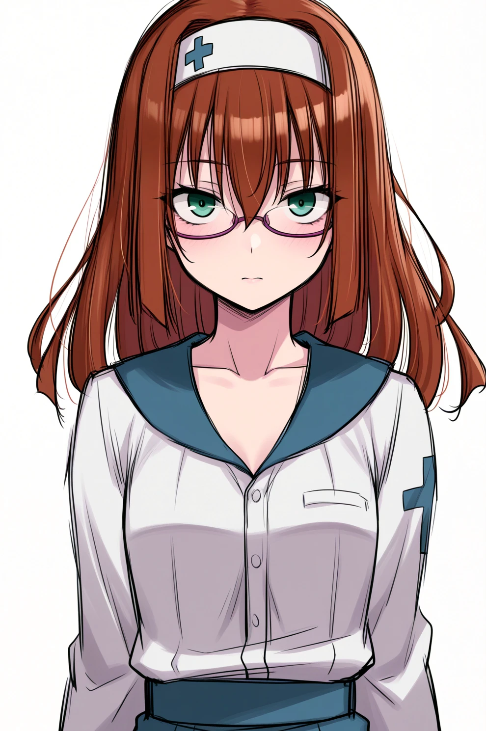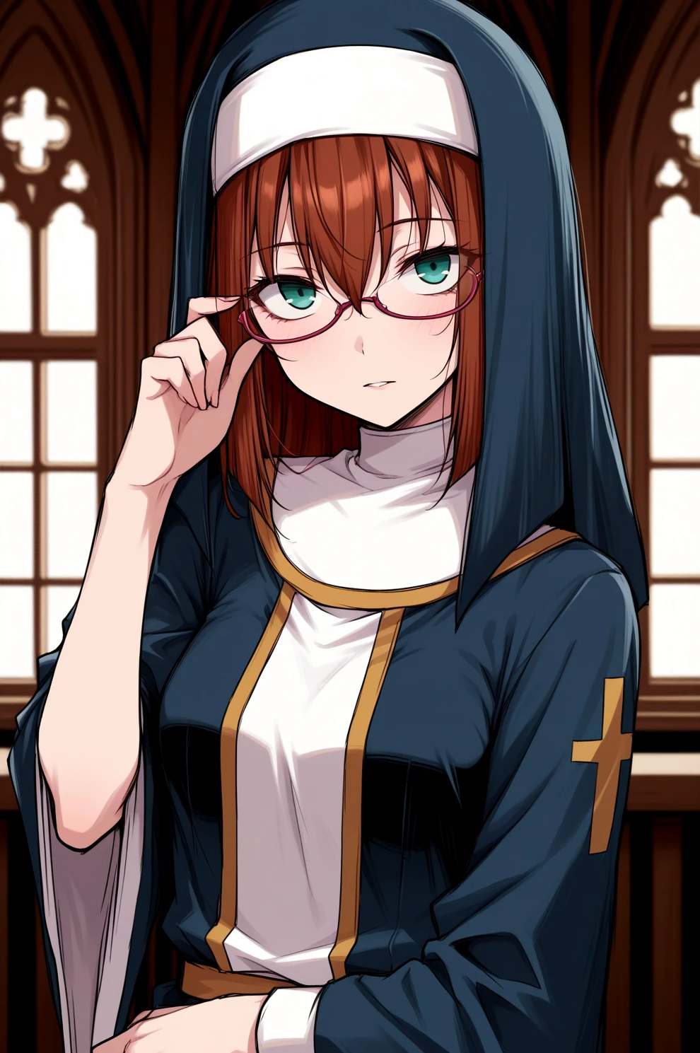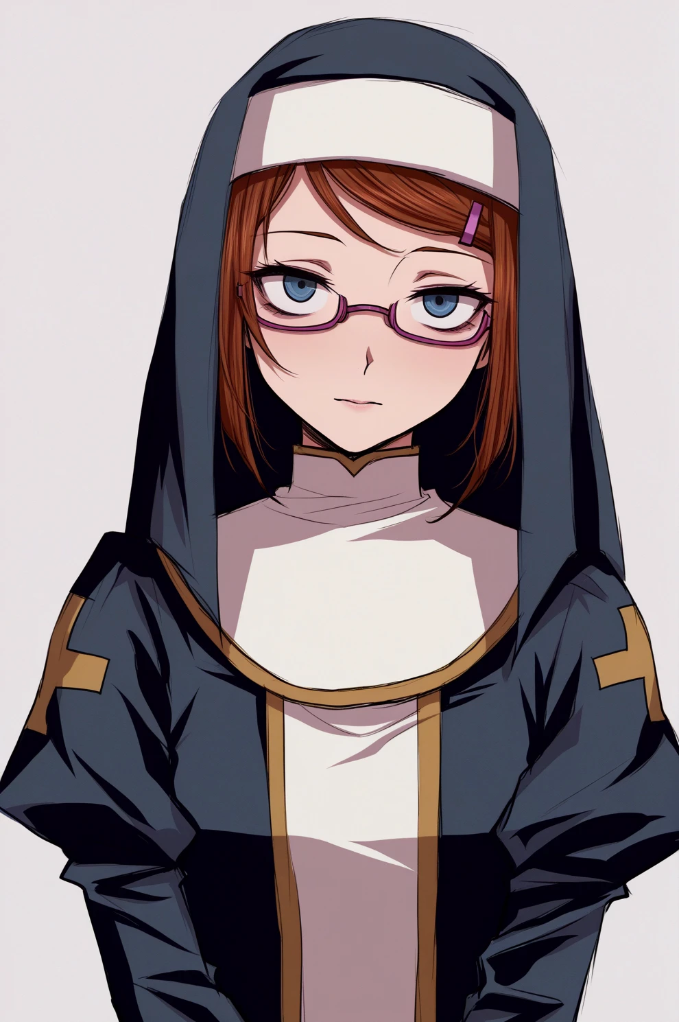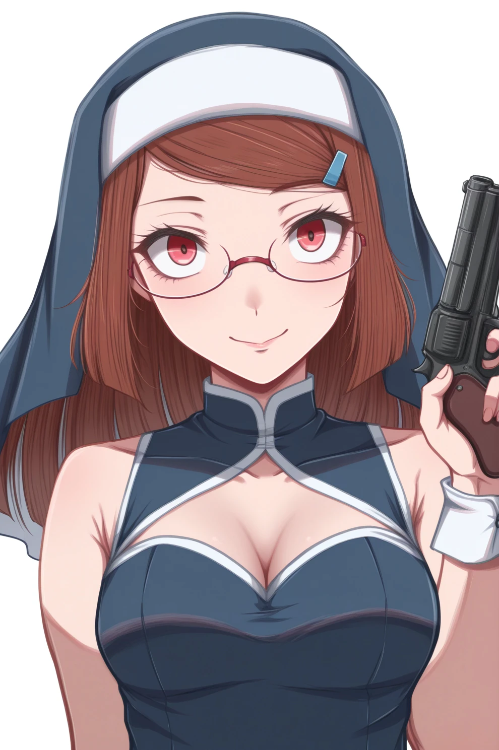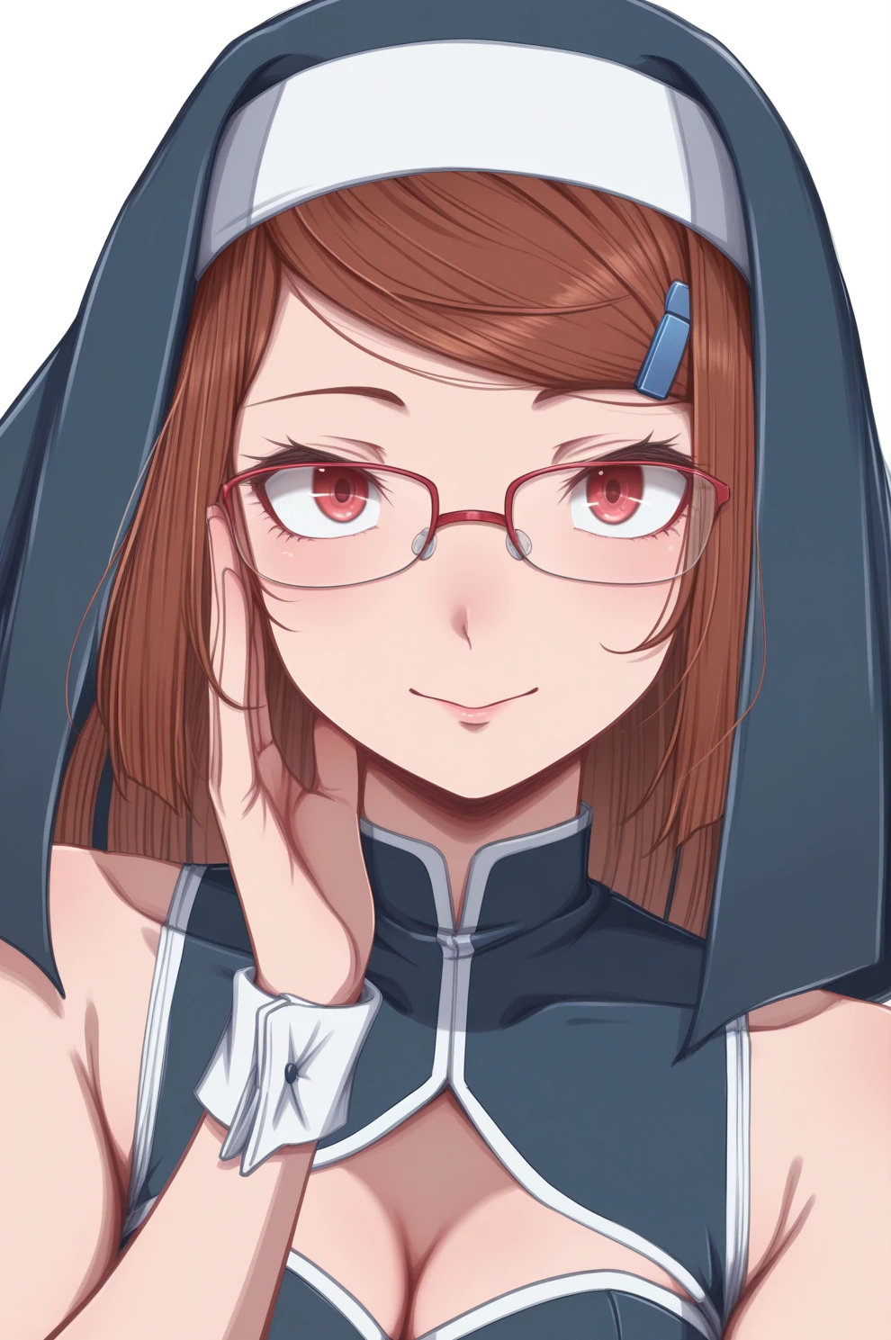kuuron hanten, sleeveless, wrist cuffs, swept bangs, hairclip, nun, red eyes