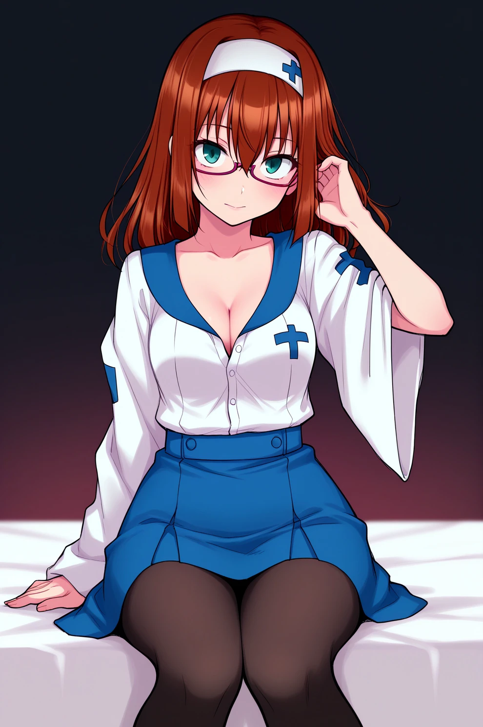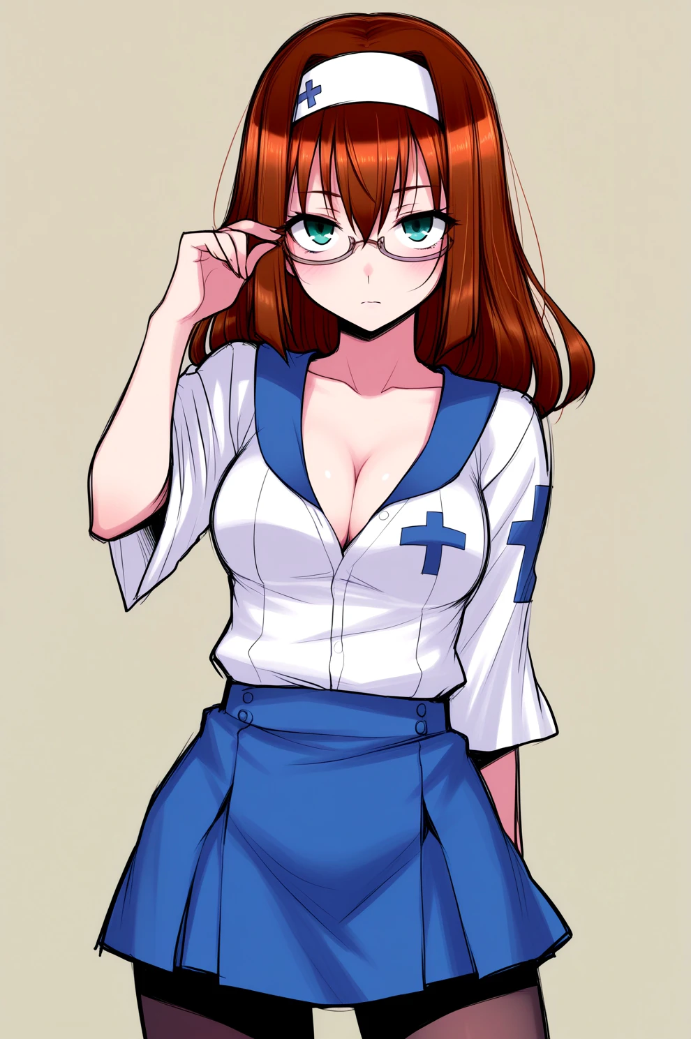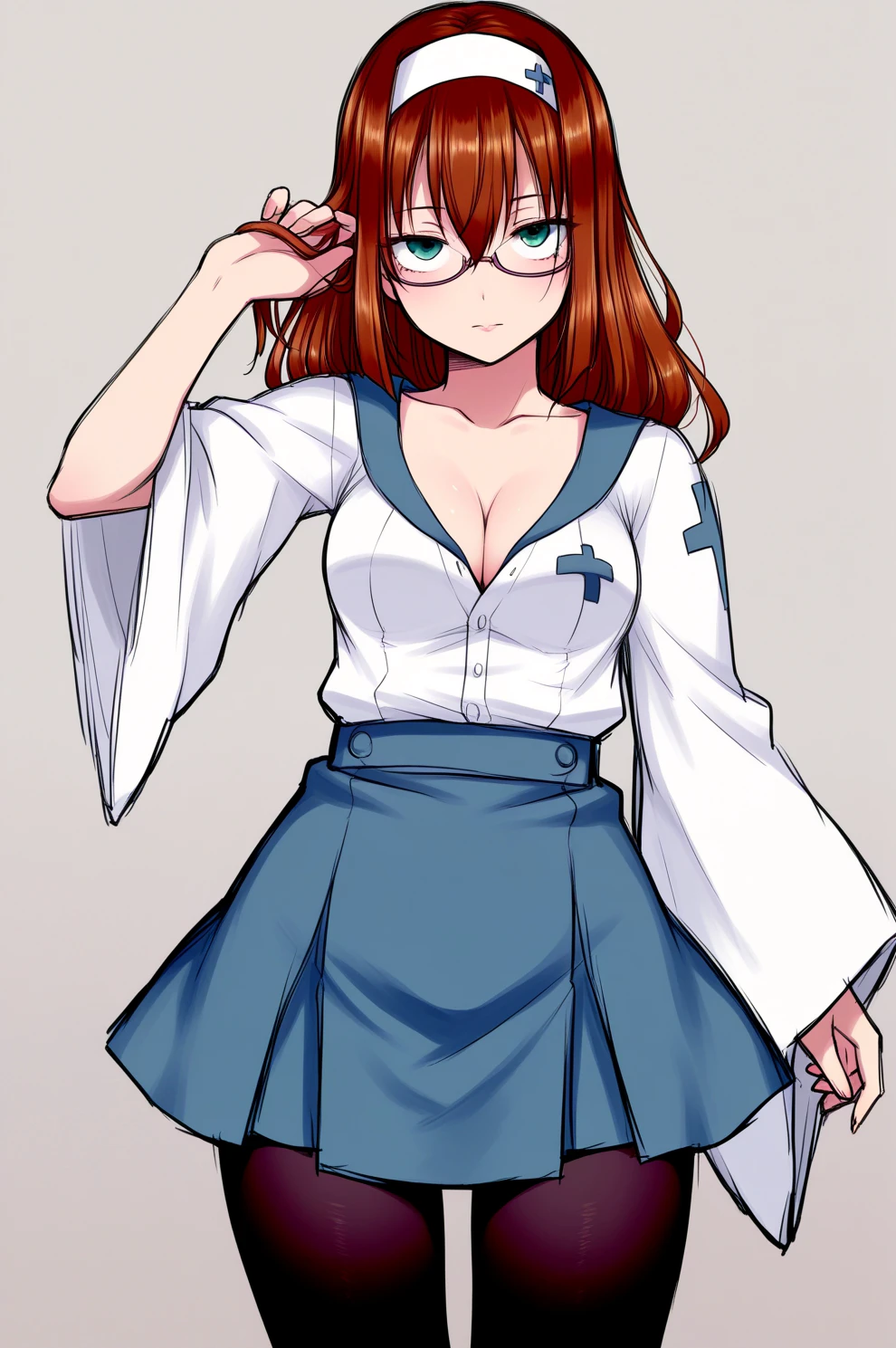 main outfit = cleavage, wide sleeves, blue skirt, pantyhose