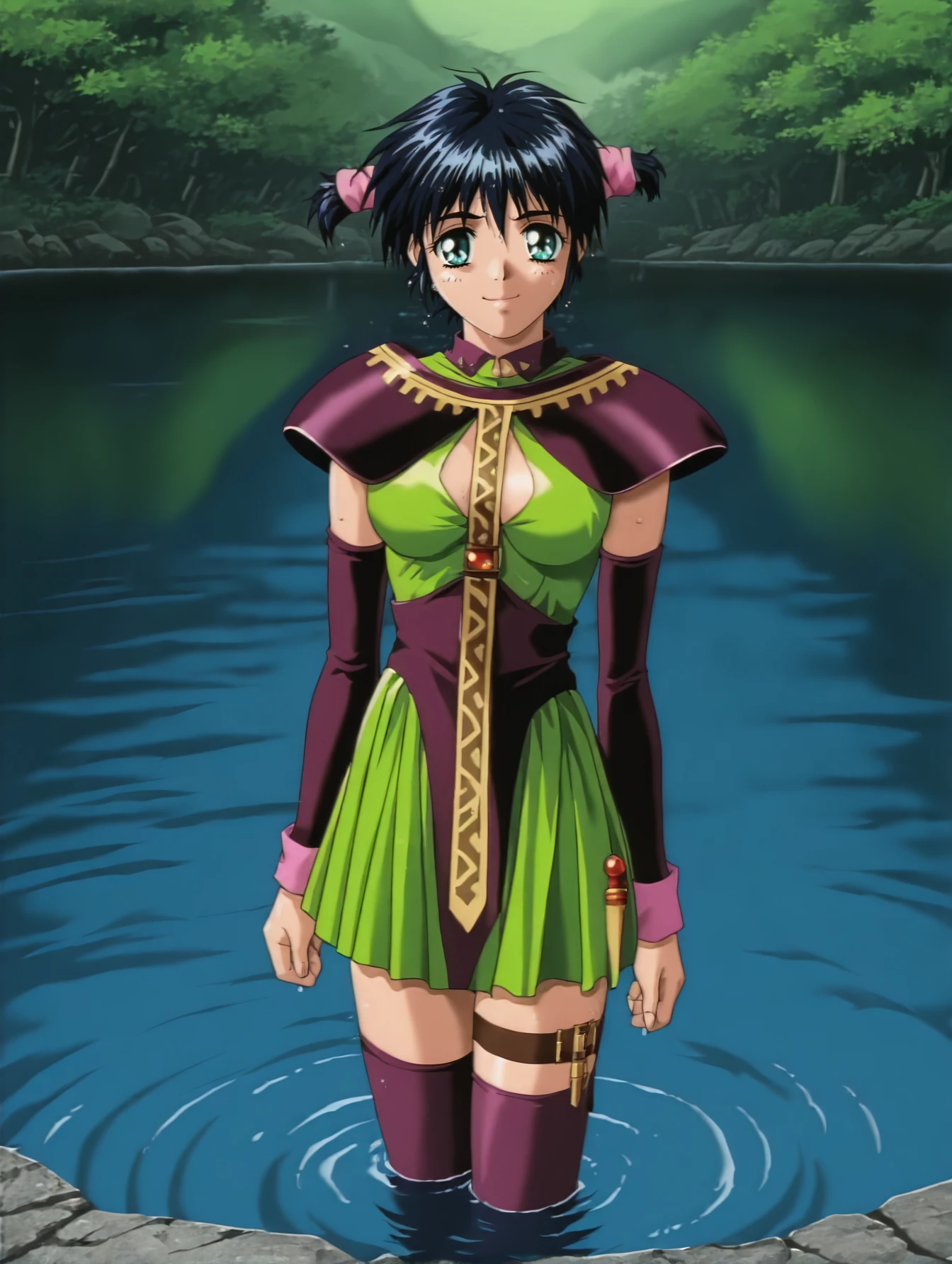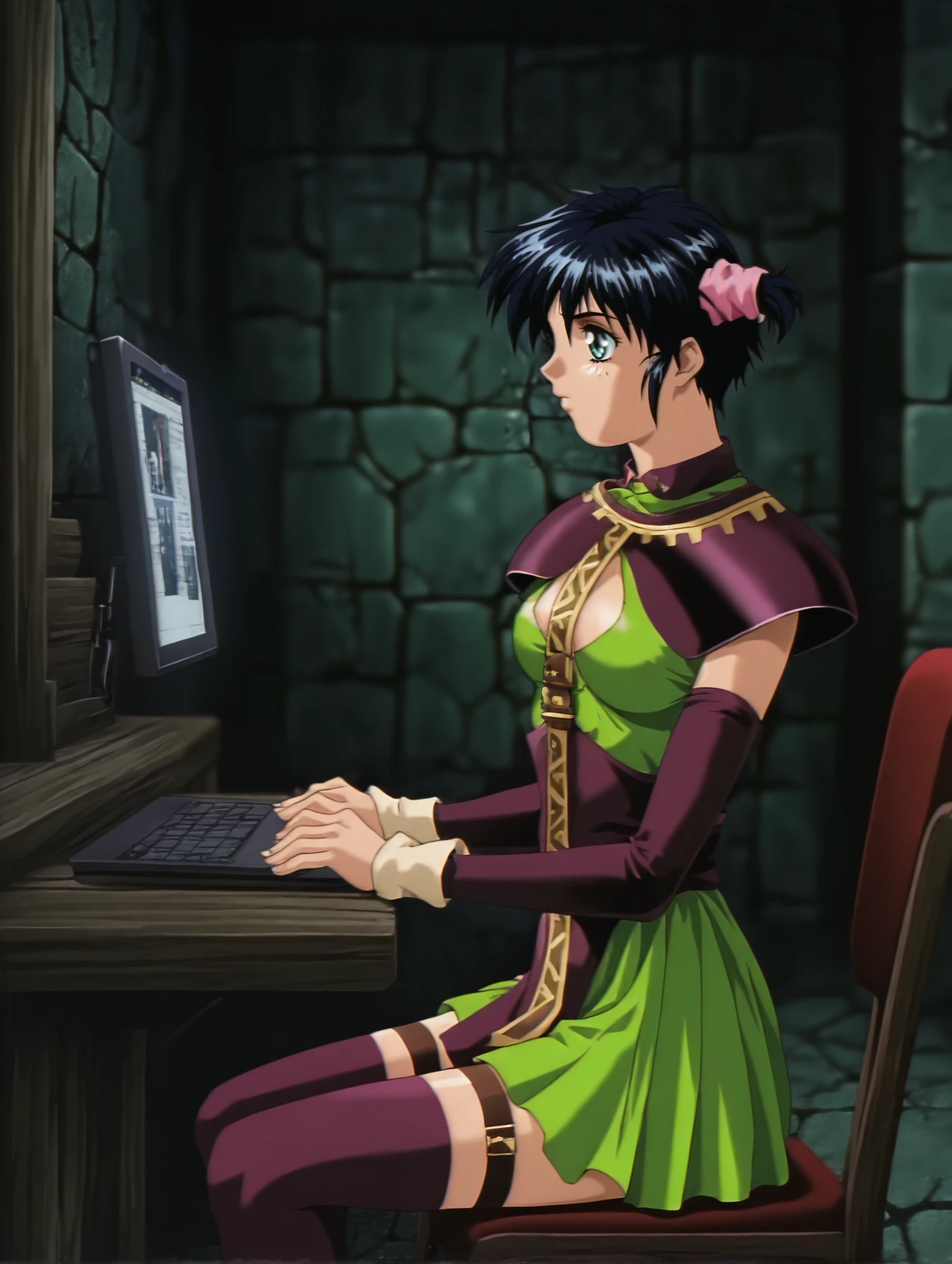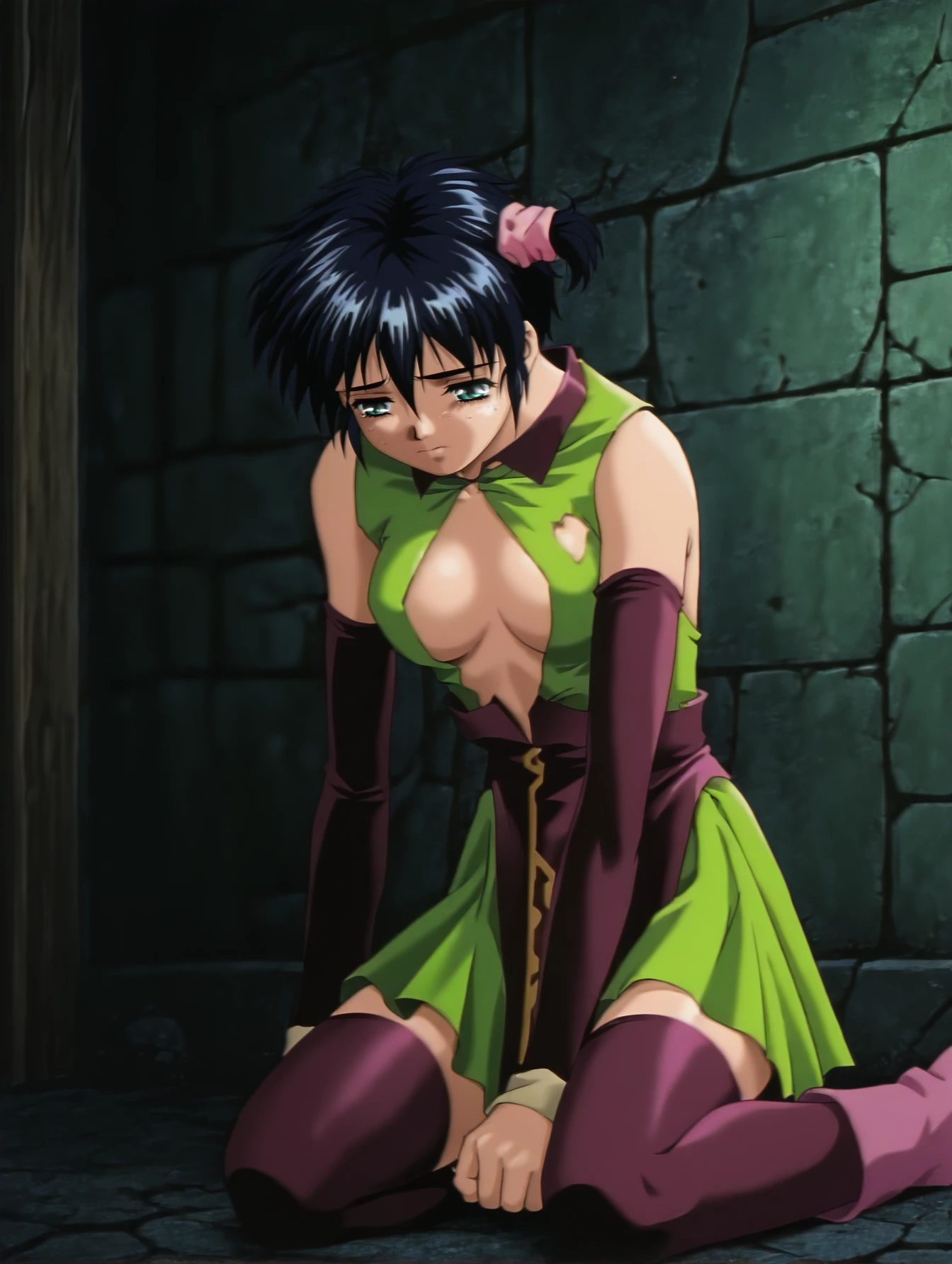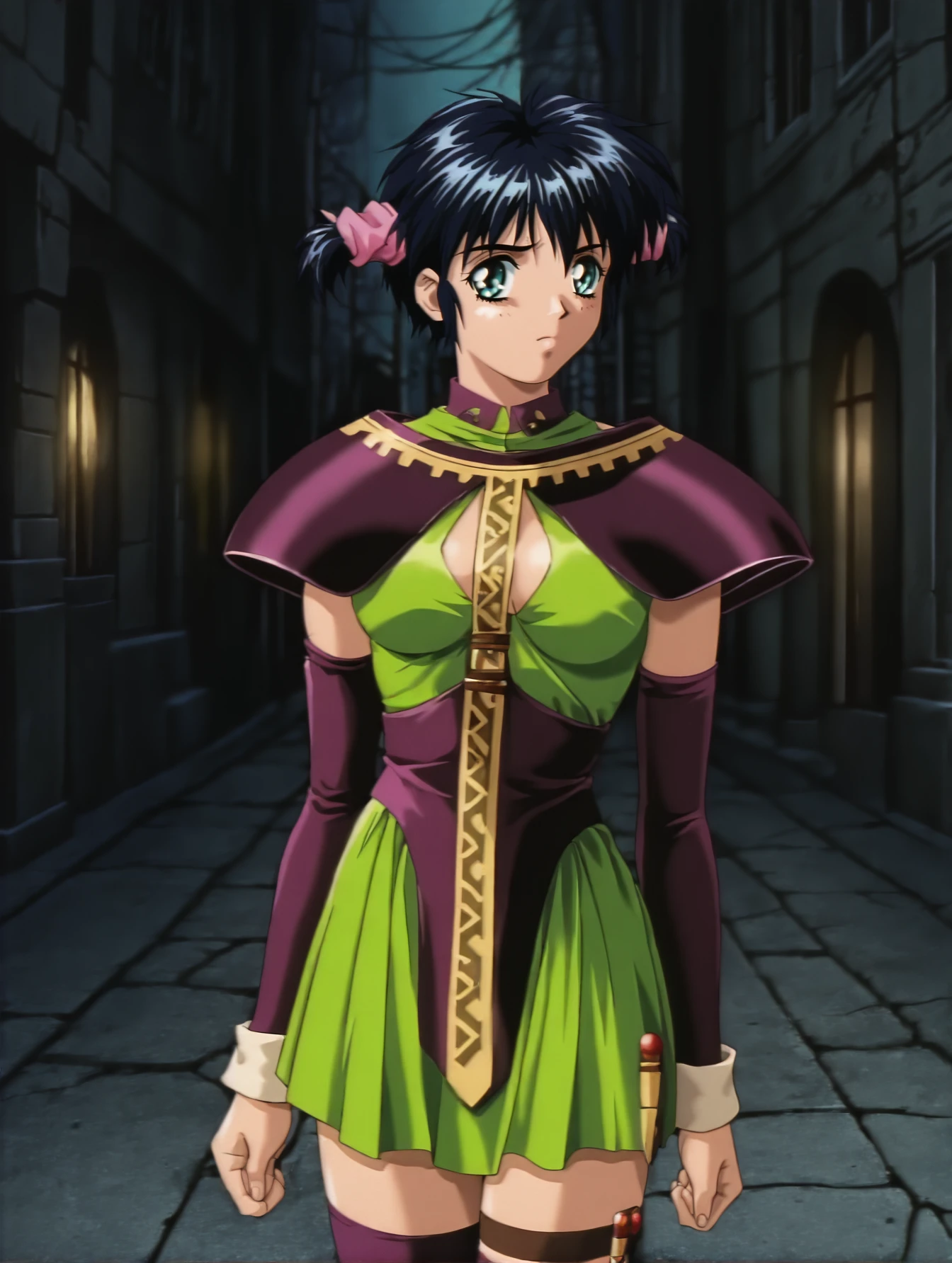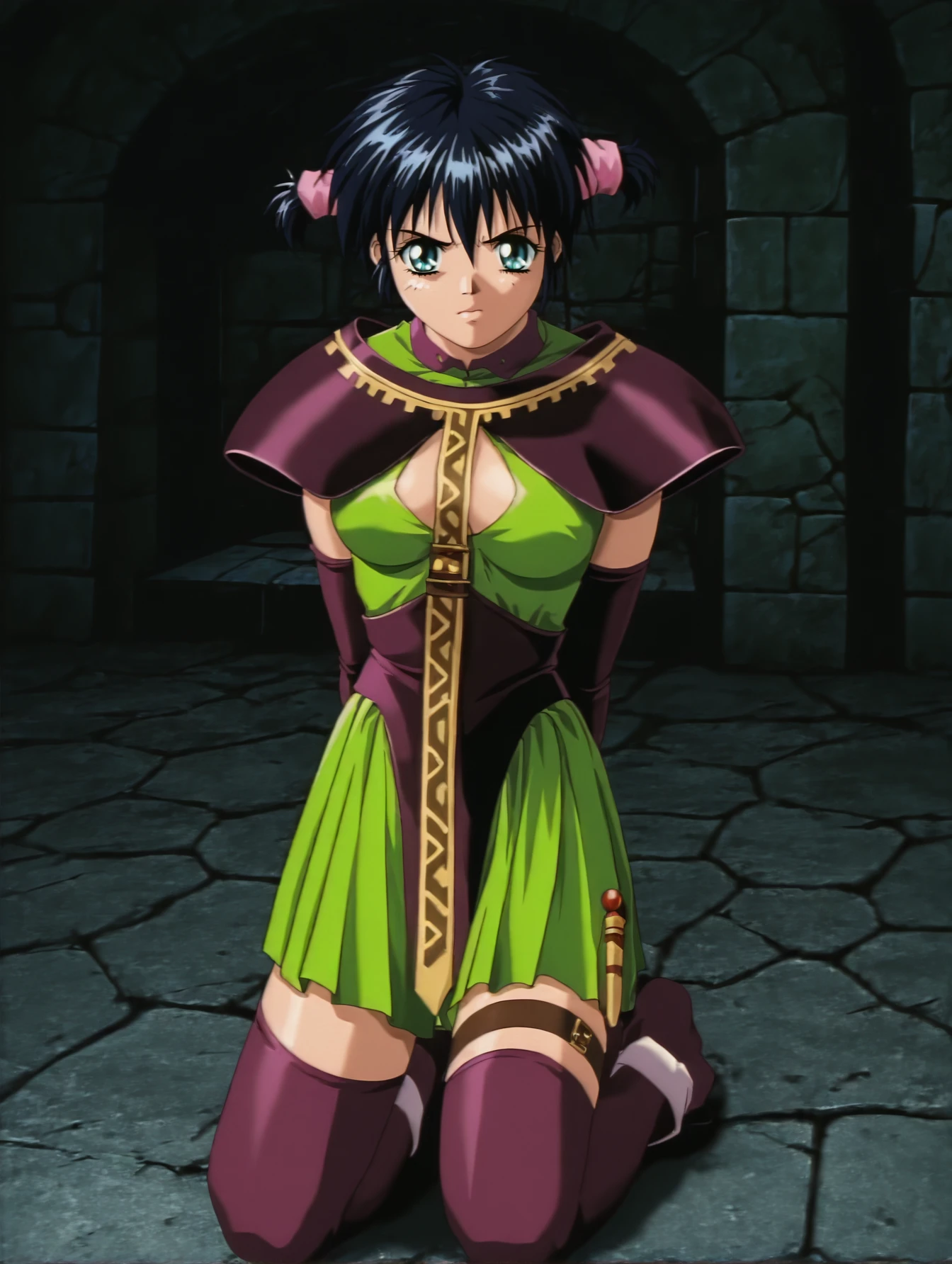 silvanna, shoulder armor, green dress, detached sleeves, long tie, purple thighhighs