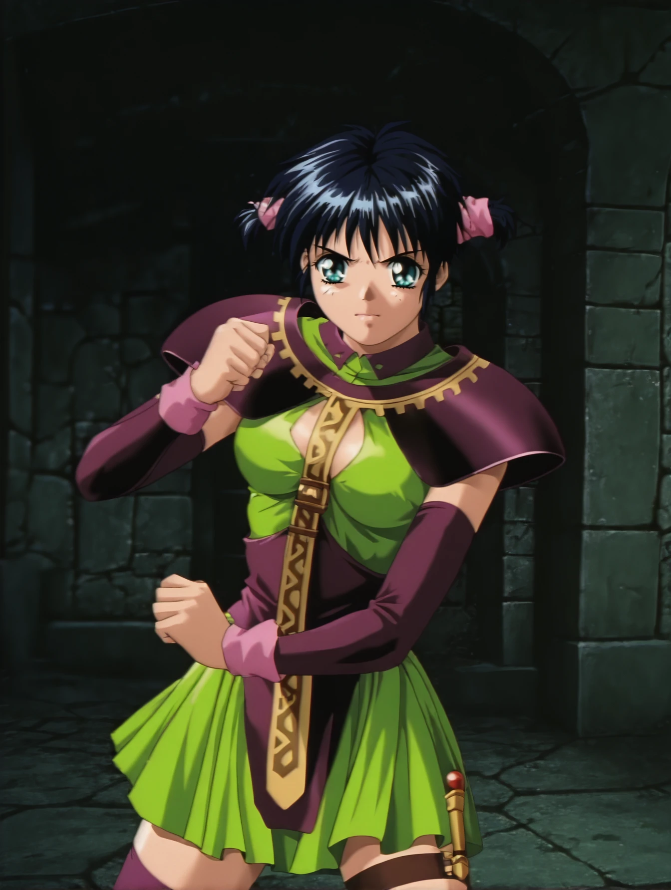 pony trigger: silvanna, green dress, purple thighhighs
