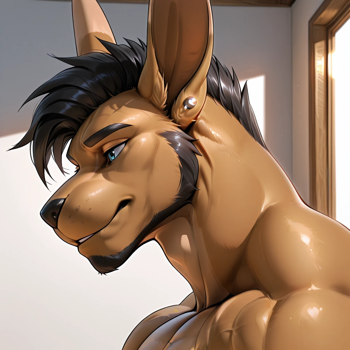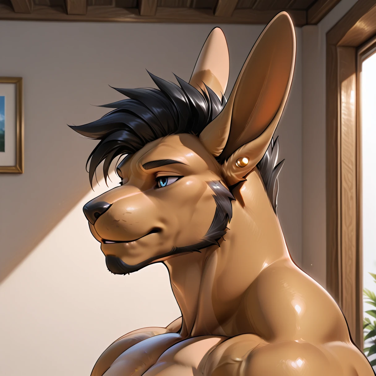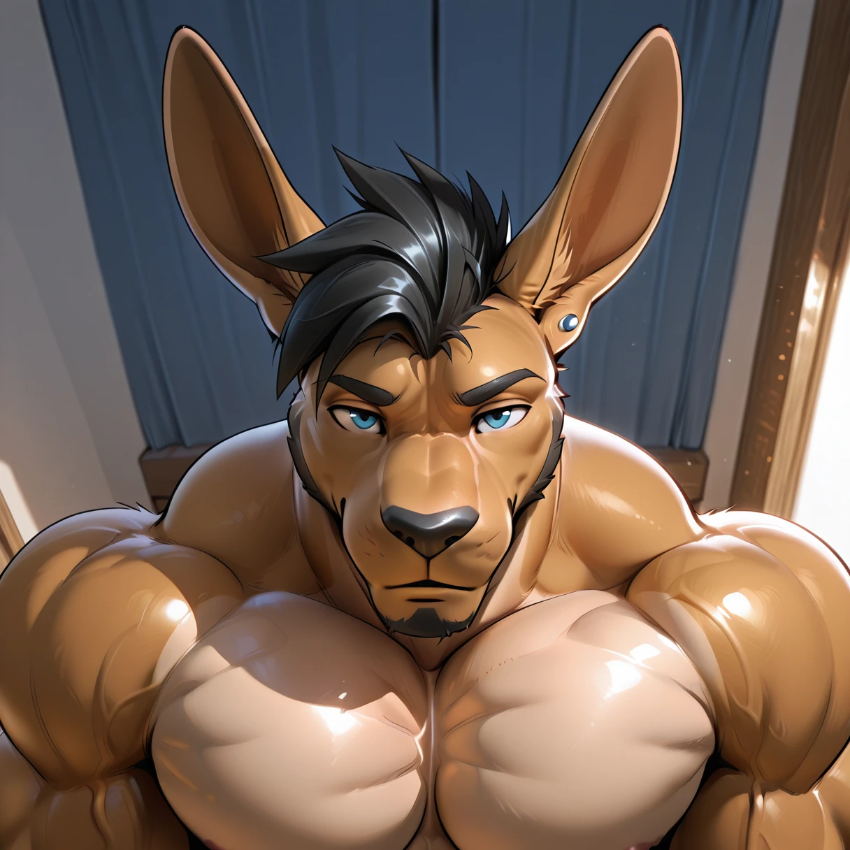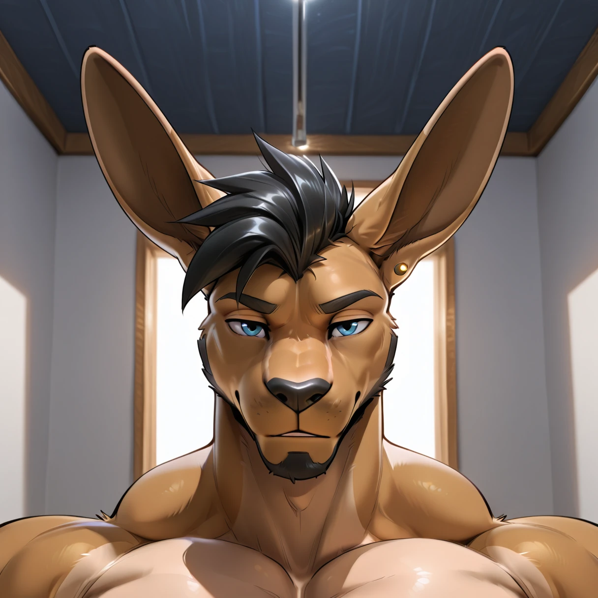 furry, anthro, kangaroo, male, two-tone fur, brown fur, white fur, blue eyes, black mohawk hair, black beard