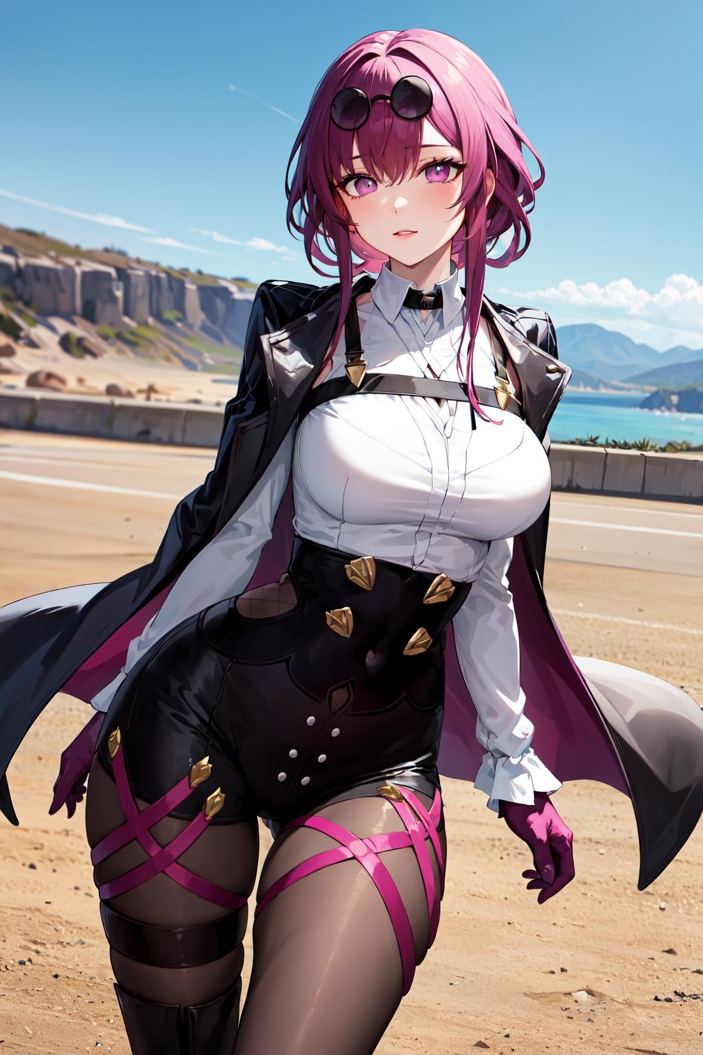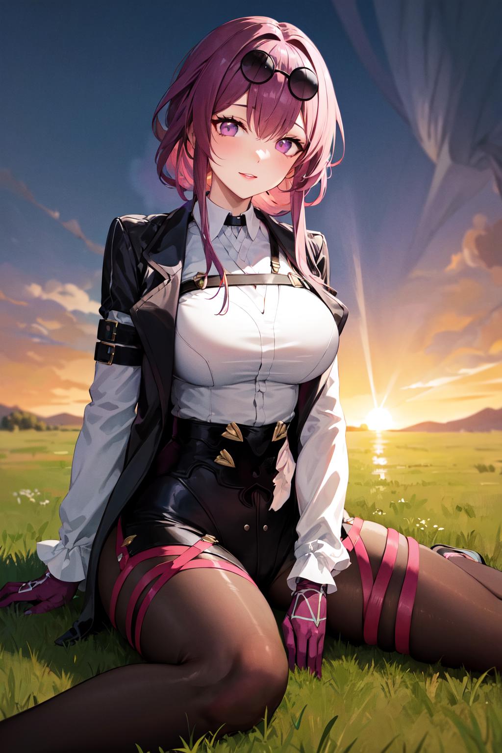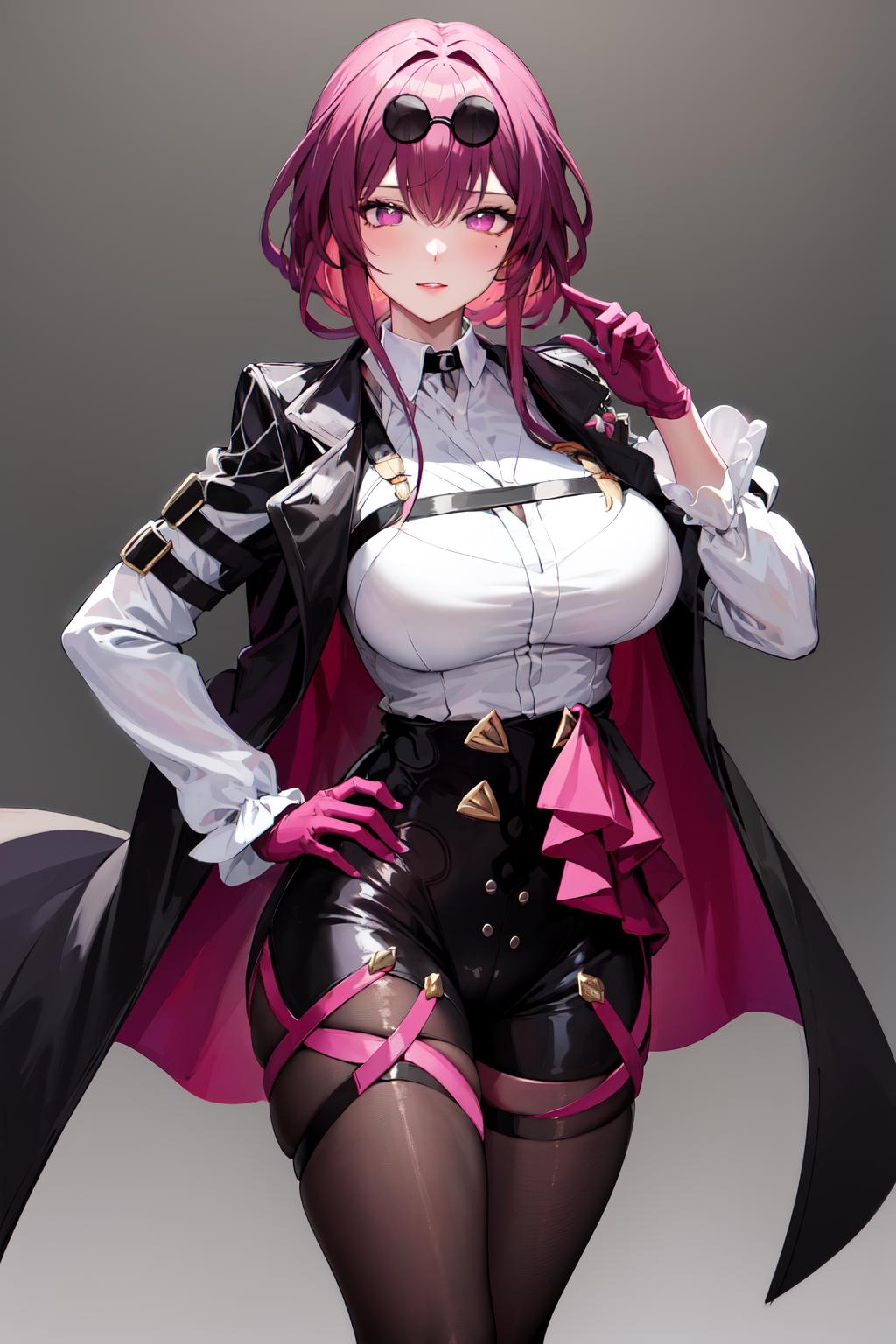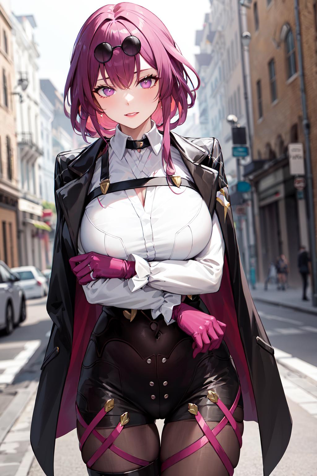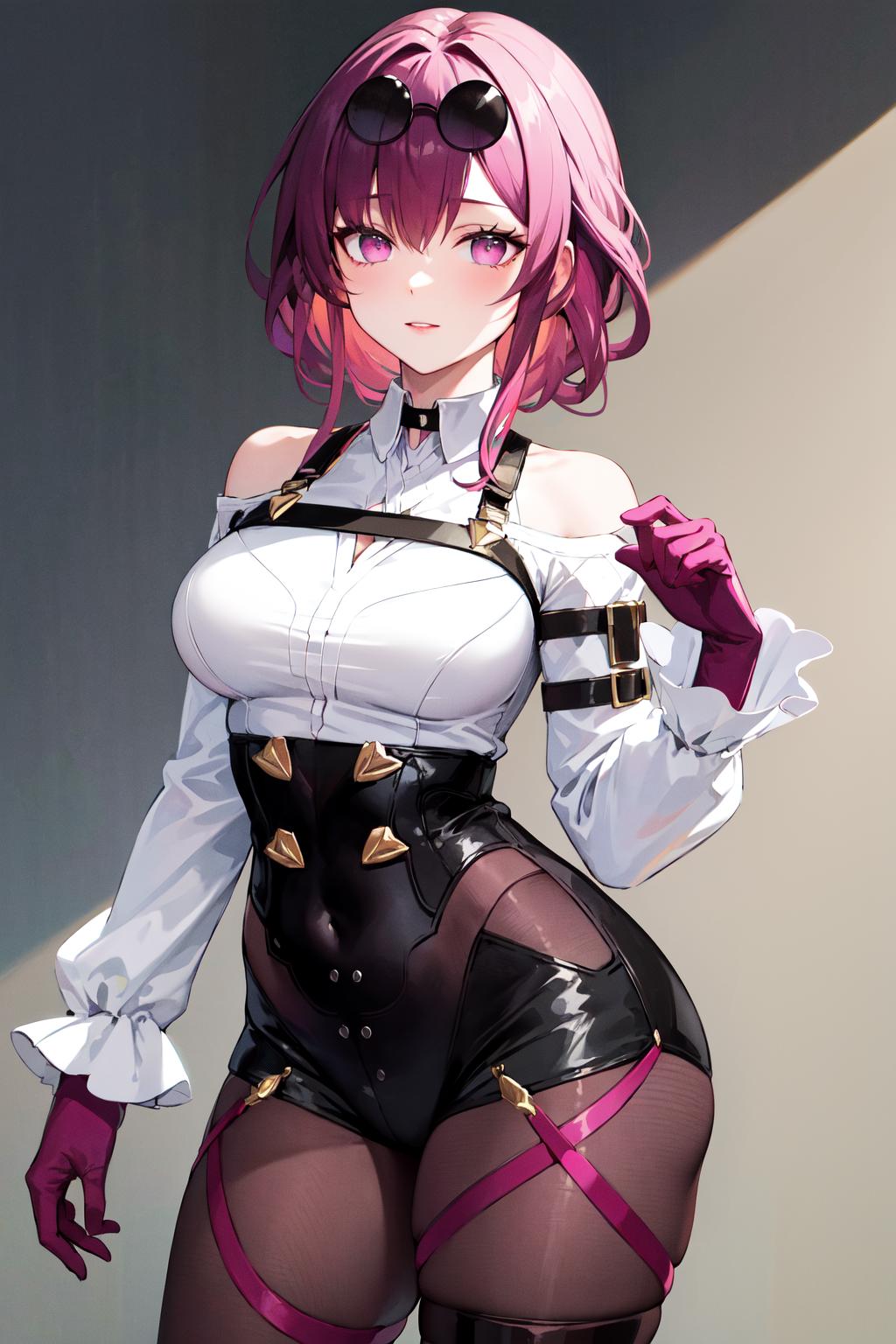 outfit1 (no jacket)aakafka, sunglasses, eyewear on head, harness, shoulder cutout, white shirt, collared shirt, long sleeves, white sleeves, purple gloves, black shorts, thigh strap, pantyhose