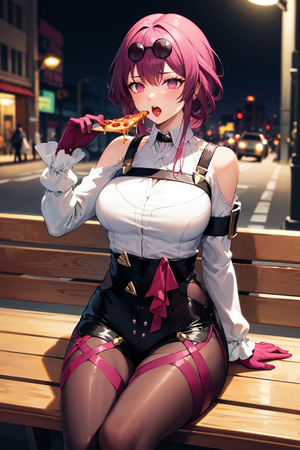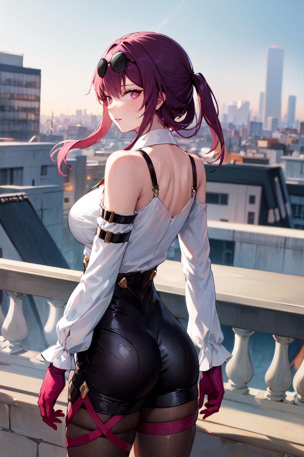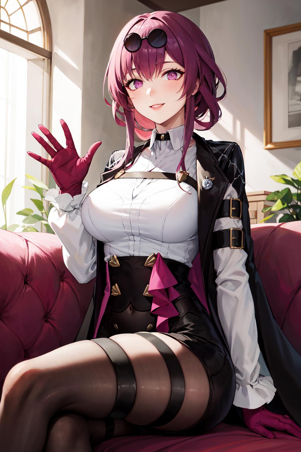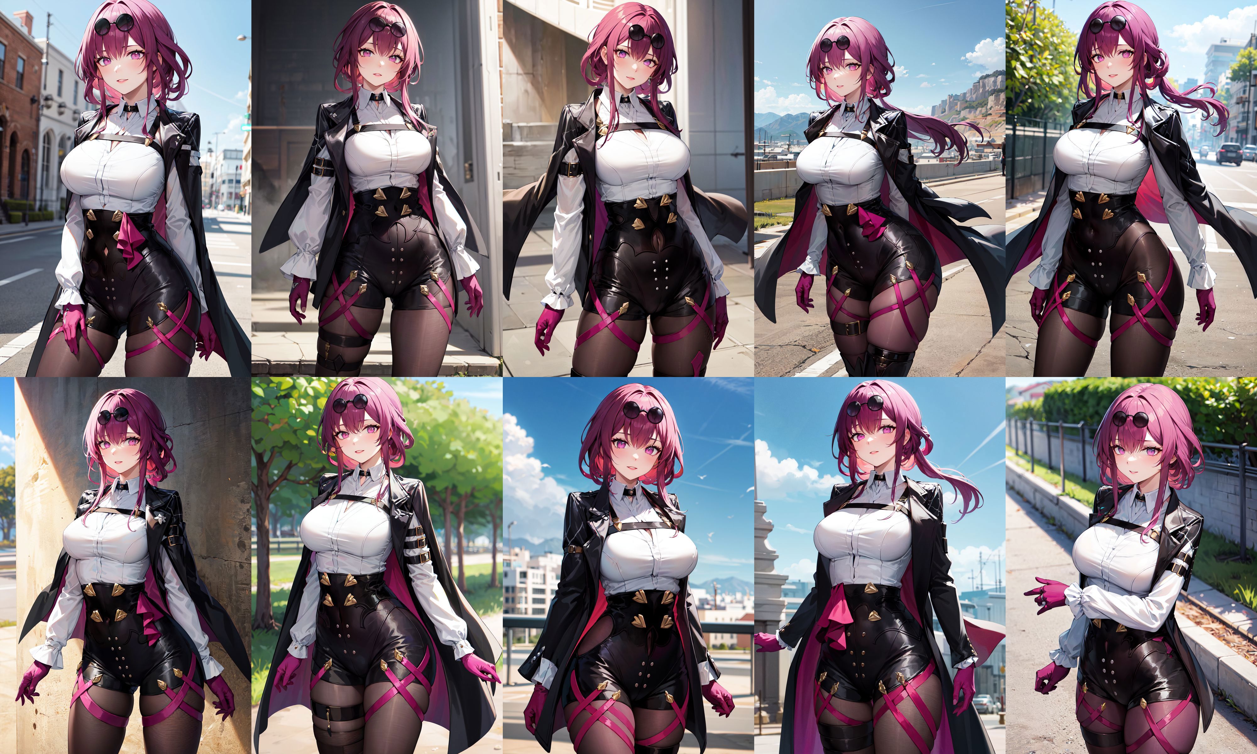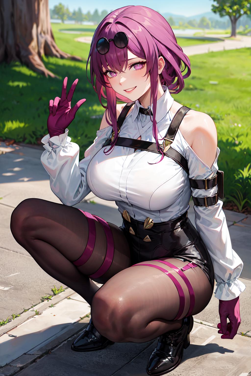 outfit1 (no jacket)aakafka, sunglasses, eyewear on head, harness, shoulder cutout, white shirt, collared shirt, long sleeves, white sleeves, purple gloves, black shorts, thigh strap, pantyhose