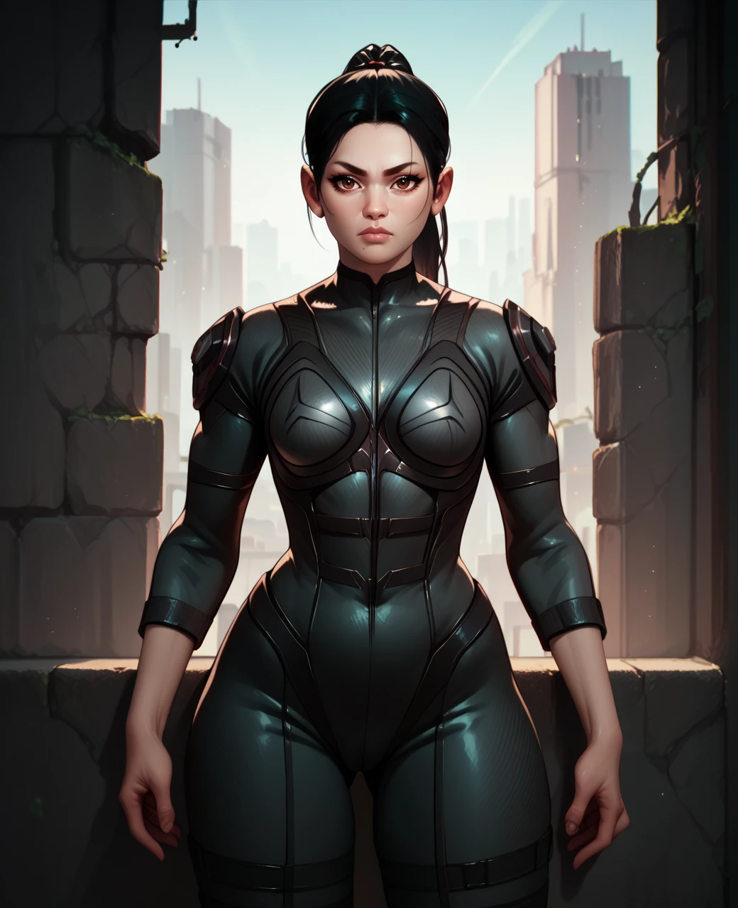 armor, dark bodysuit, or blue / black bodysuit, boots,