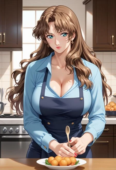 zeshiko, 1girl,blue eyes,brown hair,long hair,wavy hair,large breasts,nail polish,mature female