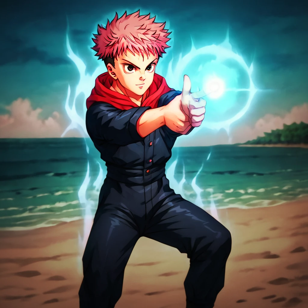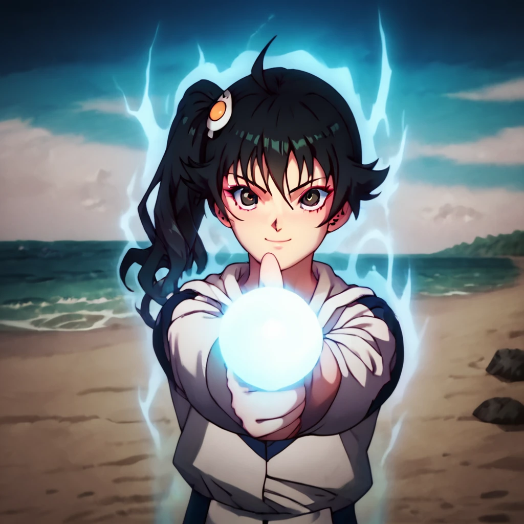 spirit gun, finger gun, blue energy ball, aura, pointing to the side