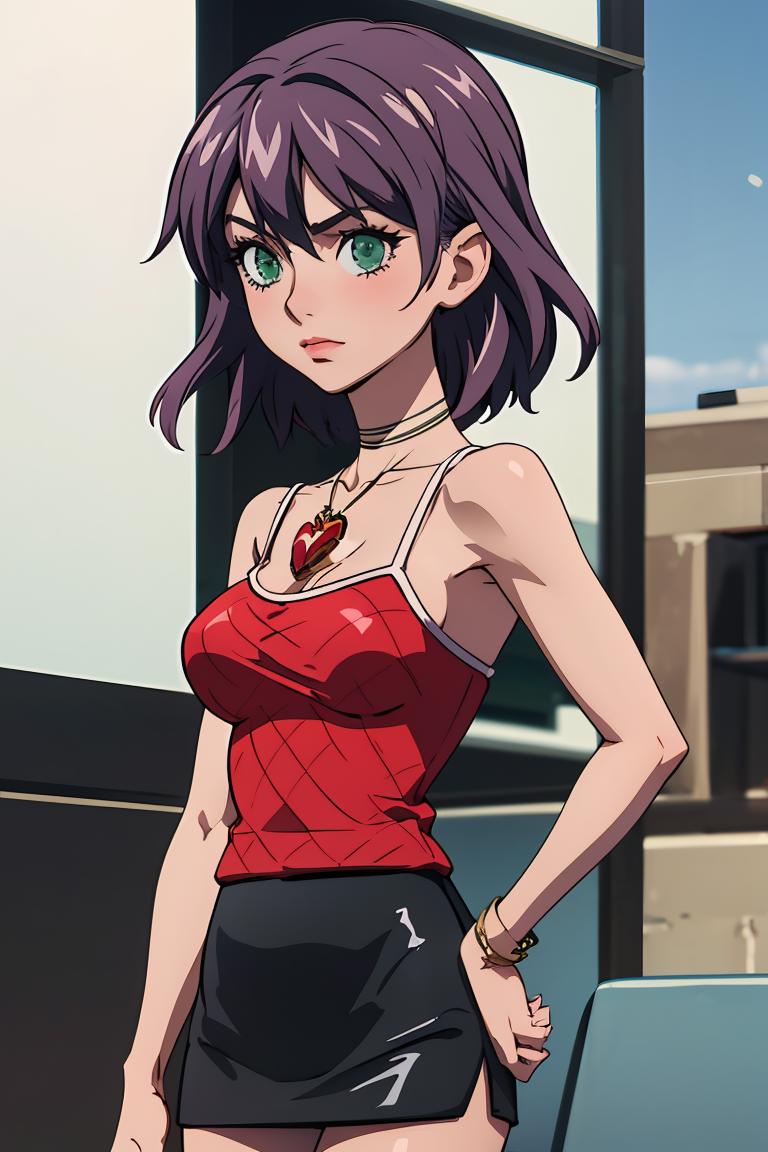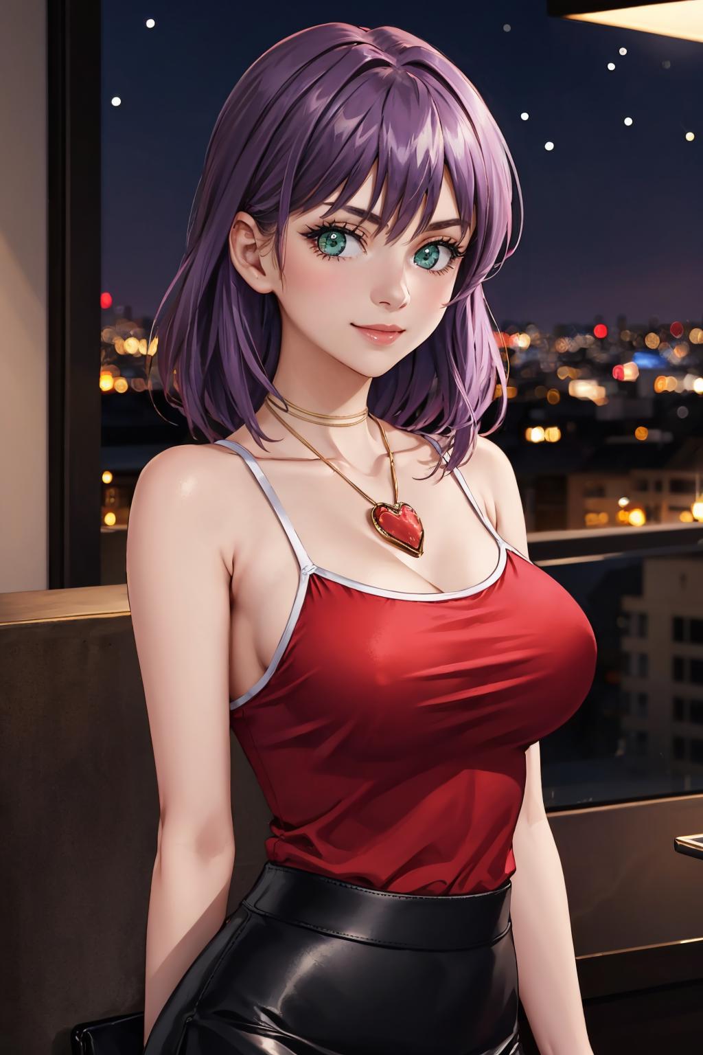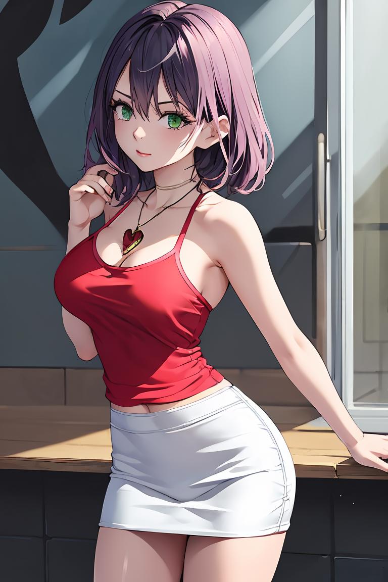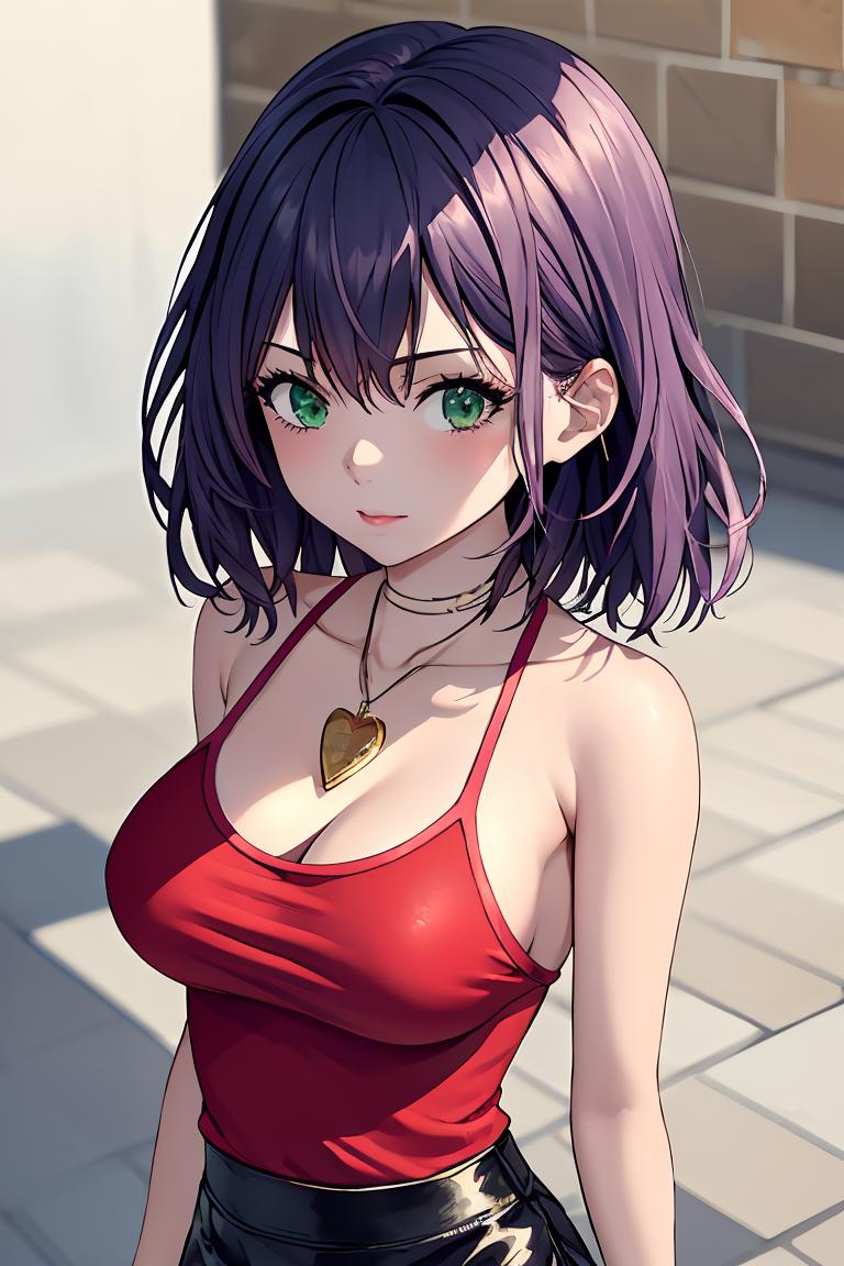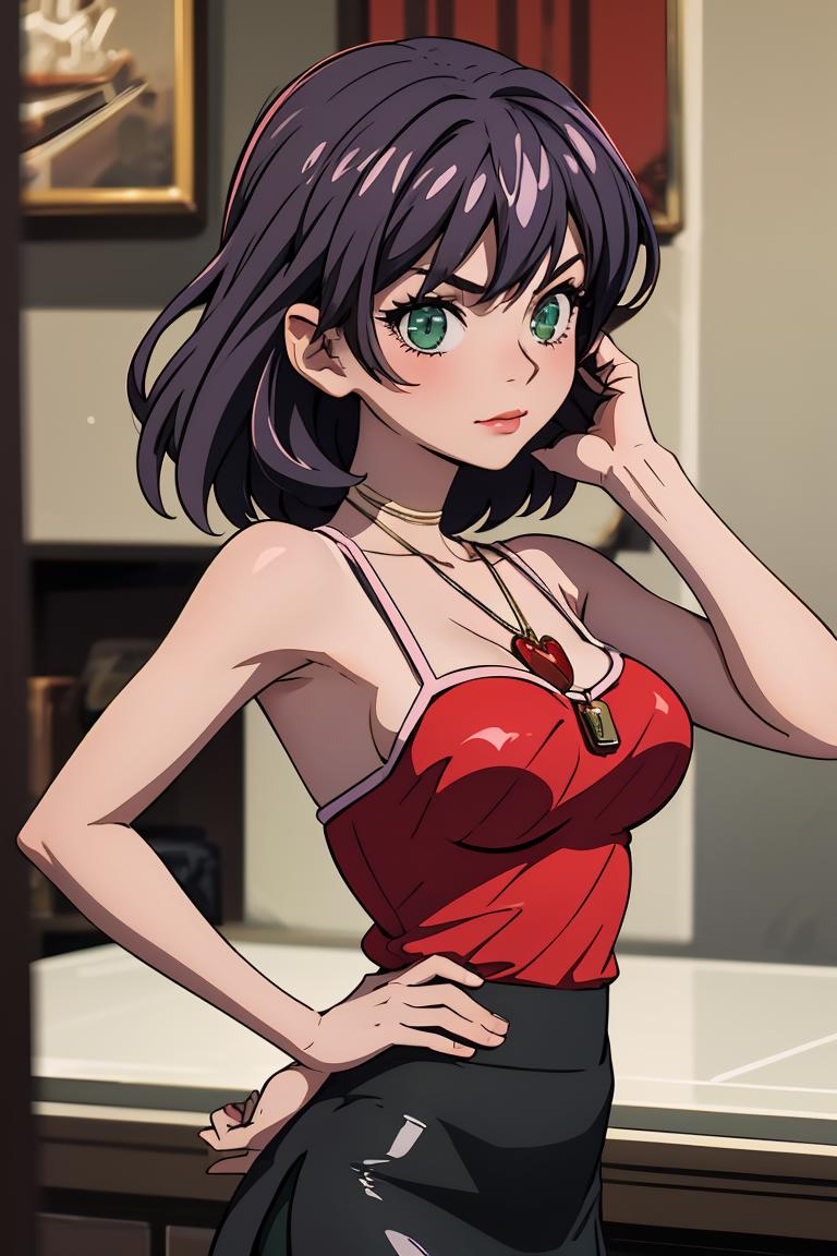 Add "necklace, red camisole, pencil skirt, black skirt" for her typical look.
