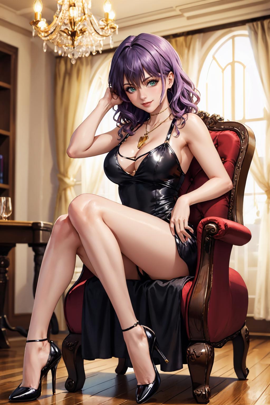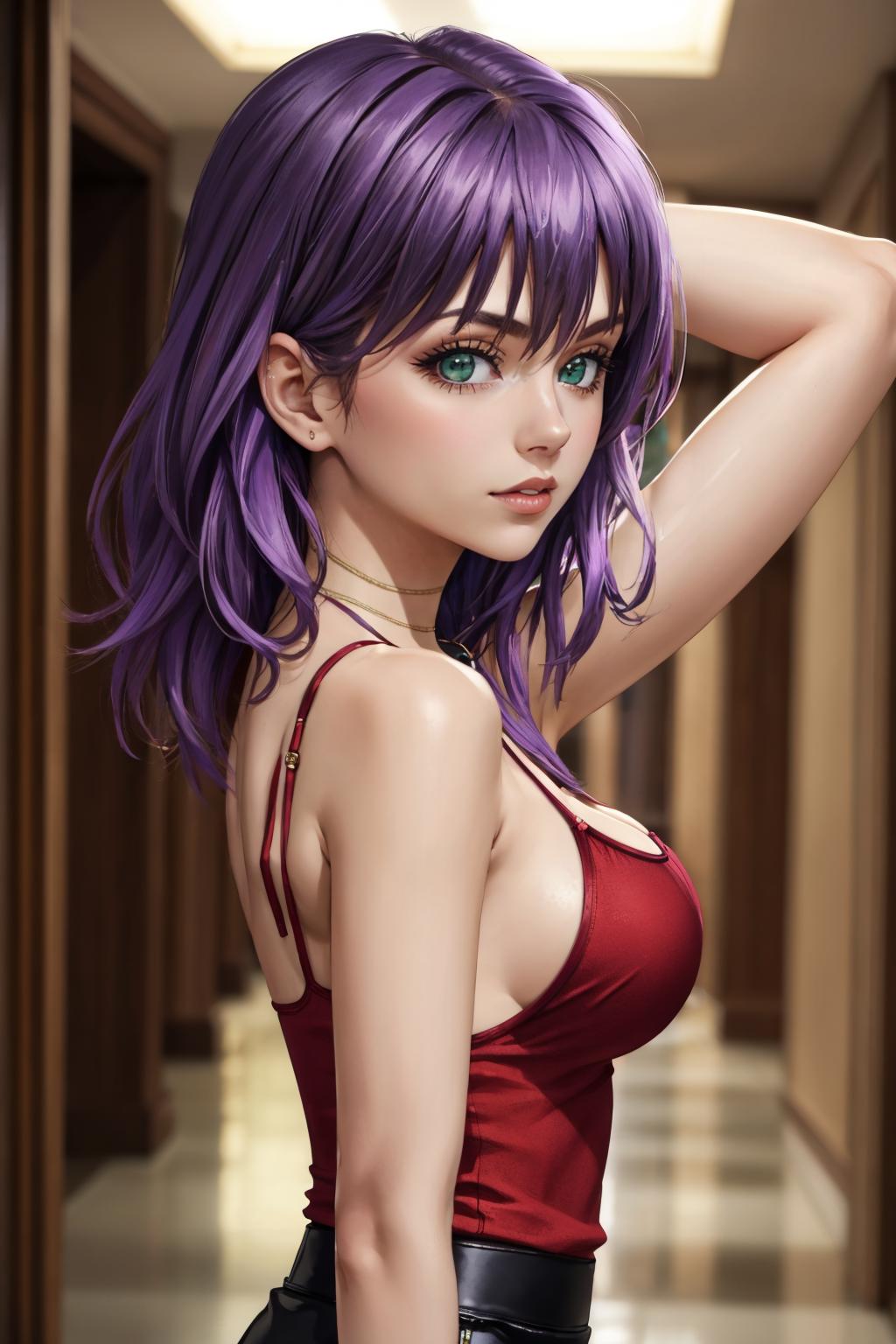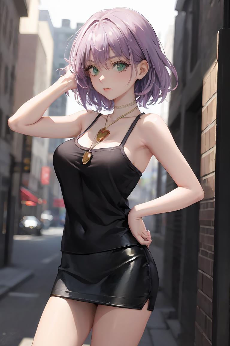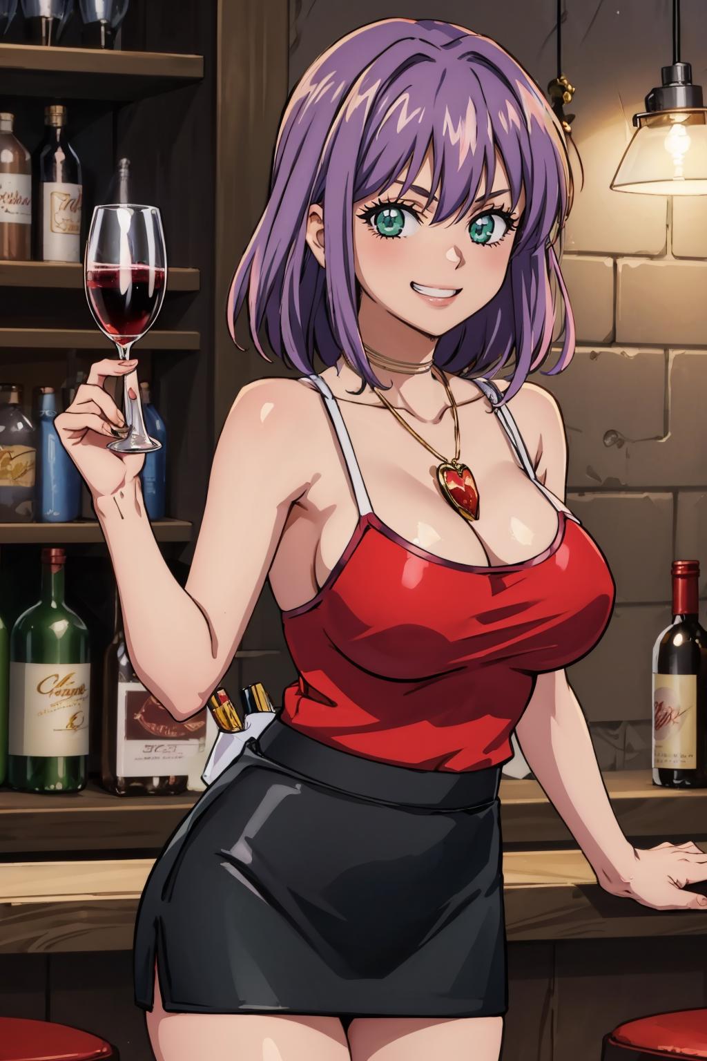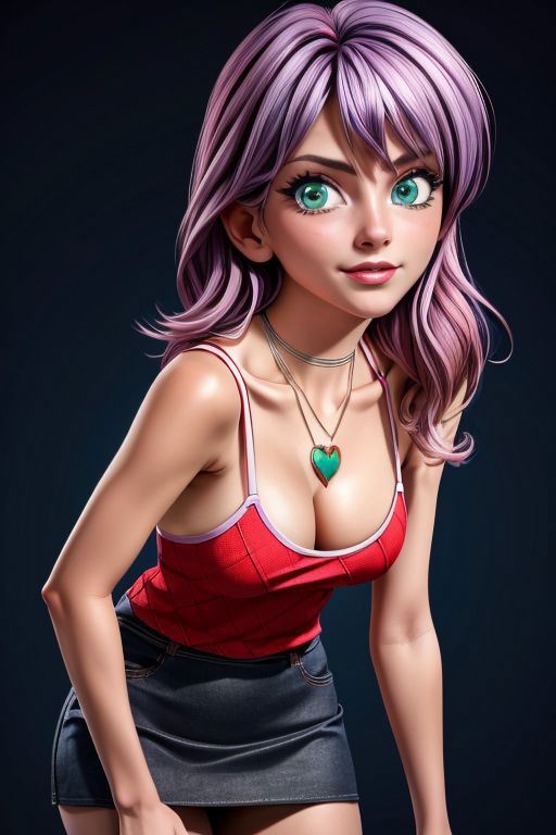 Add "necklace, red camisole, pencil skirt, black skirt" for her typical look.