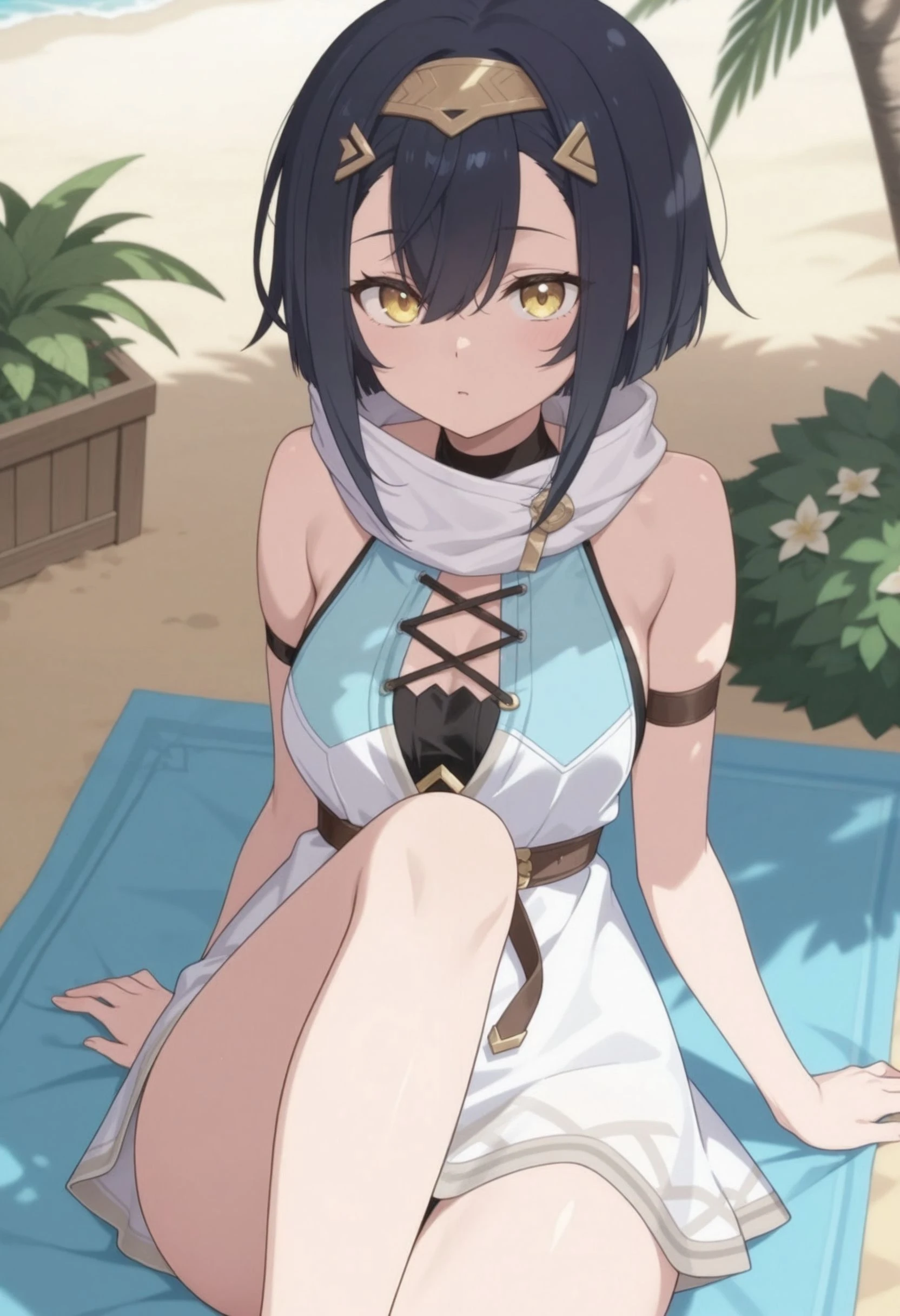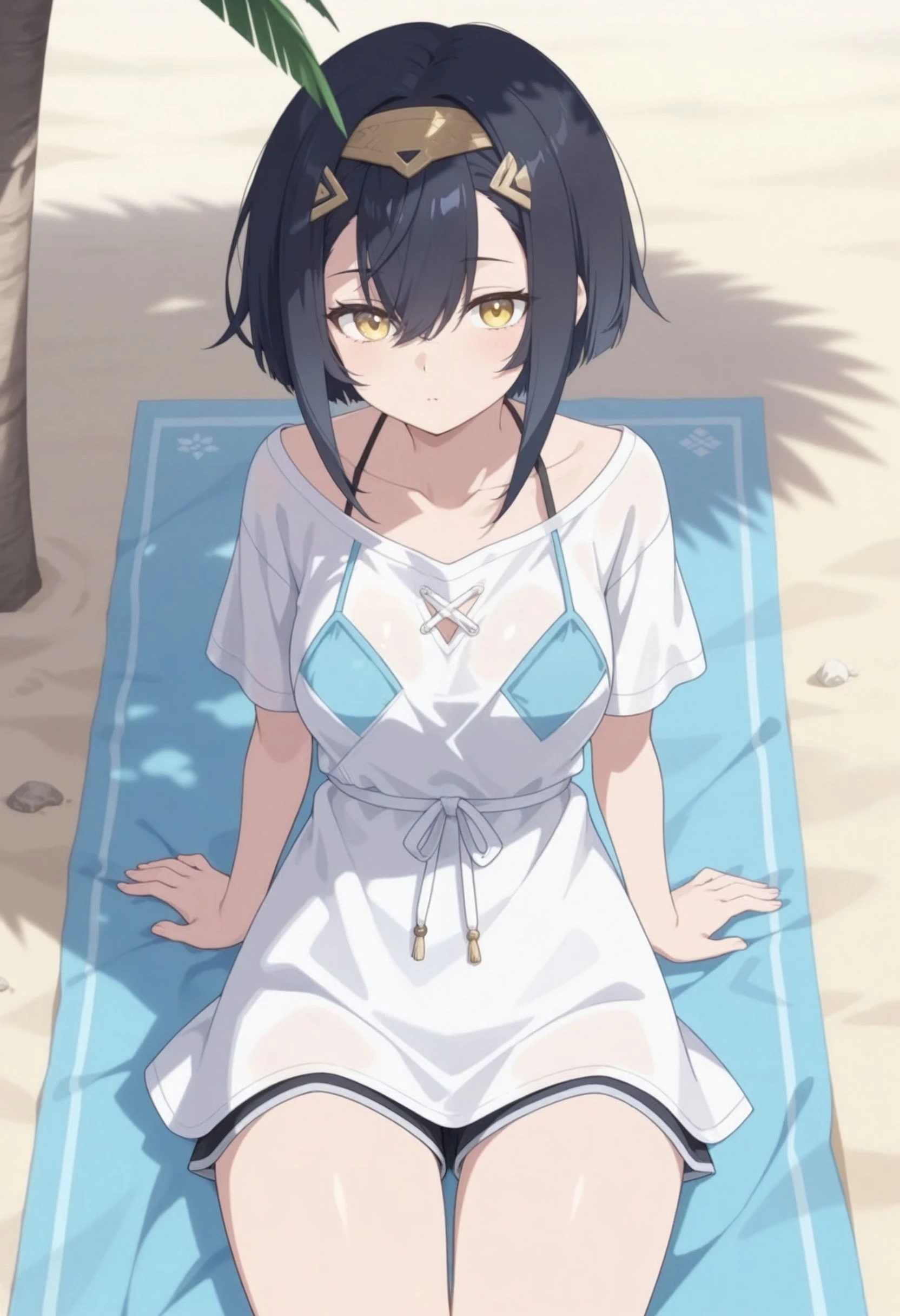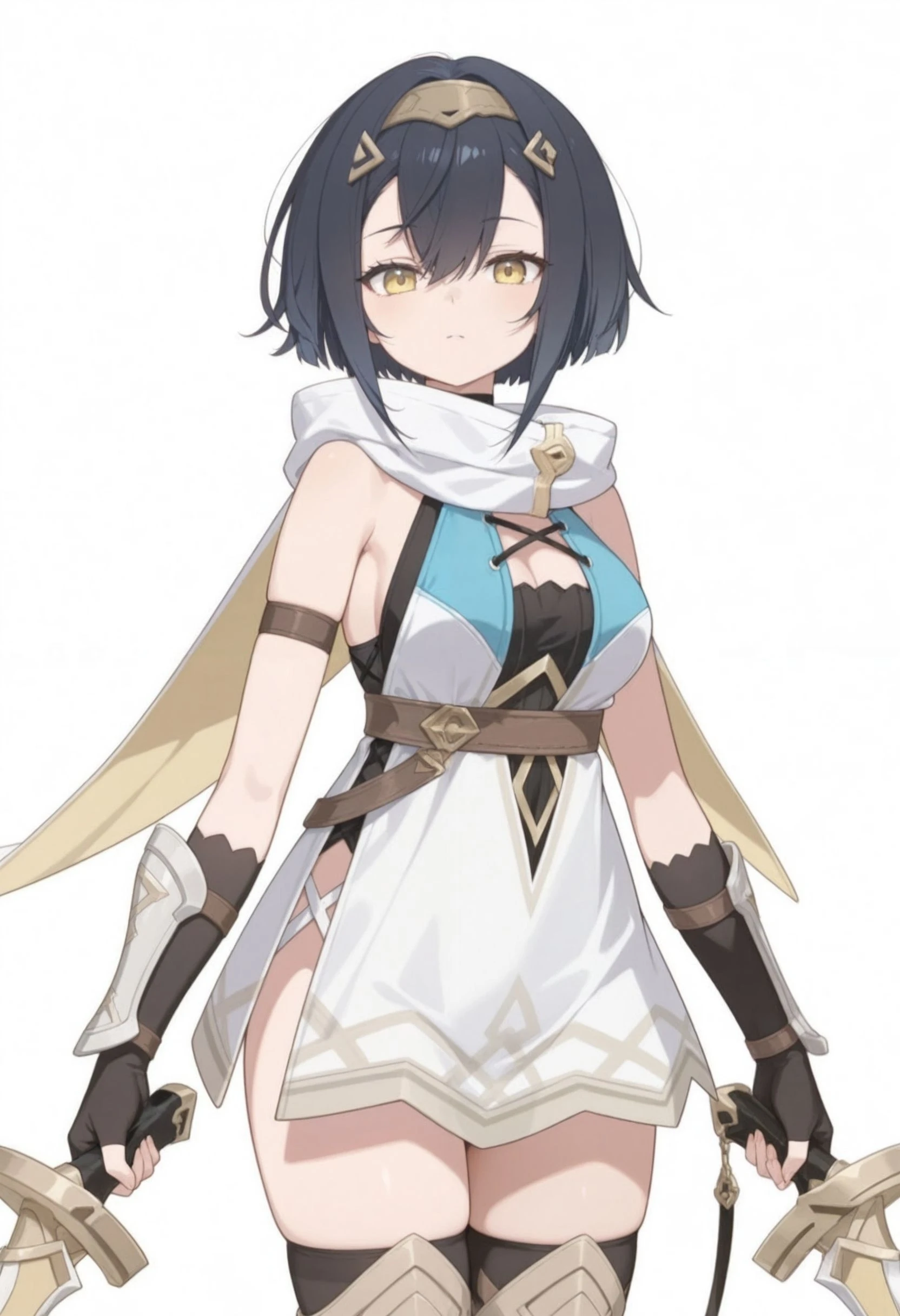 amber_\(stella_sora\), stllsrmbr, black hair, ???????, crossed bangs, hair between eyes, ??????????????, short dress, short hair, sidelocks, yellow eyes, bangs, <lora:stella_sora_amber_illustrious:0.8>Description